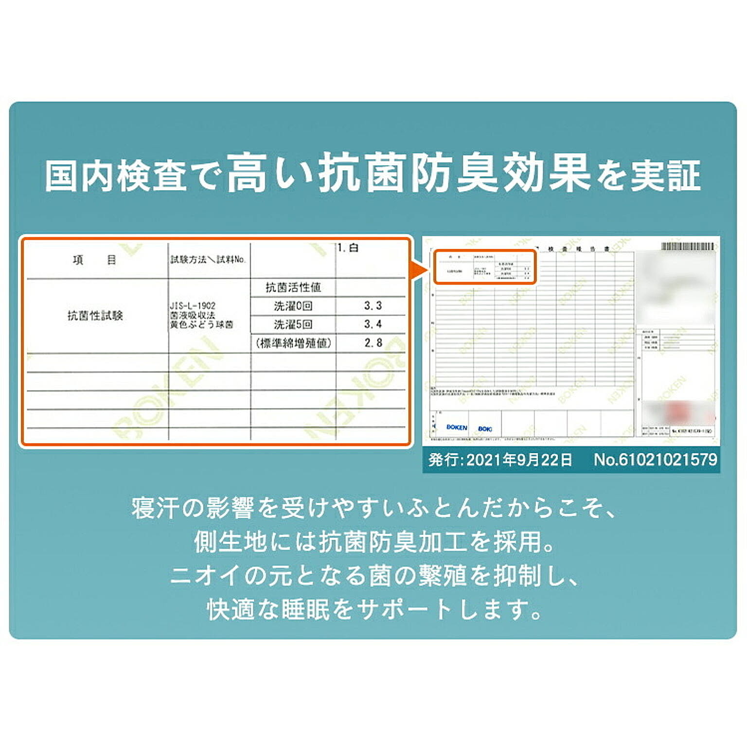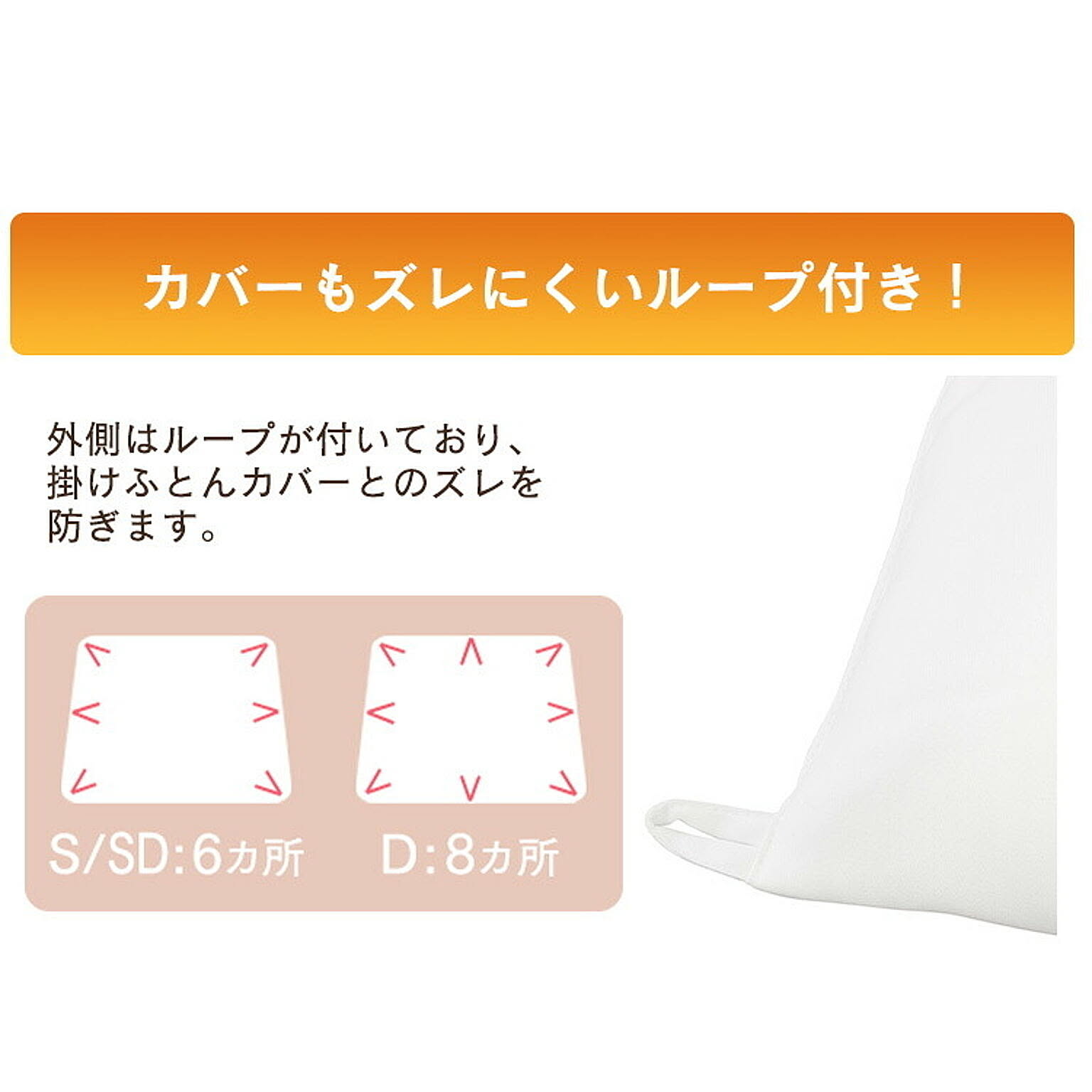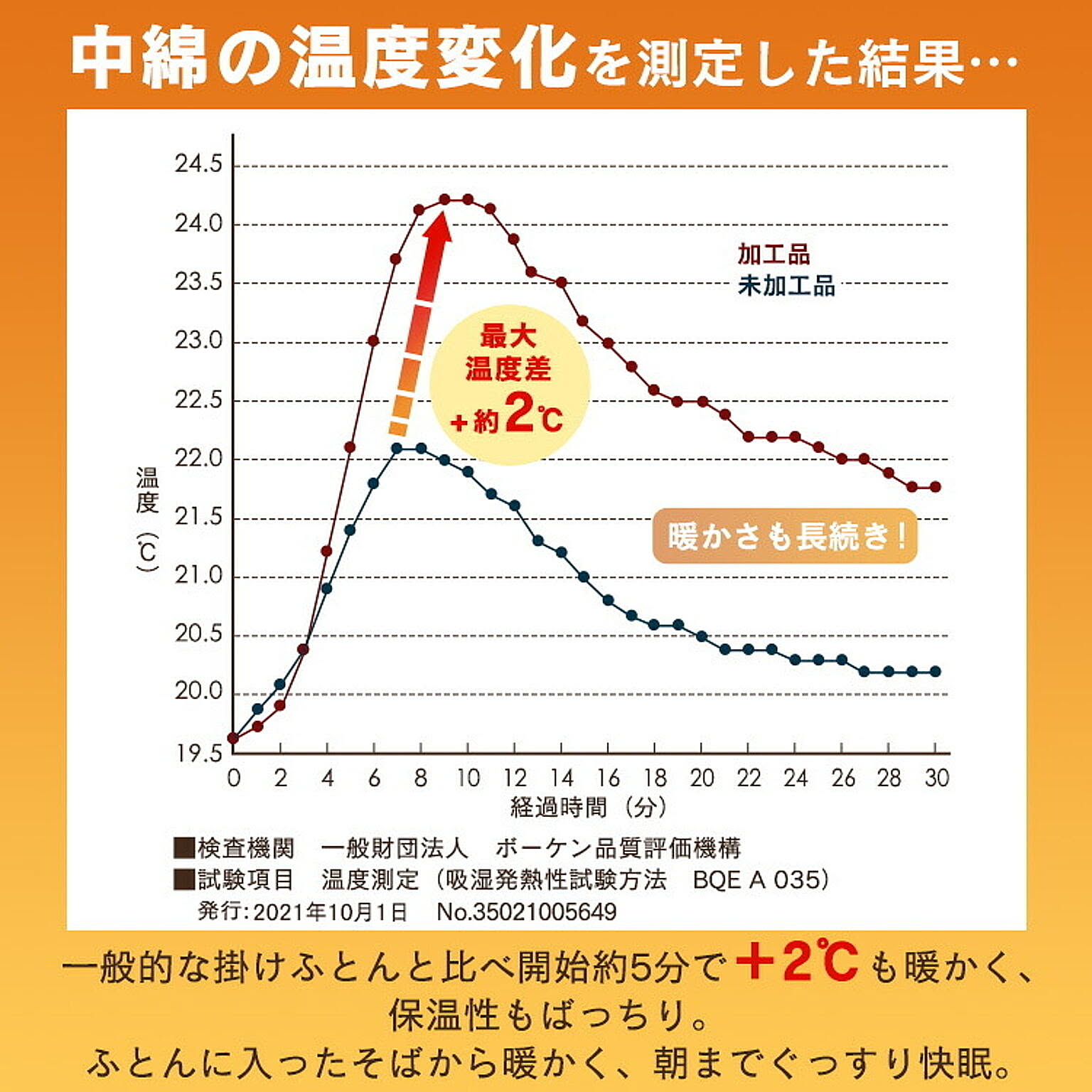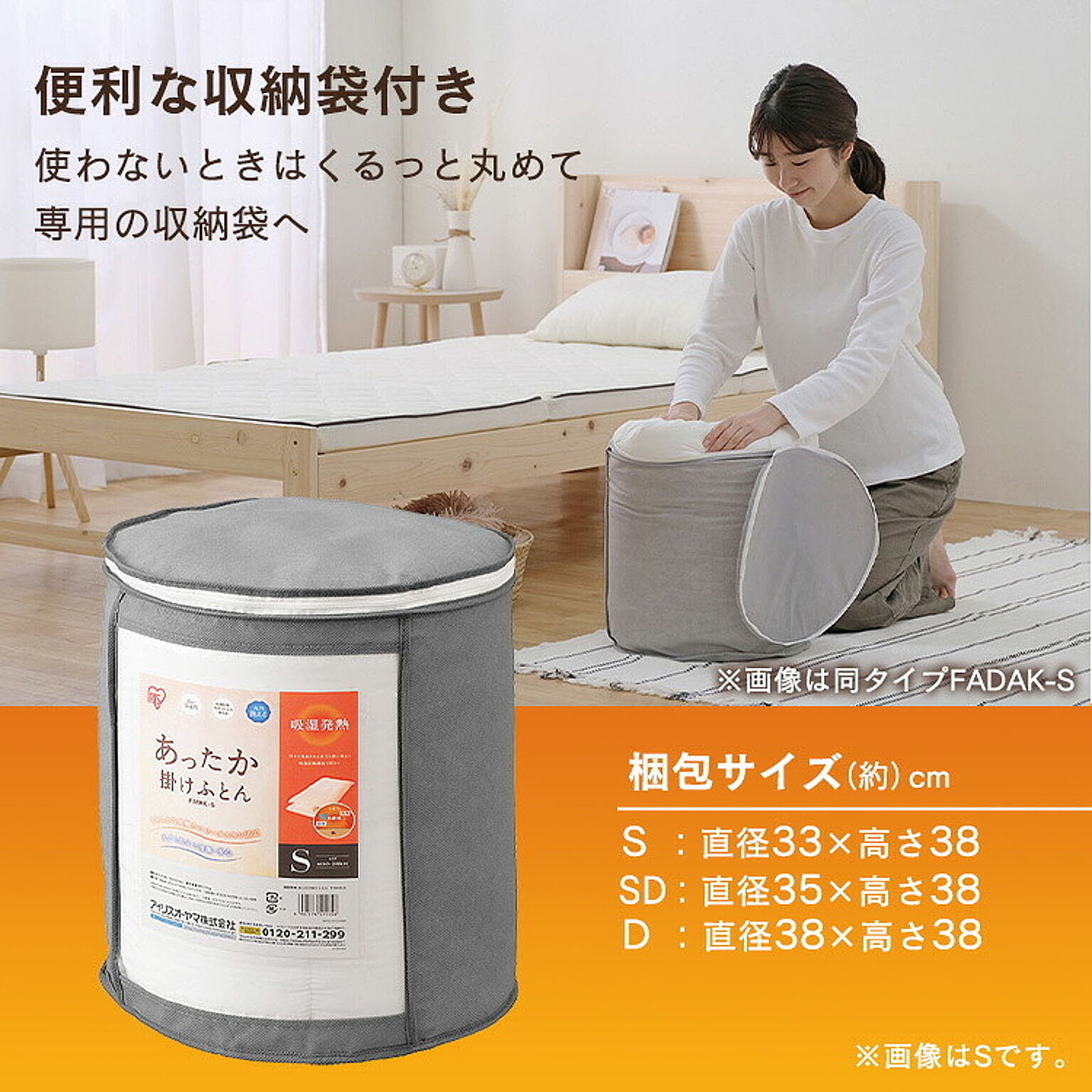 体から発散される水分を熱に変える保温性の高い掛けふとんです。寝汗を吸って発熱、吸湿発熱機能。中綿には水分を吸収し熱に変える、吸湿発熱素材を採用。こもりがちな湿気を熱に変換し、寒い季節でも暖かく快適に過ごせます。ご家庭の洗濯機で丸洗いOK!天日干しだけでは落としきれない汚れもすっきり洗浄。自宅で洗えるので、いつでも清潔にお使いいただけます。※洗濯機を使用する場合、洗濯ネットを使用し、洗濯力の弱め設定でご利用ください。湿気を効率よく熱に変換する放射線状キルト加工を採用。6ヶ所のループ付きでカバーもずれにくい。便利な収納袋付き。使わないときはくるっと丸めて専用の収納袋へ。●商品サイズ(cm)幅約170×奥行約210●充填量約1700g●材質側生地:ポリエステル85%、コットン15%詰め物:ポリエステル70%、レーヨン30%側生地加工:ピーチスキン●洗濯表示本製品は丸洗いできますが、洗濯機を使用する場合、洗濯ネットを使用し、洗濯力の弱め設定で洗ってください。