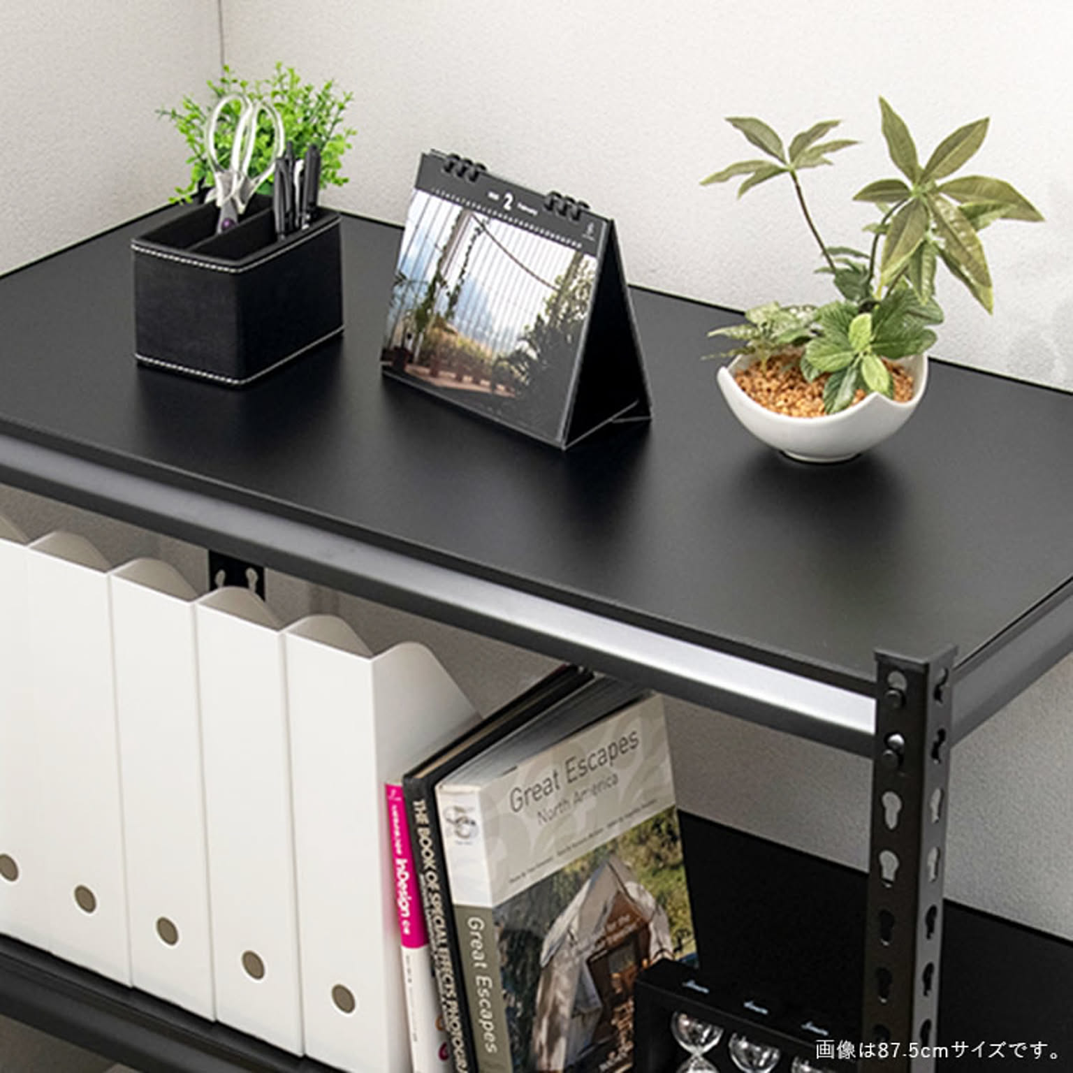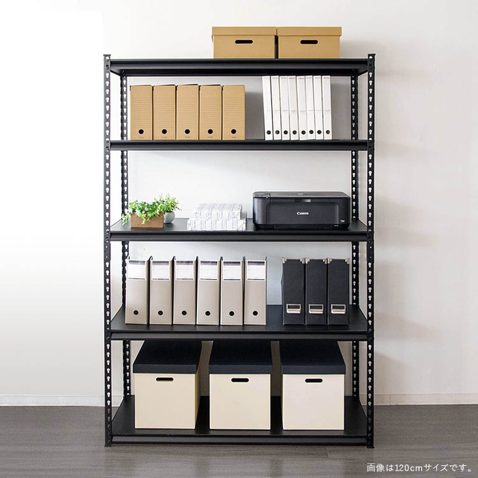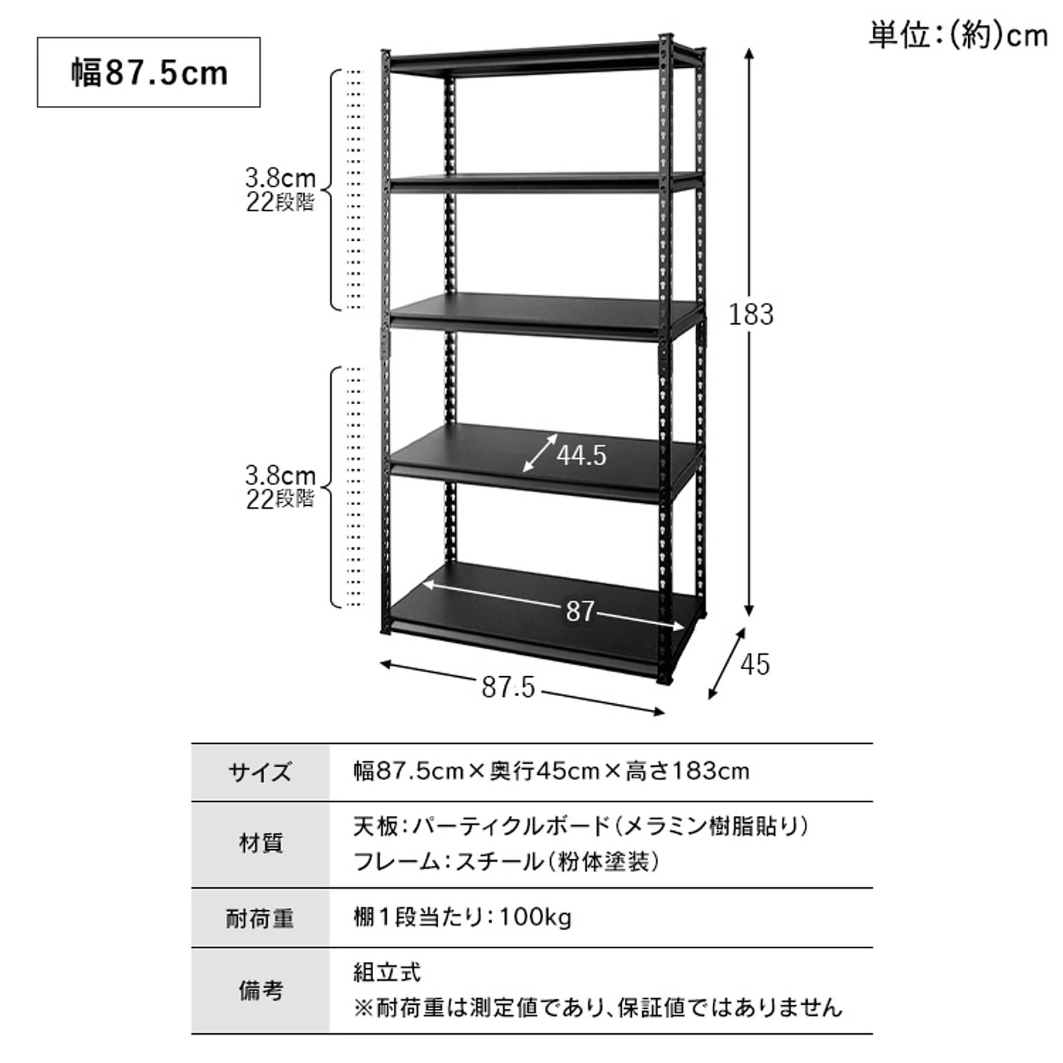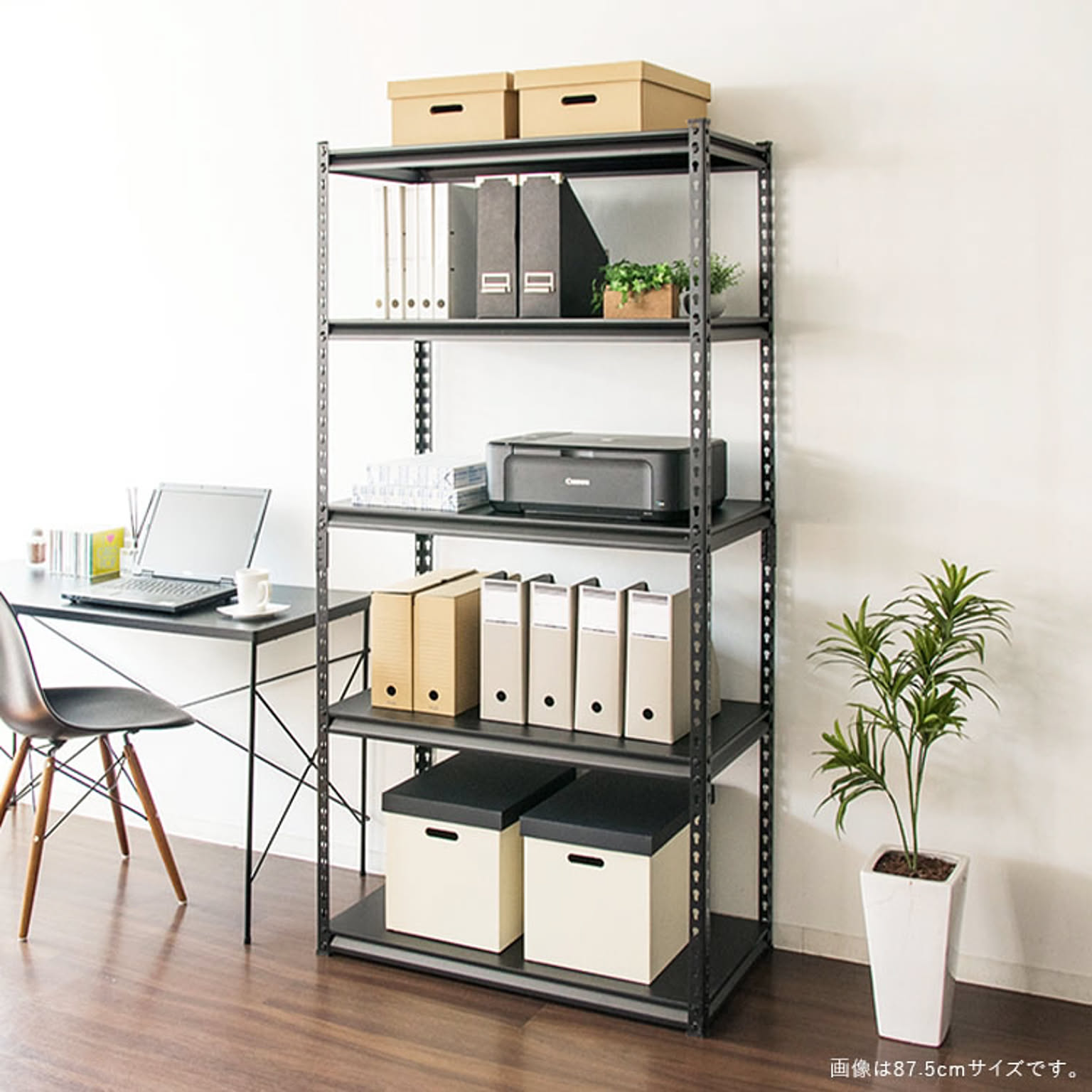 お好みの位置に設置できる5枚の可動棚が付いたスチールラック。 デスクサイドに置けばファイルや書類、プリンターなどオフィス周りに必要なものをまとめて収納できます。 カラーはブラック、ホワイトの2カラーからお選びいただけます。 ●商品サイズ(cm) 幅約87.5×奥行約45×高さ約183 ●商品重量 約21.28kg ●耐荷重 棚1段あたり100kg ※耐荷重は測定値であり保証値ではありません。 ●材質 フレーム:スチール(粉体塗装) 棚板:パーティクルボード(メラミン加工) ●組み立て式