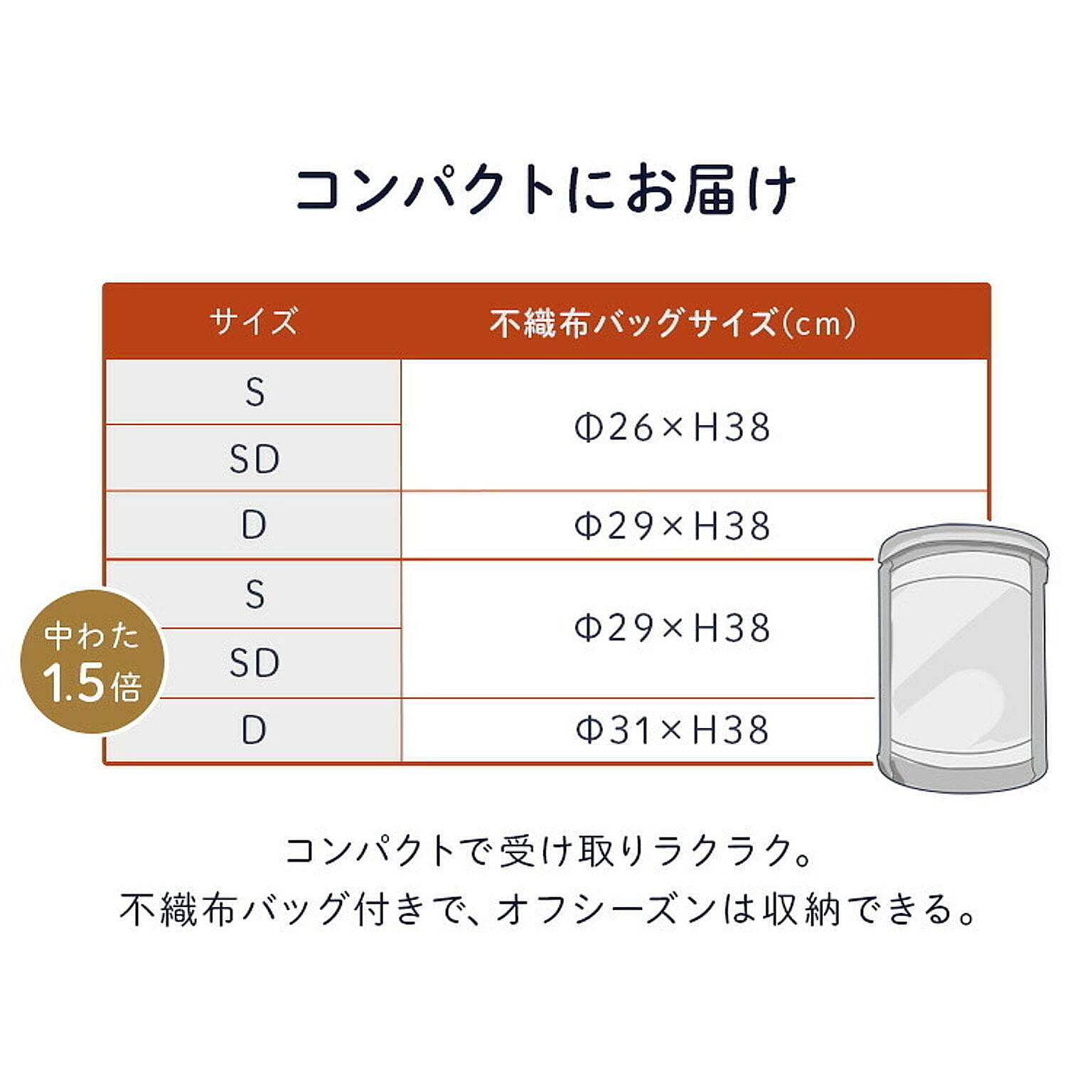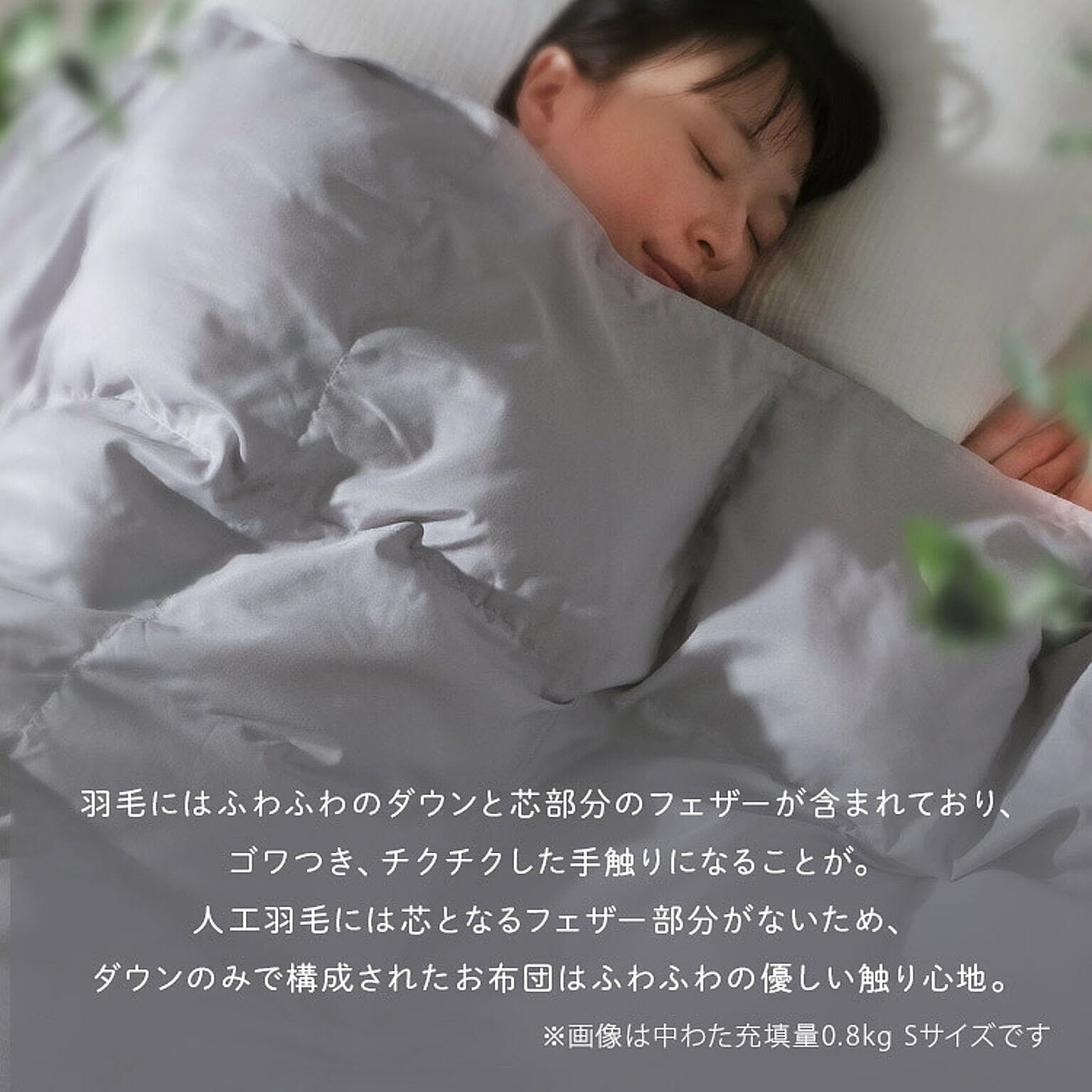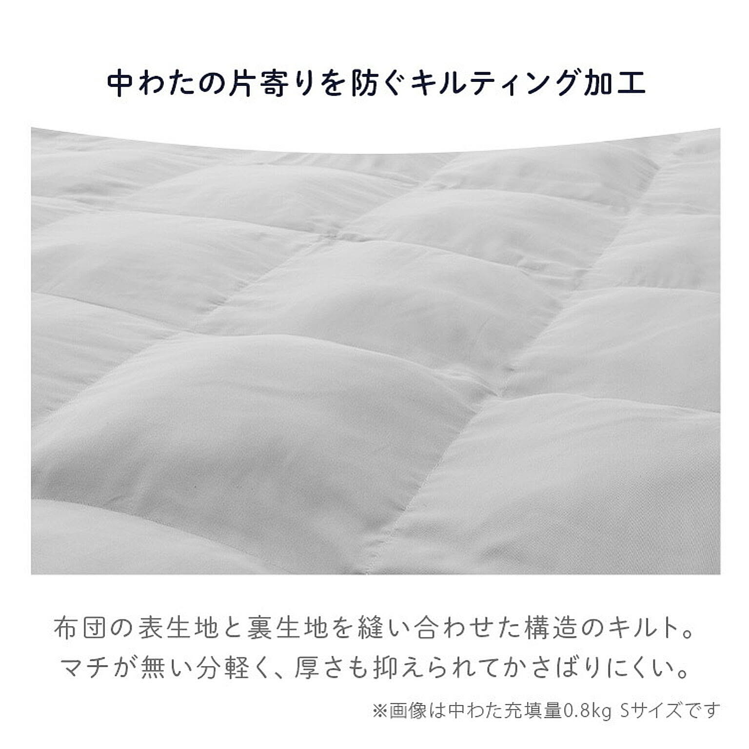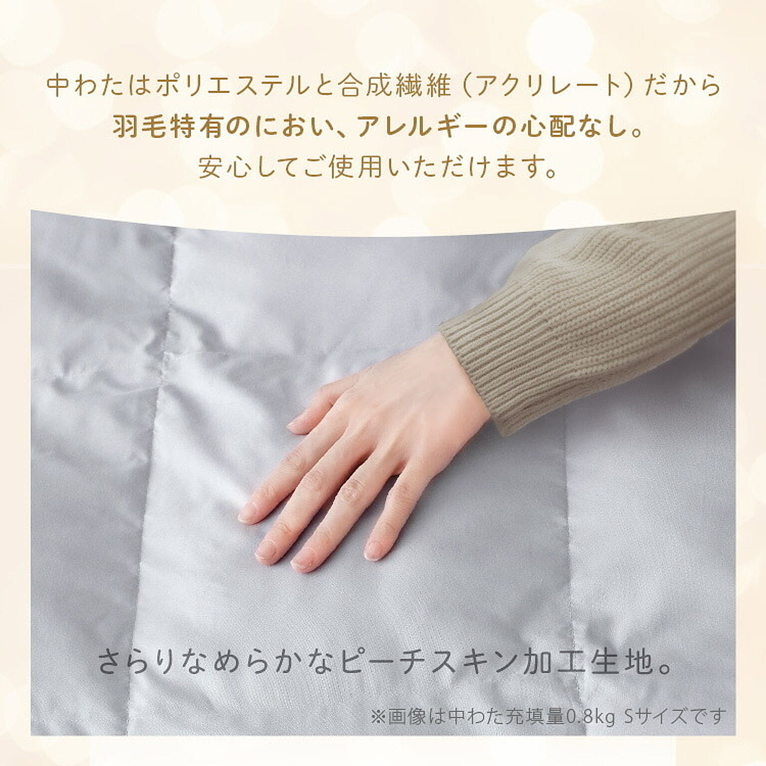 あたたかい眠りをサポートする、人工羽毛を使用した掛け布団“セミダブルサイズ(約170×210cm)”の中わた増量タイプ。【吸湿発熱:汗などの水分が繊維に吸着することで発熱する】機能付きの中わたを使用!さらに中わたには【消臭加工】も施されているから、汗などの気になるニオイも防ぎます。側生地は【ピーチスキン加工生地】だから、手触りもさらりとなめらか。【手洗い洗濯可能】で清潔も保ちやすい。より快適な睡眠のため【キルティング加工:中わたの片寄りを防ぐ】と【カバーと布団を留めるループ付き:布団カバーのズレを防ぐ】仕様なのも嬉しい!●商品サイズ(cm)幅約170×奥行約210(セミダブル)●質量本体:約1.96kg詰め物(中わた)充填量:約1.3kg●組成側生地:ポリエステル100%詰め物(中わた):ポリエステル70%、合成繊維(アクリレート系)30%●洗濯表示・本来の用途以外に使用しないでください。・本製品は羽毛を模した形状のわたを使用しています。その為通常のわたを用いた布団に比べ、洗濯の際にわたが片寄る場合がありますので、以下の点[※1、2]にご注意ください。[※1:もみ洗いは避け、押し洗いしてください。/※2:洗濯後は放置せず、形を整えてただちに干してください。]・洗濯後にわたが片寄った場合は乾燥後わたを手でほぐし軽くたたいてください。・発熱特性のある中わたはピンク色をしていますが素材本来の色です。安心してお使いください。・中性洗剤を使用してください。・小さな穴でも中わたか吹き出しますので、針や安全ピンなどをカバーに取り付けないでください。・ふとん本体の劣化や汚れを防ぐためにカバ-を掛けて使用してください。・この製品の性質上、長時間日光に当てると変色する恐れがありますので、ご注意ください。・高温多湿の場所での使用、保管を避けてください。・中わたの吹き出しの原因となりますので、粘着性のある掃除用具、掃除機は使用しないでください。・ふとんの端部分を踏んだりしますと、滑る場合がありますので、十分にこ注意ください。・強い摩擦や湿気により、色落ち、色移りが発生する場合がありますので、ご主意ください。・火気に近づけないでください。