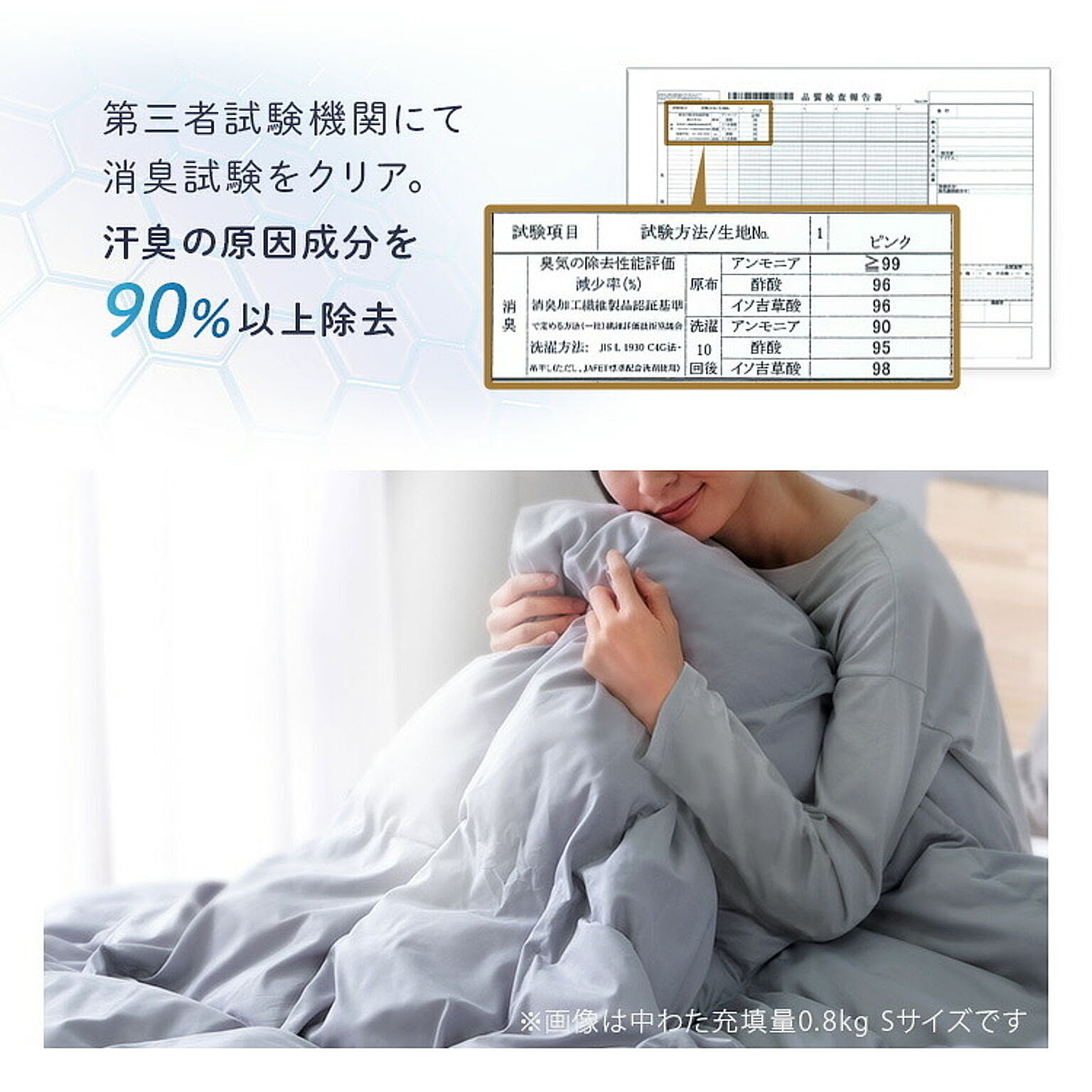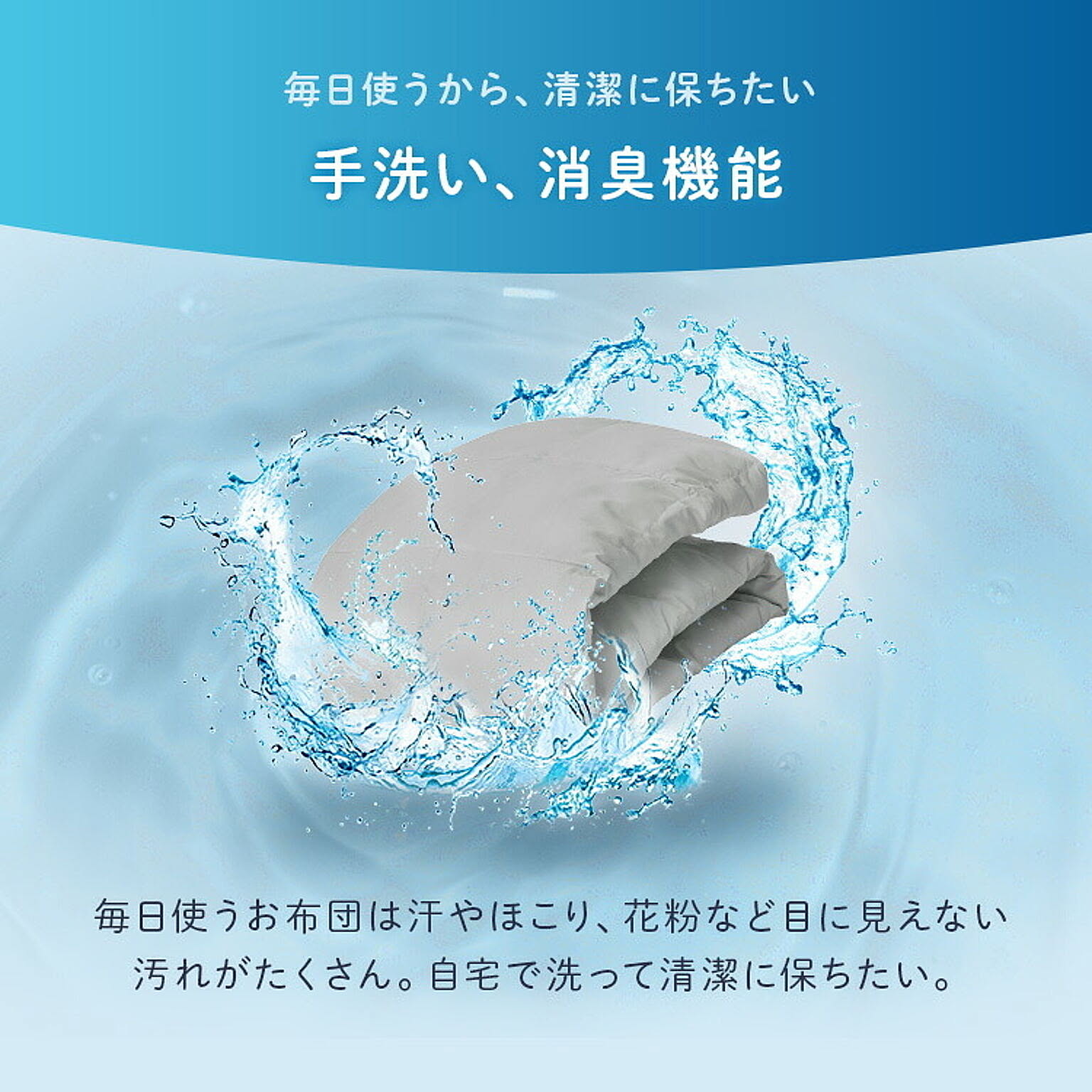 あたたかい眠りをサポートする、人工羽毛を使用した掛け布団“シングルサイズ(約150×210cm)”。【吸湿発熱:汗などの水分が繊維に吸着することで発熱する】機能付きの中わたを使用!さらに中わたには【消臭加工】も施されているから、汗などの気になるニオイも防ぎます。側生地は【ピーチスキン加工生地】だから、手触りもさらりとなめらか。【手洗い洗濯可能】で清潔も保ちやすい。より快適な睡眠のため【キルティング加工:中わたの片寄りを防ぐ】と【カバーと布団を留めるループ付き:布団カバーのズレを防ぐ】仕様なのも嬉しい!●商品サイズ(cm)幅約150×奥行約210(シングル)●質量本体:約1.37kg詰め物(中わた)充填量:約0.8kg●組成側生地:ポリエステル100%詰め物(中わた):ポリエステル70%、合成繊維(アクリレート系)30%●洗濯表示・本来の用途以外に使用しないでください。・本製品は羽毛を模した形状のわたを使用しています。その為通常のわたを用いた布団に比べ、洗濯の際にわたが片寄る場合がありますので、以下の点[※1、2]にご注意ください。[※1:もみ洗いは避け、押し洗いしてください。/※2:洗濯後は放置せず、形を整えてただちに干してください。]・洗濯後にわたが片寄った場合は乾燥後わたを手でほぐし軽くたたいてください。・発熱特性のある中わたはピンク色をしていますが素材本来の色です。安心してお使いください。・中性洗剤を使用してください。・小さな穴でも中わたか吹き出しますので、針や安全ピンなどをカバーに取り付けないでください。・ふとん本体の劣化や汚れを防ぐためにカバ-を掛けて使用してください。・この製品の性質上、長時間日光に当てると変色する恐れがありますので、ご注意ください。・高温多湿の場所での使用、保管を避けてください。・中わたの吹き出しの原因となりますので、粘着性のある掃除用具、掃除機は使用しないでください。・ふとんの端部分を踏んだりしますと、滑る場合がありますので、十分にこ注意ください。・強い摩擦や湿気により、色落ち、色移りが発生する場合がありますので、ご主意ください。・火気に近づけないでください。