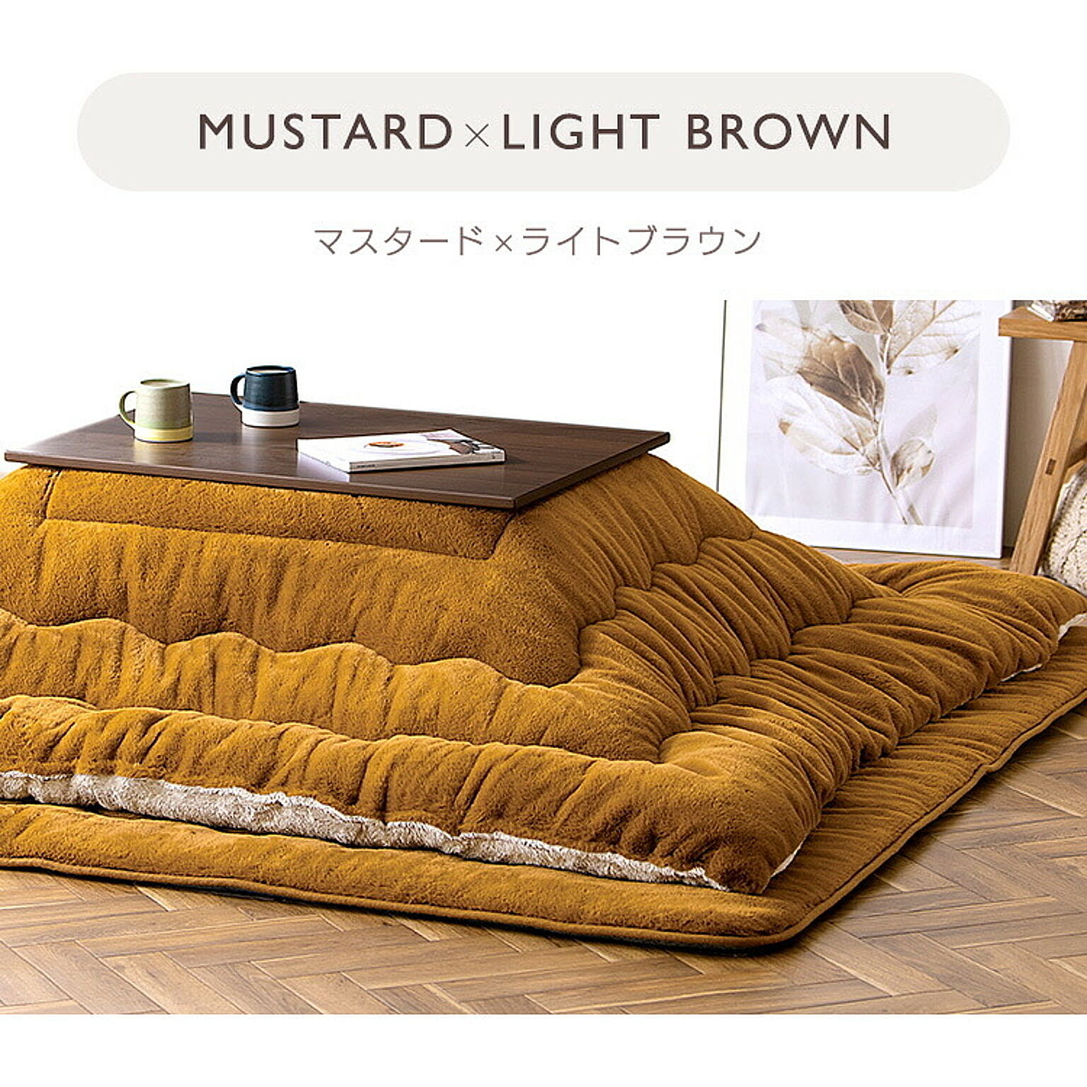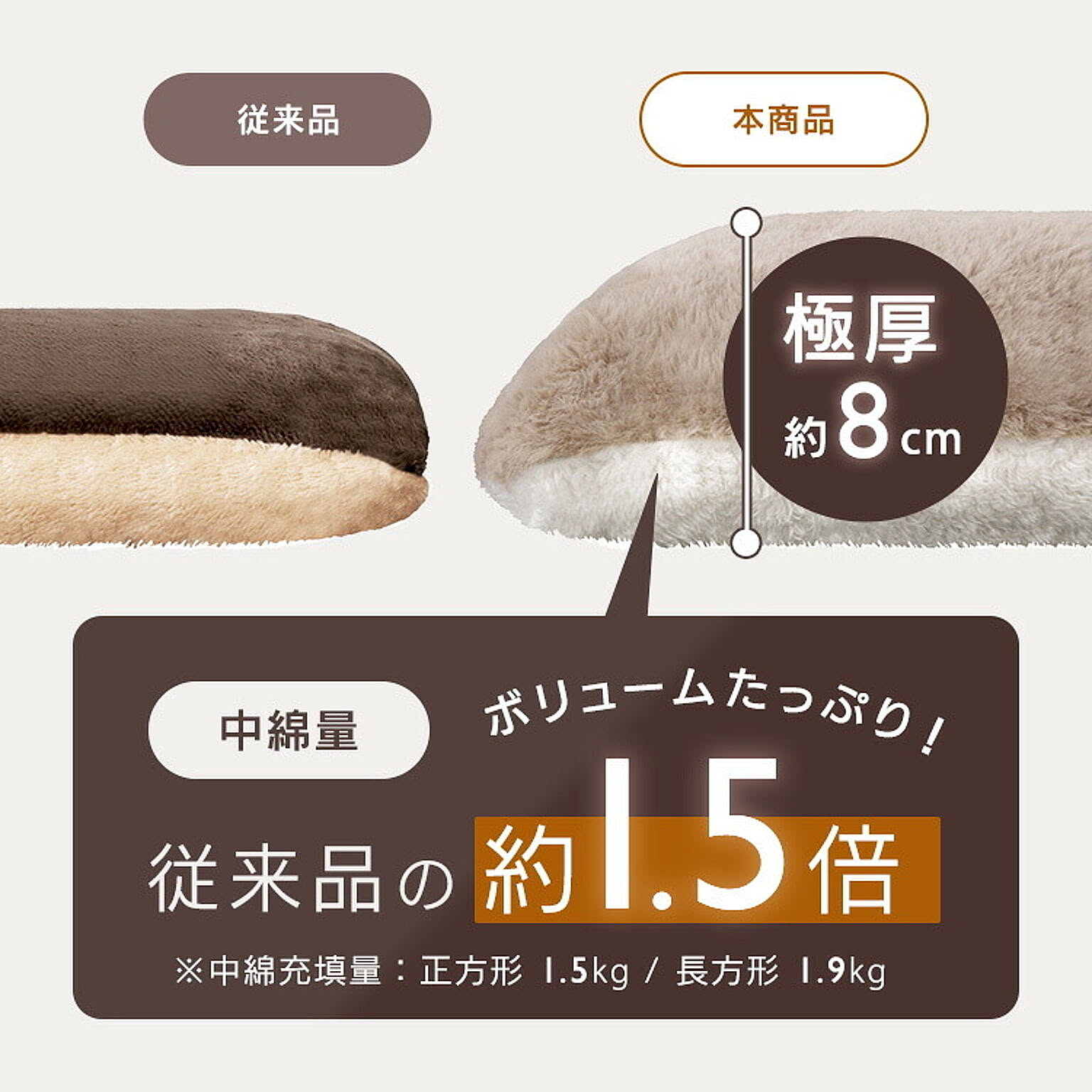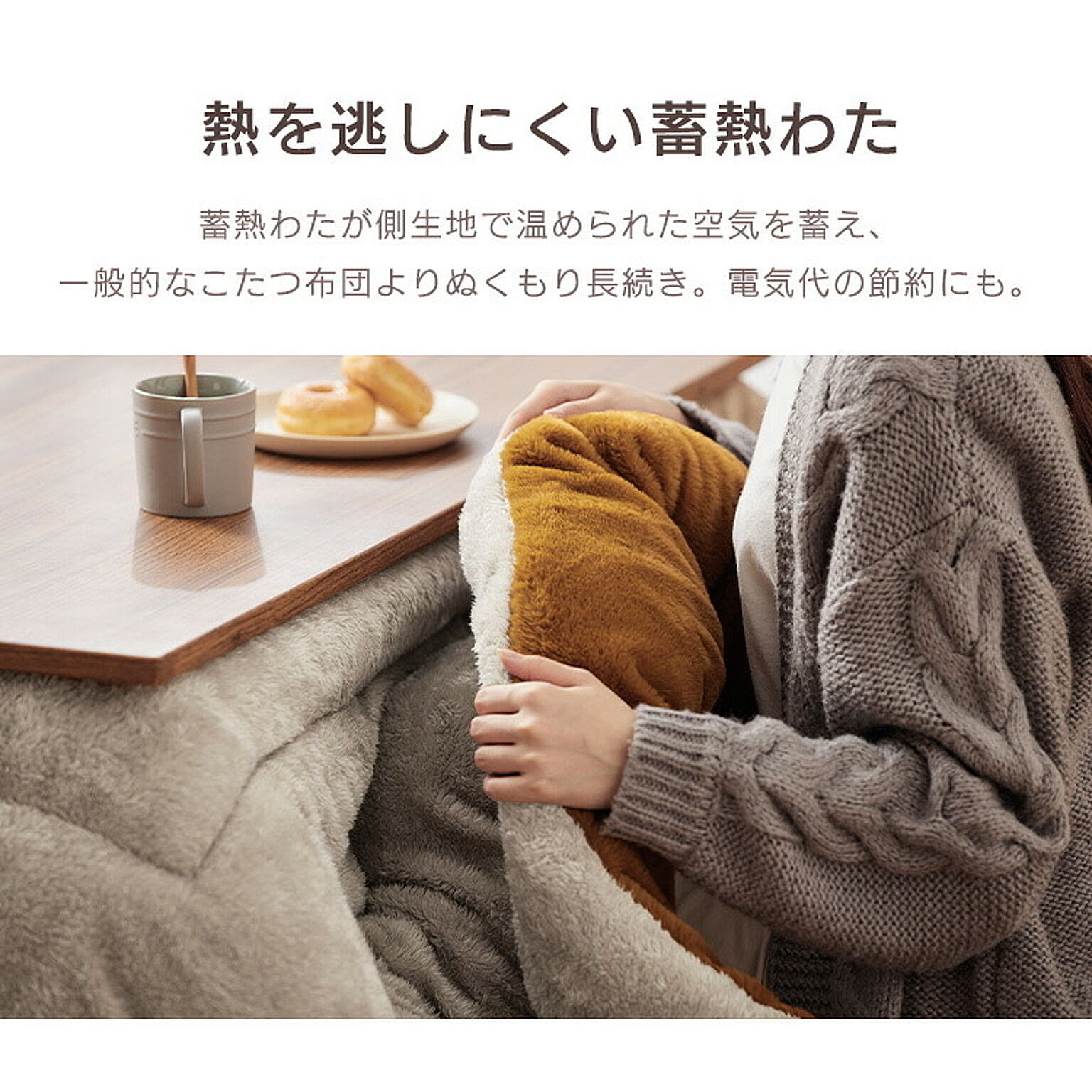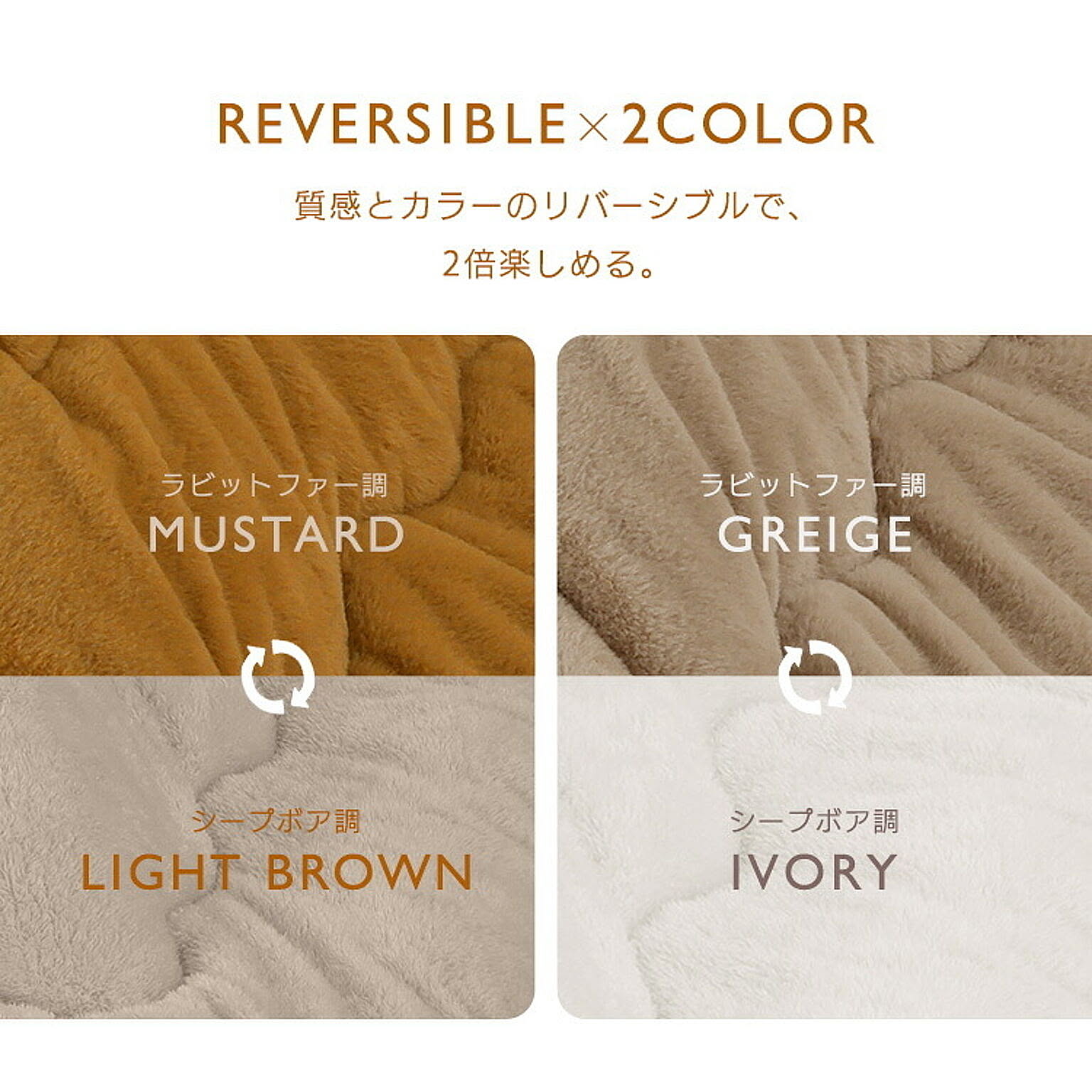 ボリュームたっぷりで、包み込まれるような肌ざわり。極厚こたつ掛け布団。◆驚きのボリューム感極厚!厚さ約8cm。◆リバーシブルタイプ質感とカラーのリバーシブルで、2倍楽しめる。☆マスタード(ラビットファー調)/ライトブラウン(シープボア調)☆グレージュ(ラビットファー調)/アイボリー(シープボア調)【ラビットファー調】ウサギの毛並みのような、きめ細かくふんわり柔らかなさわり心地。【シープボア調】羊の毛のようにモコモコでふわふわ。見た目も肌ざわりも温もりを感じる。◆あたたかさに包まれる吸湿発熱生地と蓄熱綿使用で暖かさ持続。◆いつでも清潔に使える抗菌防臭加工済み。ご家庭での手洗いが可能です。※こちらのページはこたつ掛け布団のみの販売です。●商品サイズ(cm)幅約190×奥行約190(正方形)●対応こたつサイズ(cm)約60〜80×60〜80●材質<表側>ポリエステル100%<裏側>毛羽:ポリエステル100% 地糸:ポリエステル60%、レーヨン40%<詰め物>ポリエステル100%●充填量約1.5kg●お手入れ方法手洗い可能※洗濯機や乾燥機は使用しないでください