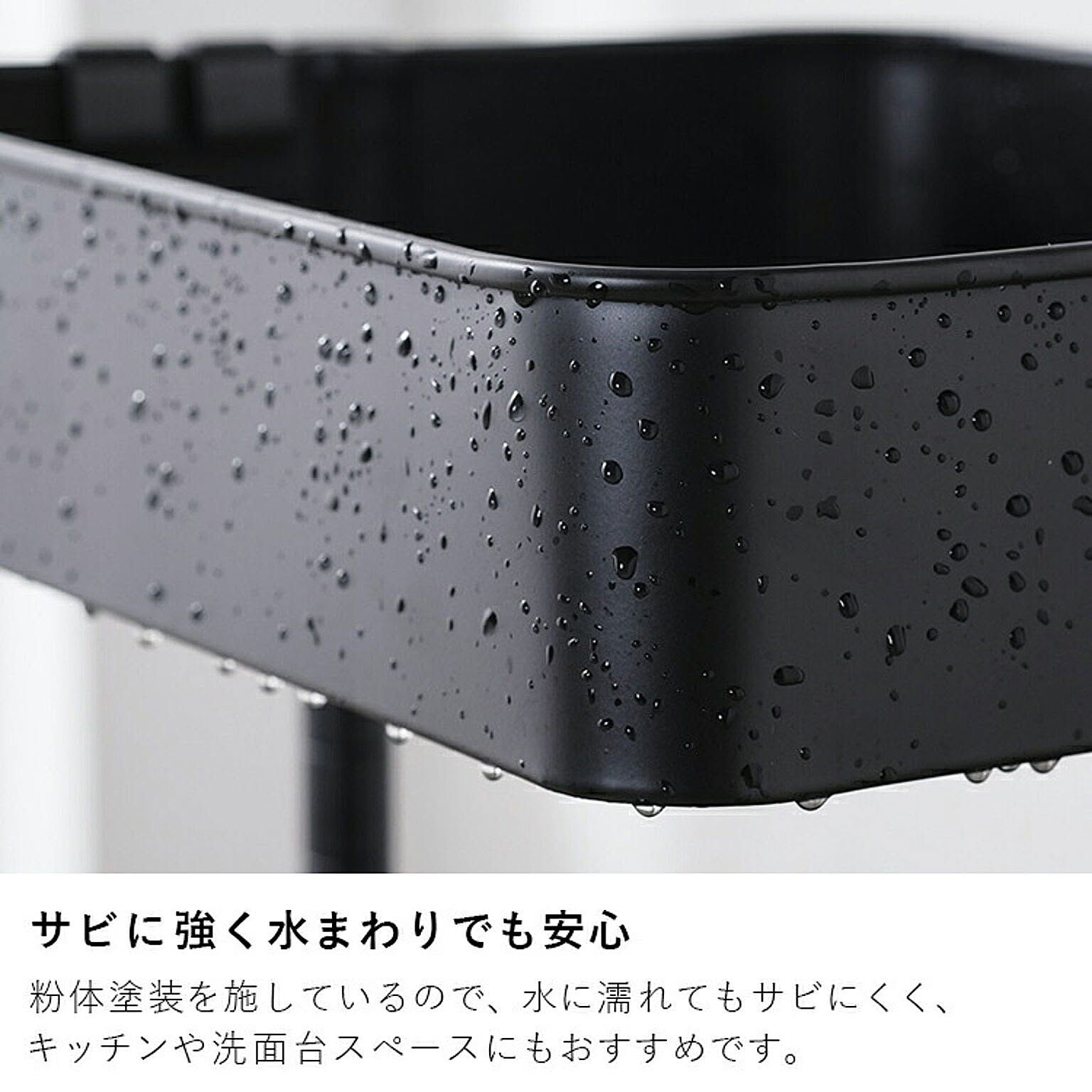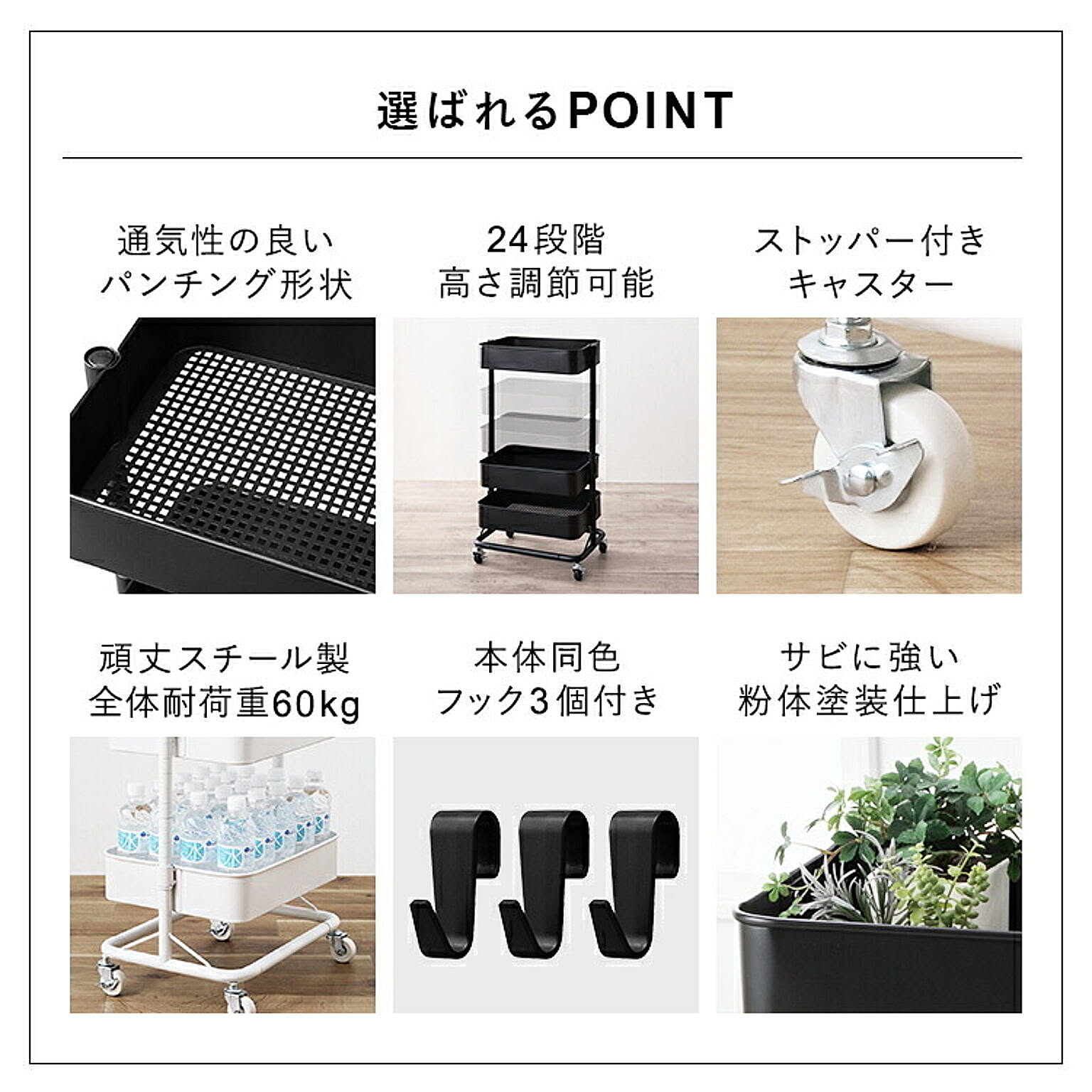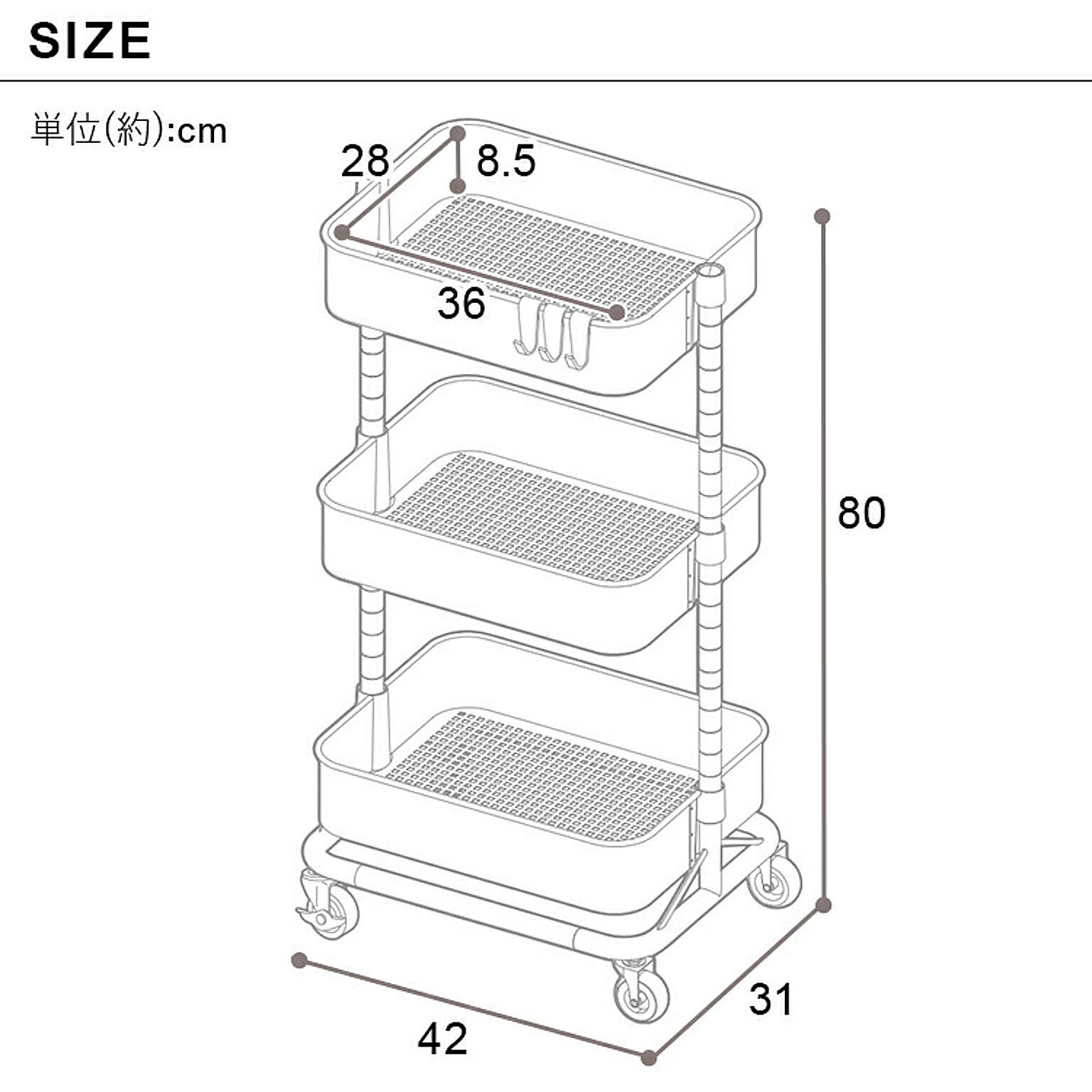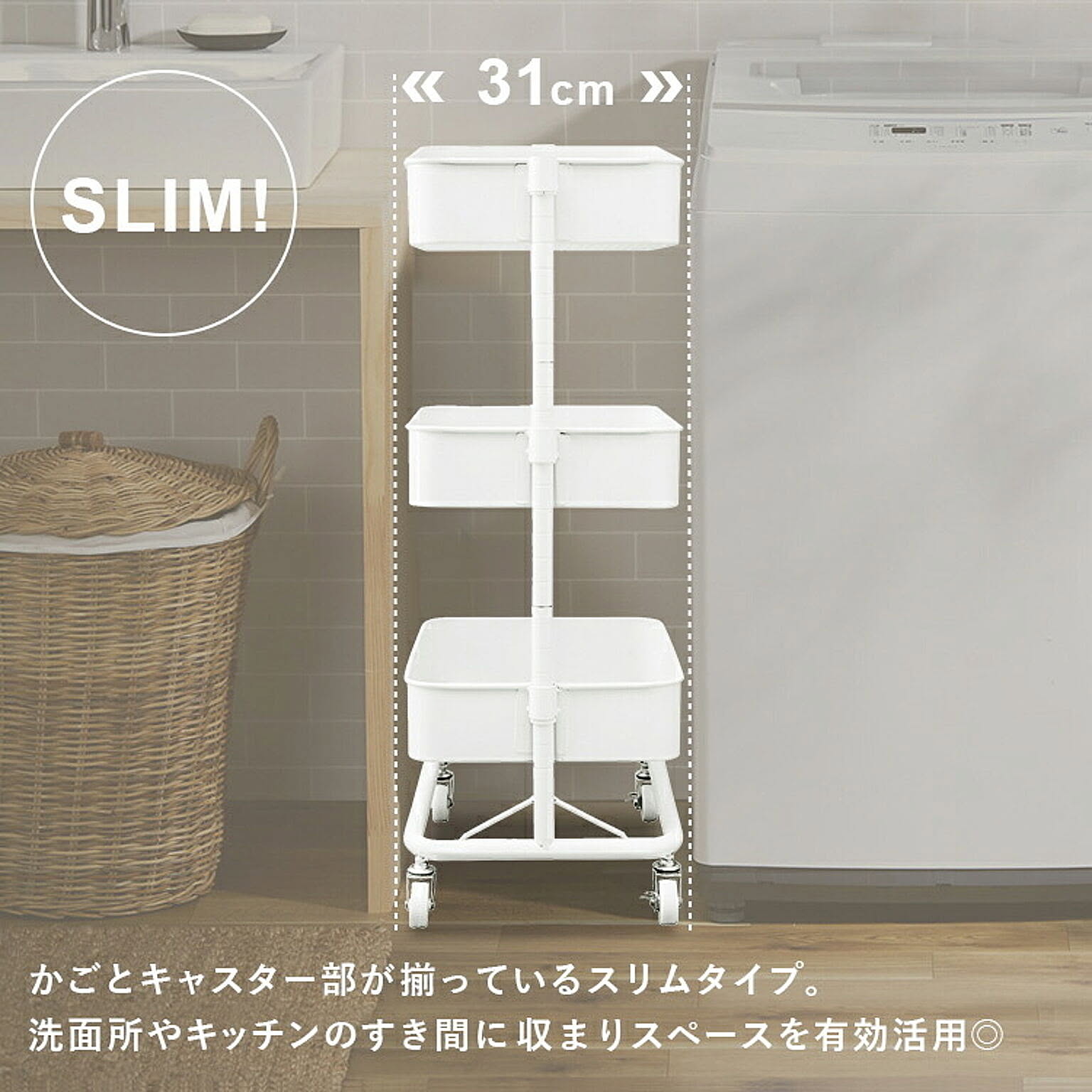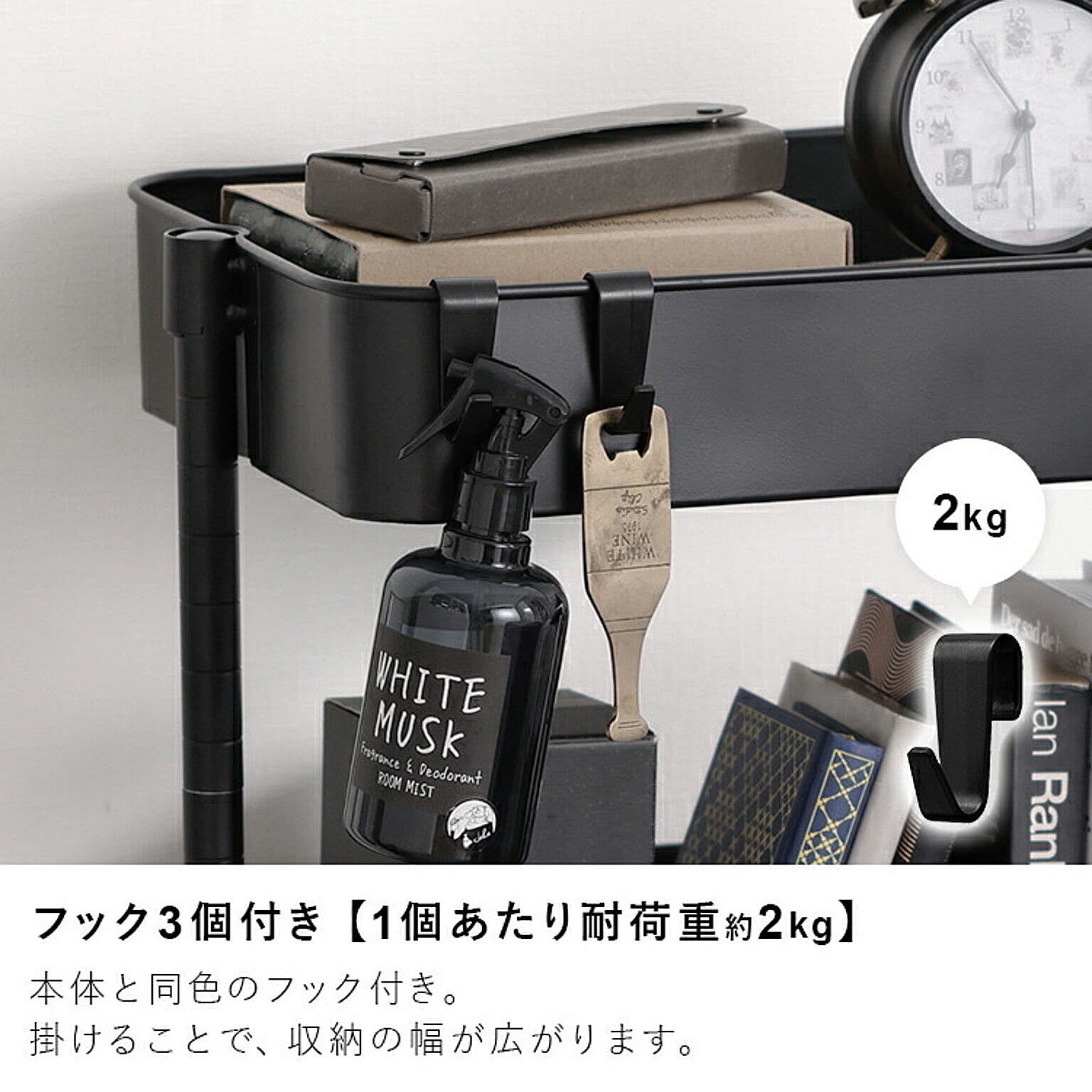 様々なシーンで大活躍!アイデア次第で使い道が広がります。頑丈なスチール製で変形しにくく、しっかり支えるので安心。奥行31cmのスリムタイプ。キッチンのすき間スペースなども有効的に活用できます。移動もスムーズなキャスター付き。また収納スペースを24段階調節できるので、小物から高さのあるものまで幅広く収納できます。1段当たりの耐荷重は約20kgあるので、ボトルなどの重たい物もOKです。★お客様組立★●商品サイズ(cm)幅約42×奥行約31×高さ約80●商品重量約5.95kg●材質本体/スチール(粉体塗装)フック/ABS樹脂キャスター/ポリプロピレン、ポリ塩化ビニル、鉄●耐荷重全体/60kg、カゴ1段あたり/20kg、フック1個あたり/2kg●カラーブラック、ホワイト