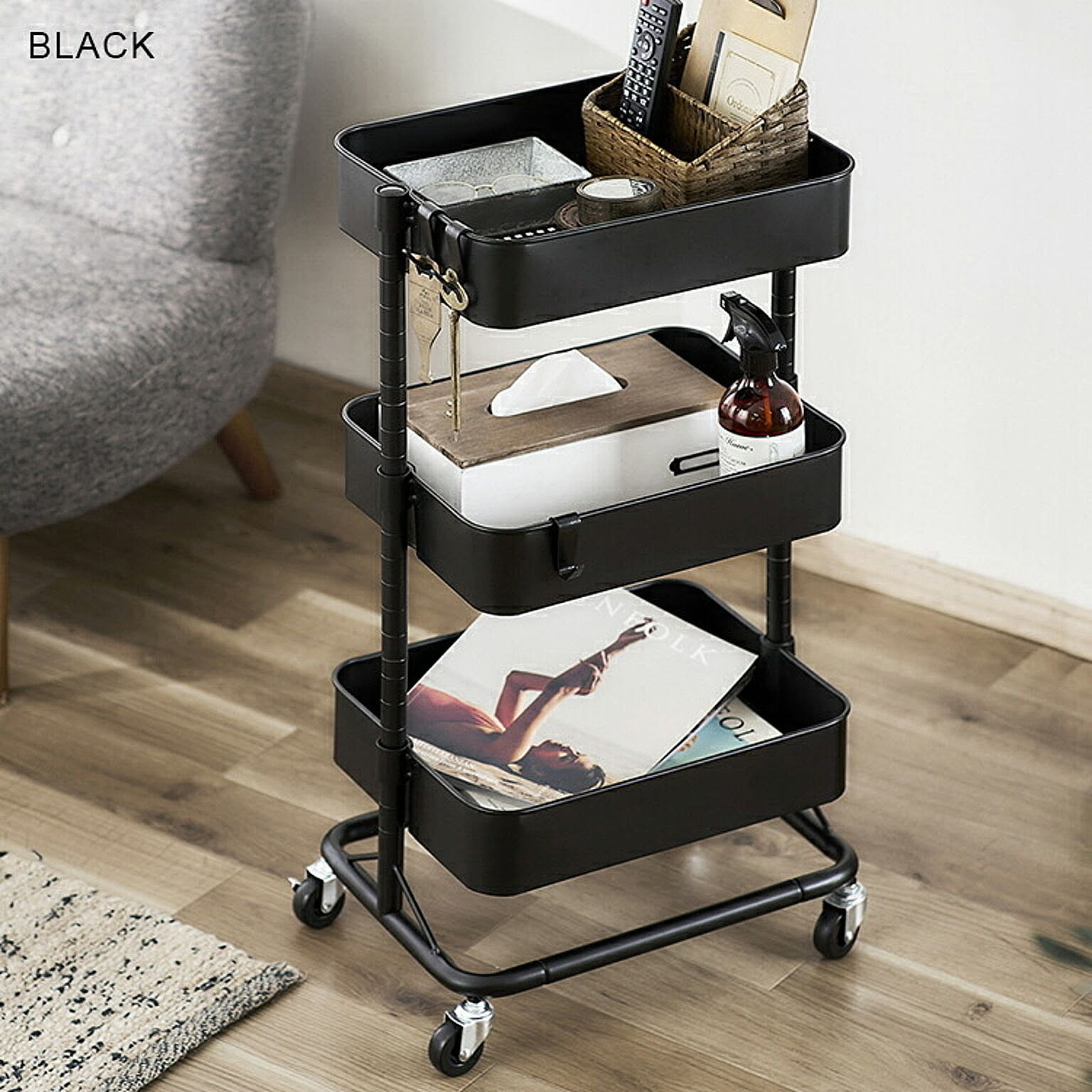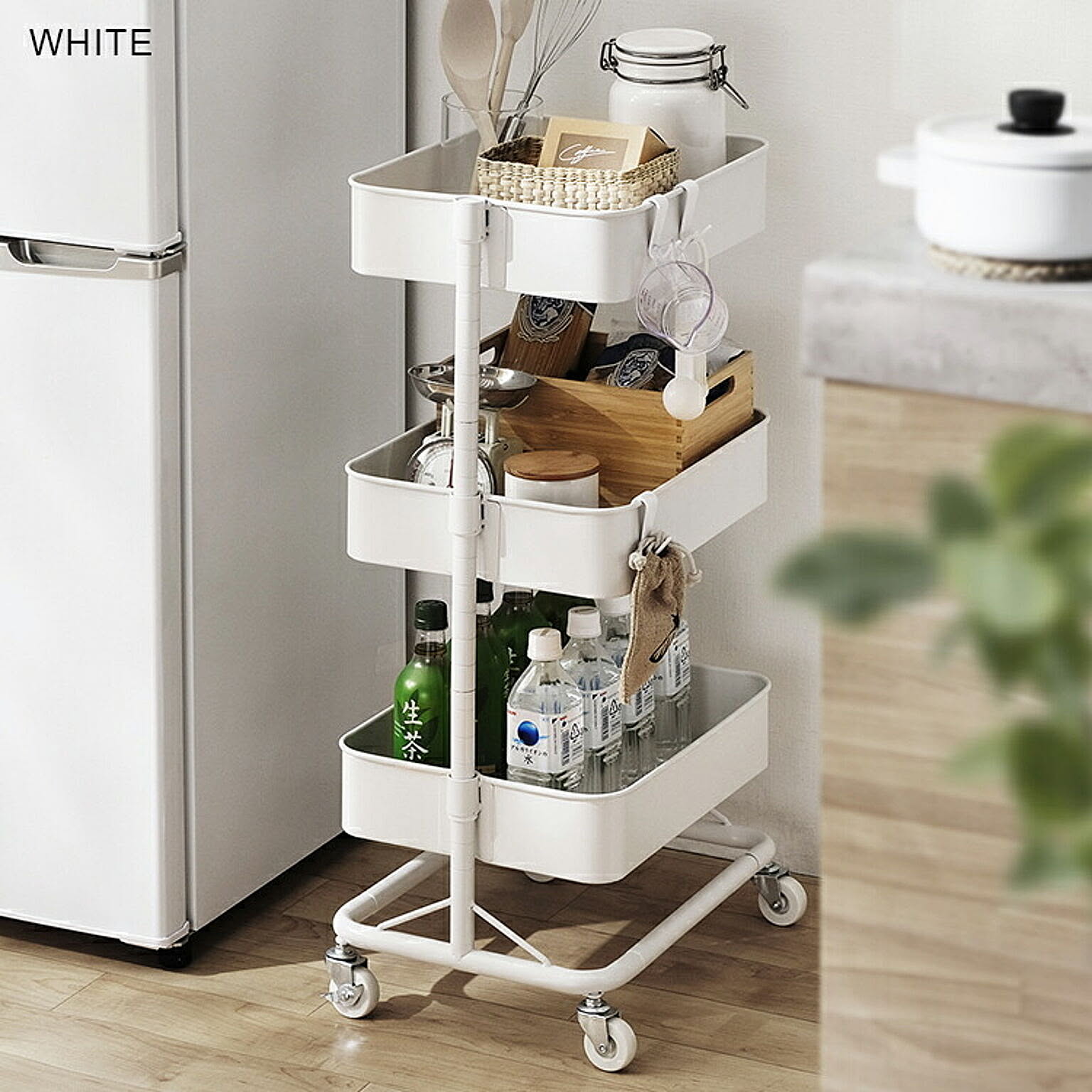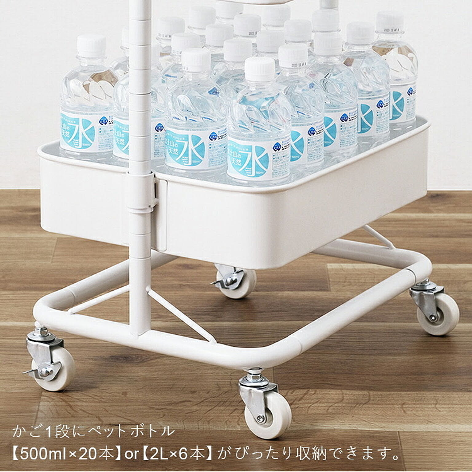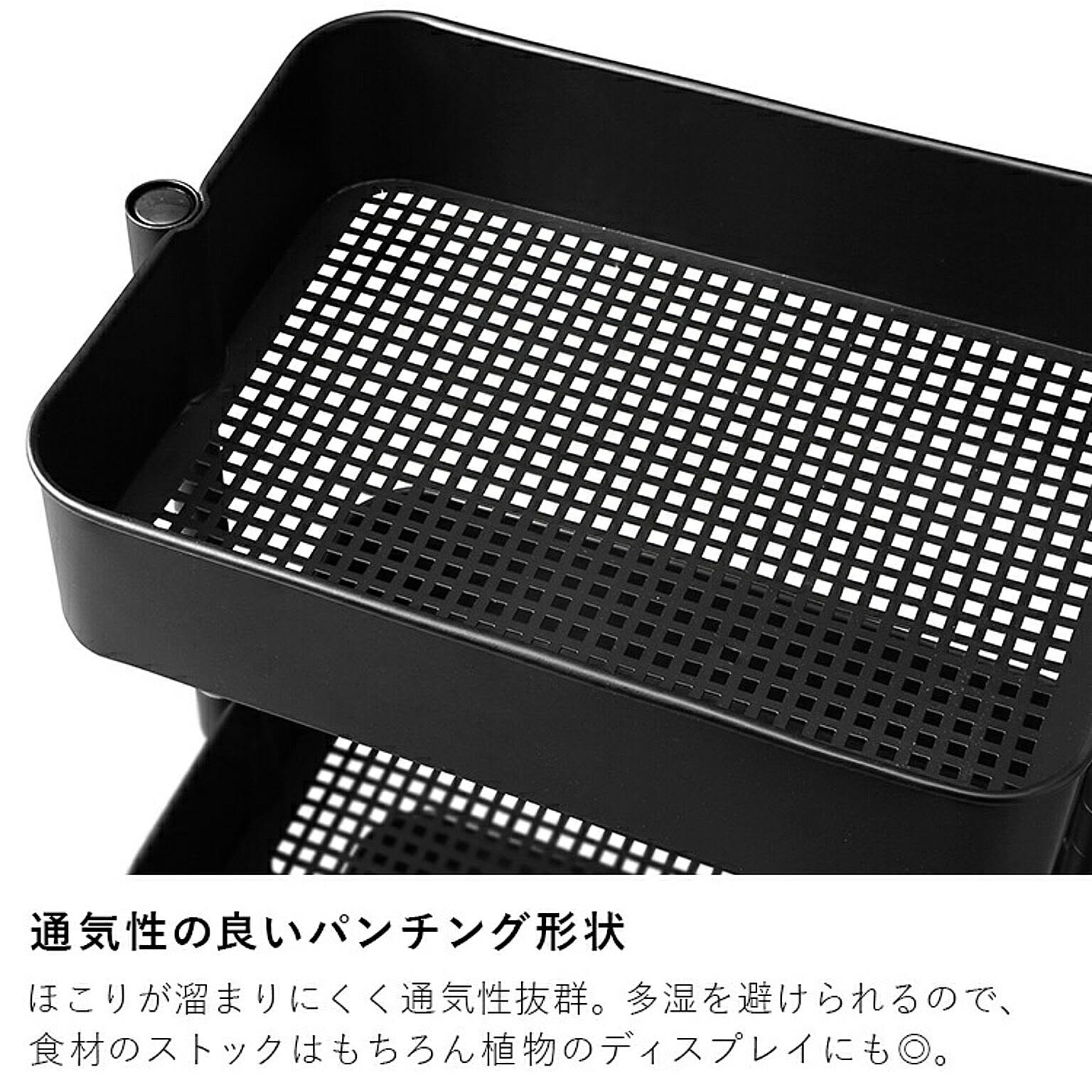 様々なシーンで大活躍!アイデア次第で使い道が広がります。頑丈なスチール製で変形しにくく、しっかり支えるので安心。奥行31cmのスリムタイプ。キッチンのすき間スペースなども有効的に活用できます。移動もスムーズなキャスター付き。また収納スペースを24段階調節できるので、小物から高さのあるものまで幅広く収納できます。1段当たりの耐荷重は約20kgあるので、ボトルなどの重たい物もOKです。★お客様組立★●商品サイズ(cm)幅約42×奥行約31×高さ約80●商品重量約5.95kg●材質本体/スチール(粉体塗装)フック/ABS樹脂キャスター/ポリプロピレン、ポリ塩化ビニル、鉄●耐荷重全体/60kg、カゴ1段あたり/20kg、フック1個あたり/2kg●カラーブラック、ホワイト