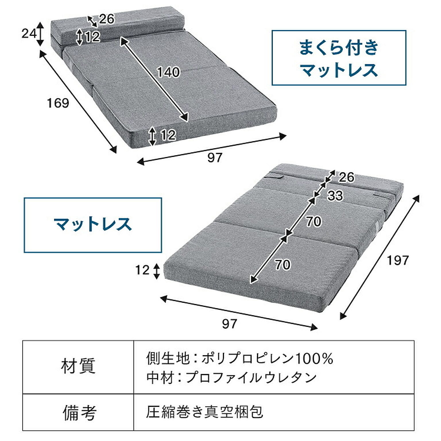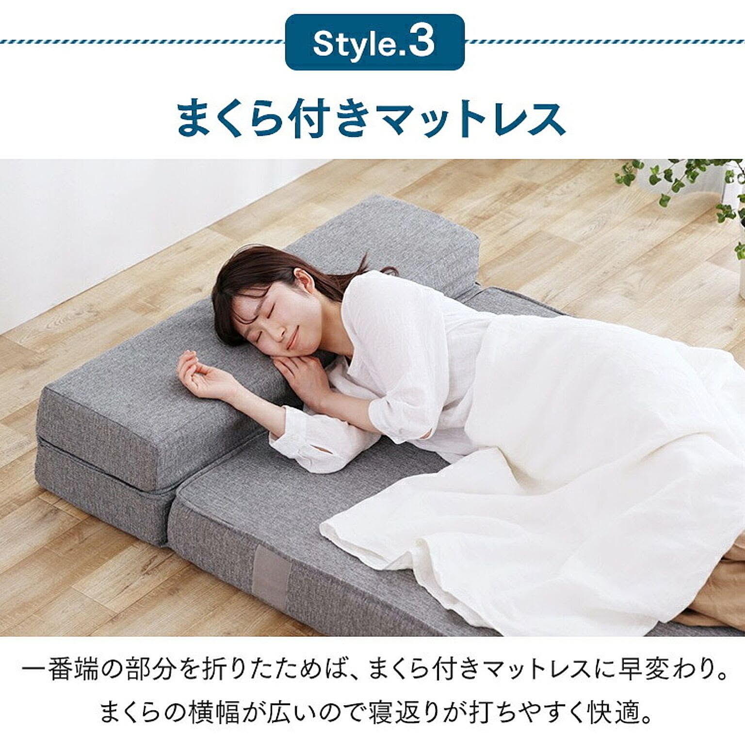 生活スタイルに合わせて、4つのくつろぎスタイル。マットレス・枕付きマットレス・カウチ・ソファシーンに合わせて使い分けできるソファマットレスです。すべて広げればマットレスに。硬めの高反発マットレスで寝返りもしやすく、全身を安定して支えます。厚さは約12cmで底付き感がありません。端を折りたためば枕付きマットレスに早変わり。昼間は折りたたんでコンパクトなソファに。お部屋を広く使えます。さらに座面を広げればゆったりとしたカウチソファにも。外装カバーは洗濯可能。(洗濯ネットを使用してください)いつでも清潔にご使用いただけます。※ウレタンフォームは洗濯できません重さ約6.8kg。軽量なので持ち運びも簡単。コンパクトな圧縮梱包でお届けします。●商品サイズ(cm)マットレスタイプ:幅約97×奥行約197×高さ約12枕付きマットレスタイプ:幅約97×奥行約169×高さ約24カウチタイプ:幅約97×奥行約140×高さ約36ソファタイプ:幅約97×奥行約70×高さ約48●かたさかため(156N)●組成インナーカバー:ポリプロピレン100%外装カバー:ポリプロピレン100%詰物:ウレタンフォーム●お手入れ方法外装生地のみ洗濯可能。(洗濯ネットを使用してください)※ウレタンフォームは洗濯できません