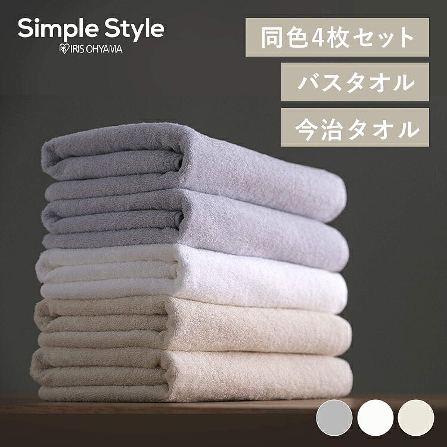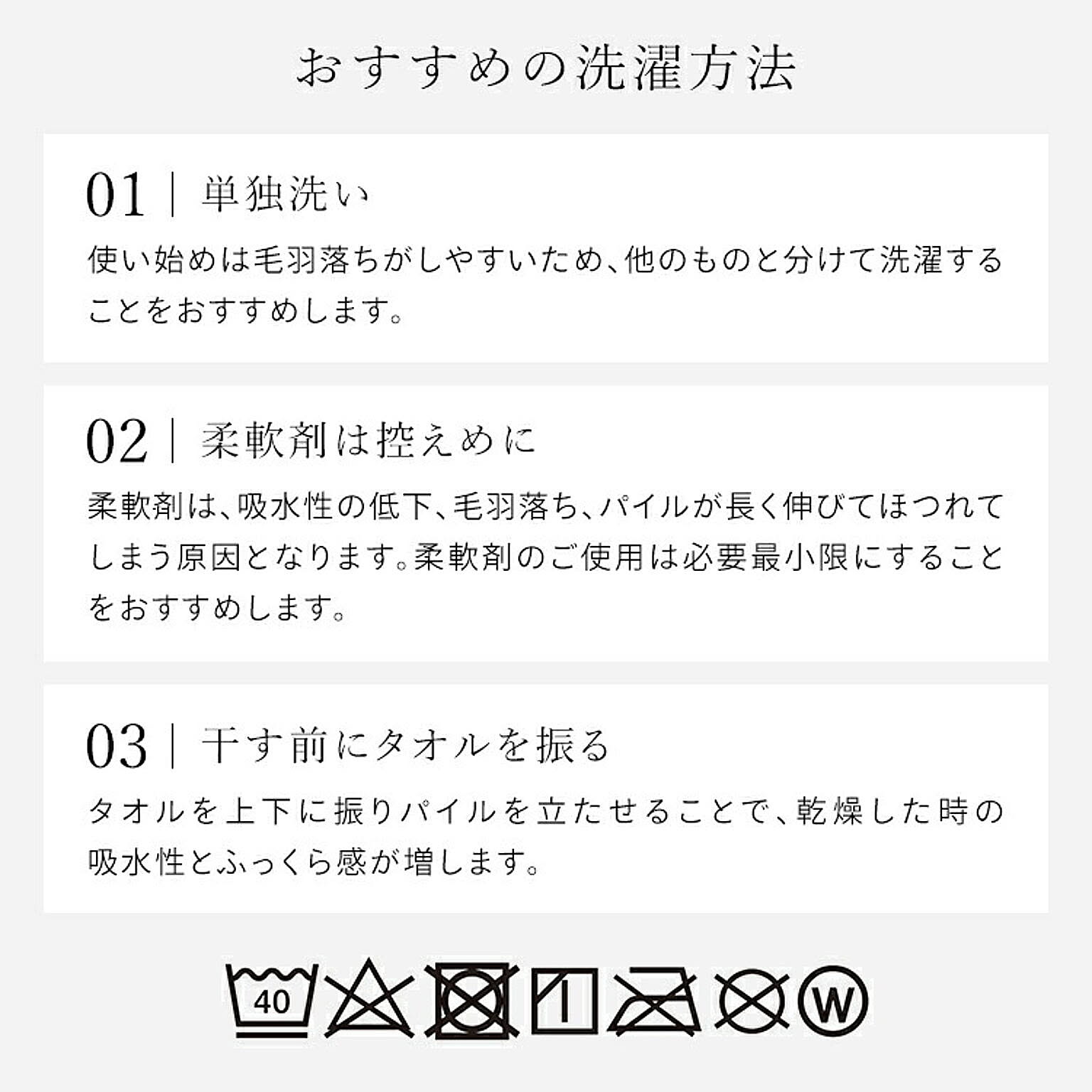 乾きやすさ、ふき取りやすさにこだわったほどよい厚みのタオルです。バスタオル/同色4枚セット/今治製布面積が大きく、多くの水分を吸収できるサイズです。入浴後やプールなどのスポーツに。使いやすさにこだわったデイリータオル。使用時のふき取りやすさ、洗濯時の乾きやすさ、どちらも程よく兼ね備えた使いやすいタオルです。耐久性が高く、丈夫で風合い長持ち。●商品サイズ(cm)約60×約120●セット枚数同色4枚●組成綿100%●洗濯表示