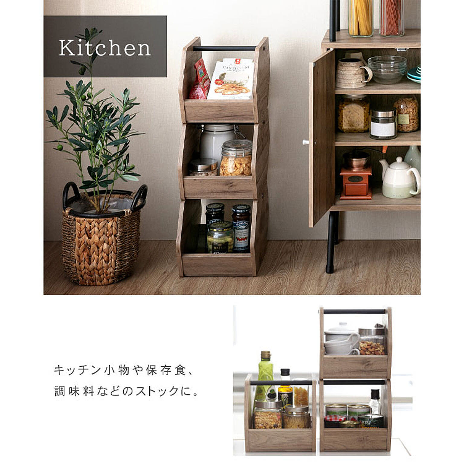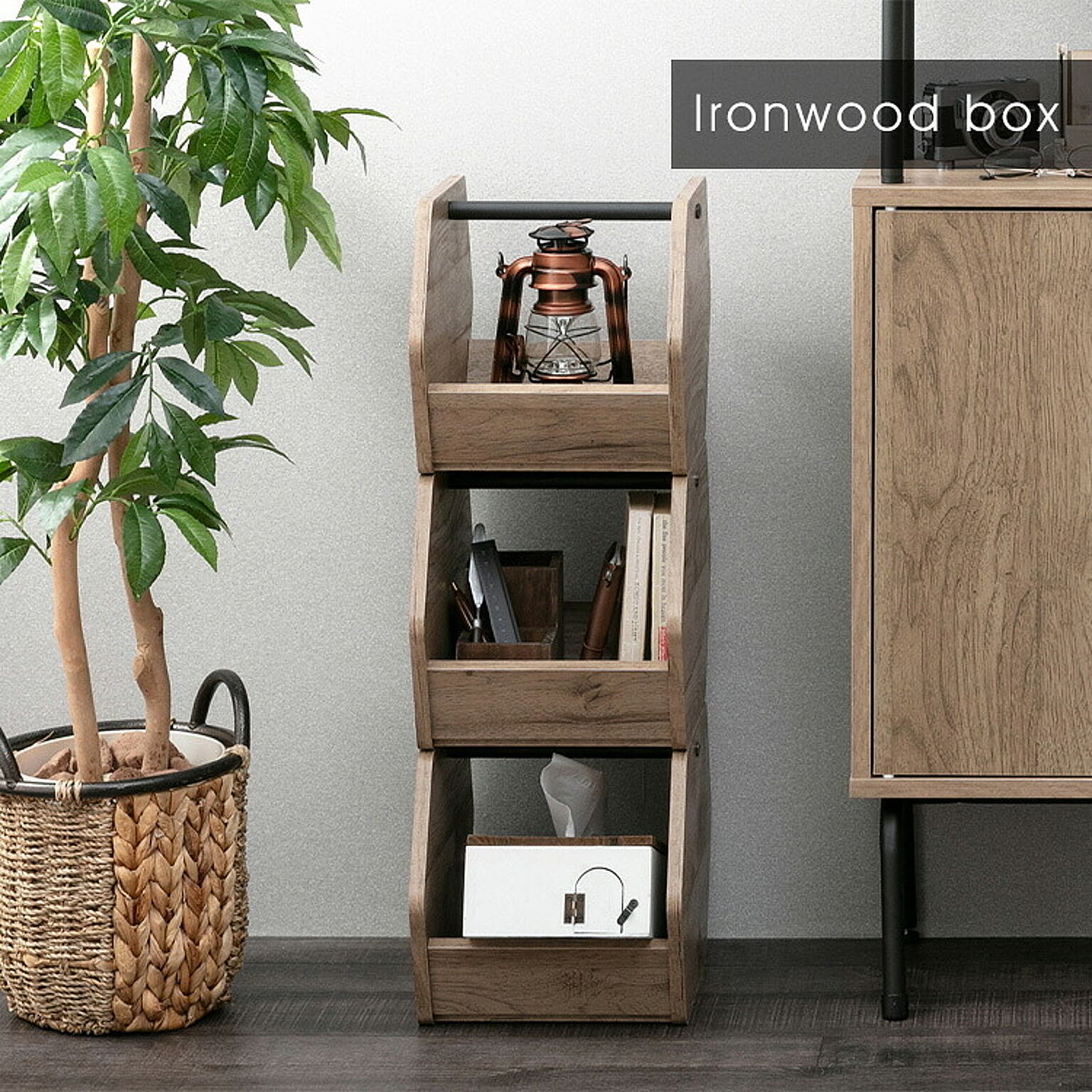 木目調とスチールというMaterial mixが織りなすインダストリアルデザイン。お部屋が広く感じられる省スペース設計のHIROBIROシリーズ。シンプルで合わせやすいデザインと魅せる隠せる機能性、部屋を広くキレイに使えるように考えられたサイズ。過ごしやすい自分スタイルの空間を演出します。どこにでも何にでも使える、オープンな収納ボックスです。魅せる×隠す×積み重ねる。何を入れても、スタイリッシュ。マルチに使えてさまになる、素敵なお部屋を演出するデザインです。くるっと90度回転で魅せるから隠すに早変わり!積み重ねて使えば、同じ床面積で収納力は2倍3倍に。縦空間を上手に使ってお部屋広々。ダボで上下をつなぐので、ずれにくい仕様で安心です。雑誌やブランケットを入れたり、キッチン小物や保存食調味料などのストック、おもちゃの投げ込み収納にも大活躍。持ち手があるので、コスメを道具を入れてサニタリールームとの行き来もラクラク。シンプルな木目調なので、何を飾っても合わせやすい!落ち着いた風合いの木目調のボードでどんなお部屋にも馴染みます。マットな粉体塗装を施したスチールはキズ・サビに強い素材です。〜粉体塗装とは〜防錆性・耐熱性・耐油性に優れており、ガードレールや自動車部品などの過酷な使用状況の塗装に多く利用されています。強く柔軟で寿命が長く、有機溶剤を使用していないため、人体にも環境にも優しいeco塗装です。★お客様組立★※必要工具:+ドライバー(サイズ:2番)●商品サイズ(cm)幅約22.2×奥行約32.0×高さ約68.9(3個積み重ね時)●質量(3個計)5.5kg●耐荷重各:約5kg●主要材質プリント紙化粧パーティクルボード、スチール(エポキシ粉体塗装)