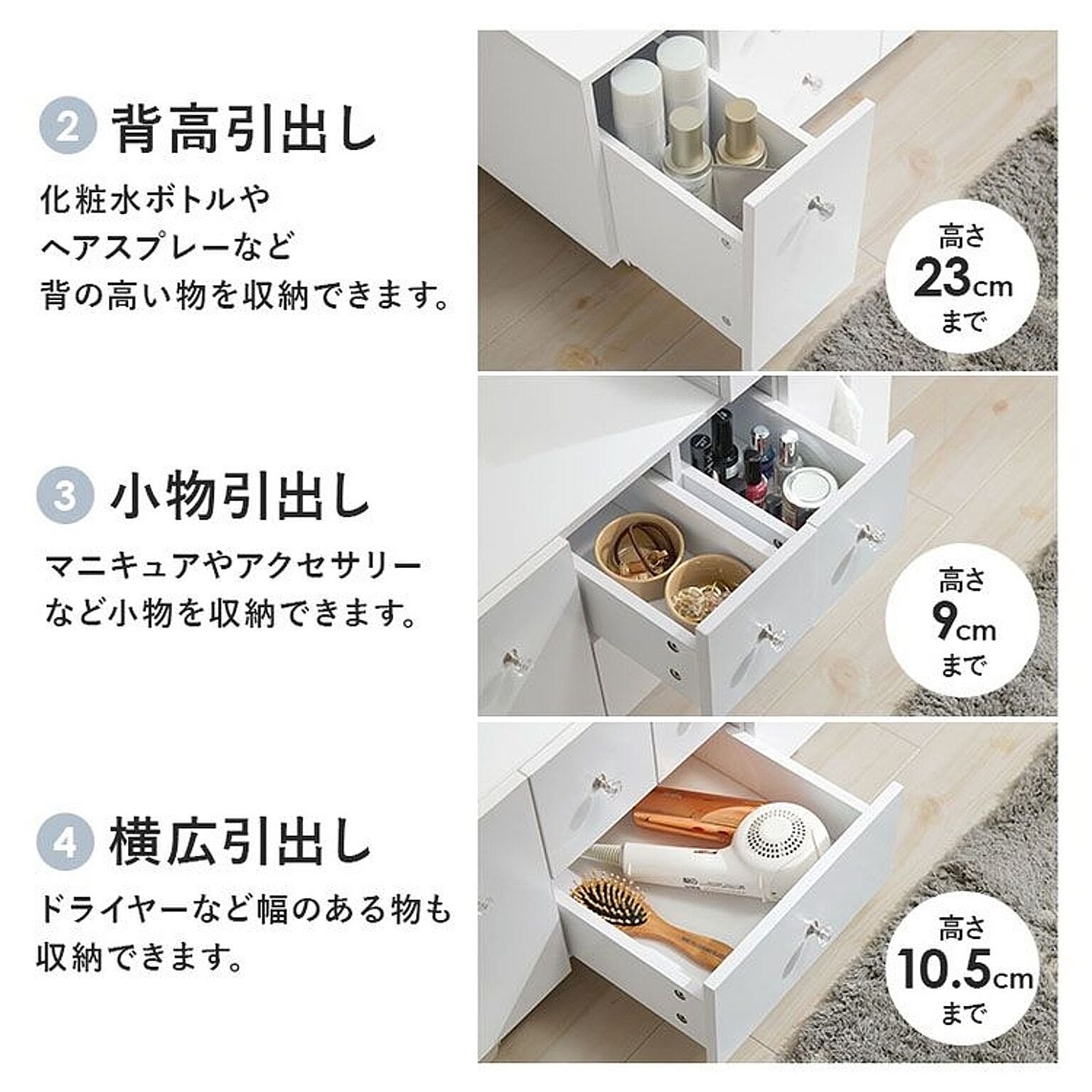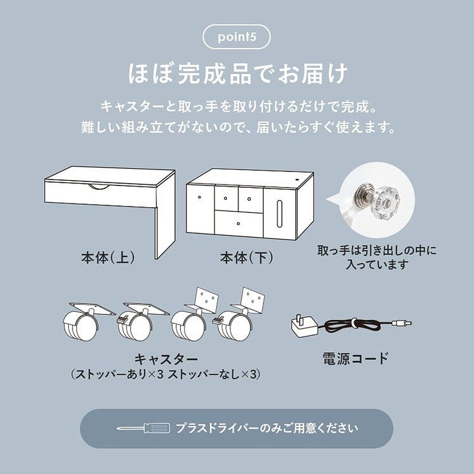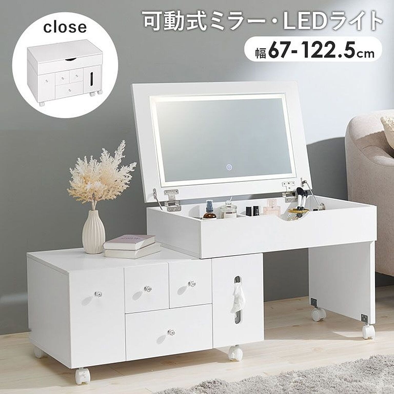 LEDの女優ライト付きでメイク上手になれるコスメワゴン。大容量な収納に加え伸縮式なので、お部屋のレイアウトに合わせて幅が変えられます。※こちらの商品はお取り寄せ商品のため、初期不良以外の返品・交換は承れませんので、あらかじめご了承ください。★お客様組立★※キャスター、取っ手のみ取り付けが必要です。●商品サイズ(cm)幅約67-122.5×奥行約43×高さ約46-85●商品重量約21kg●主な材質メラミン化粧繊維板●組立時間大人1人で約15分