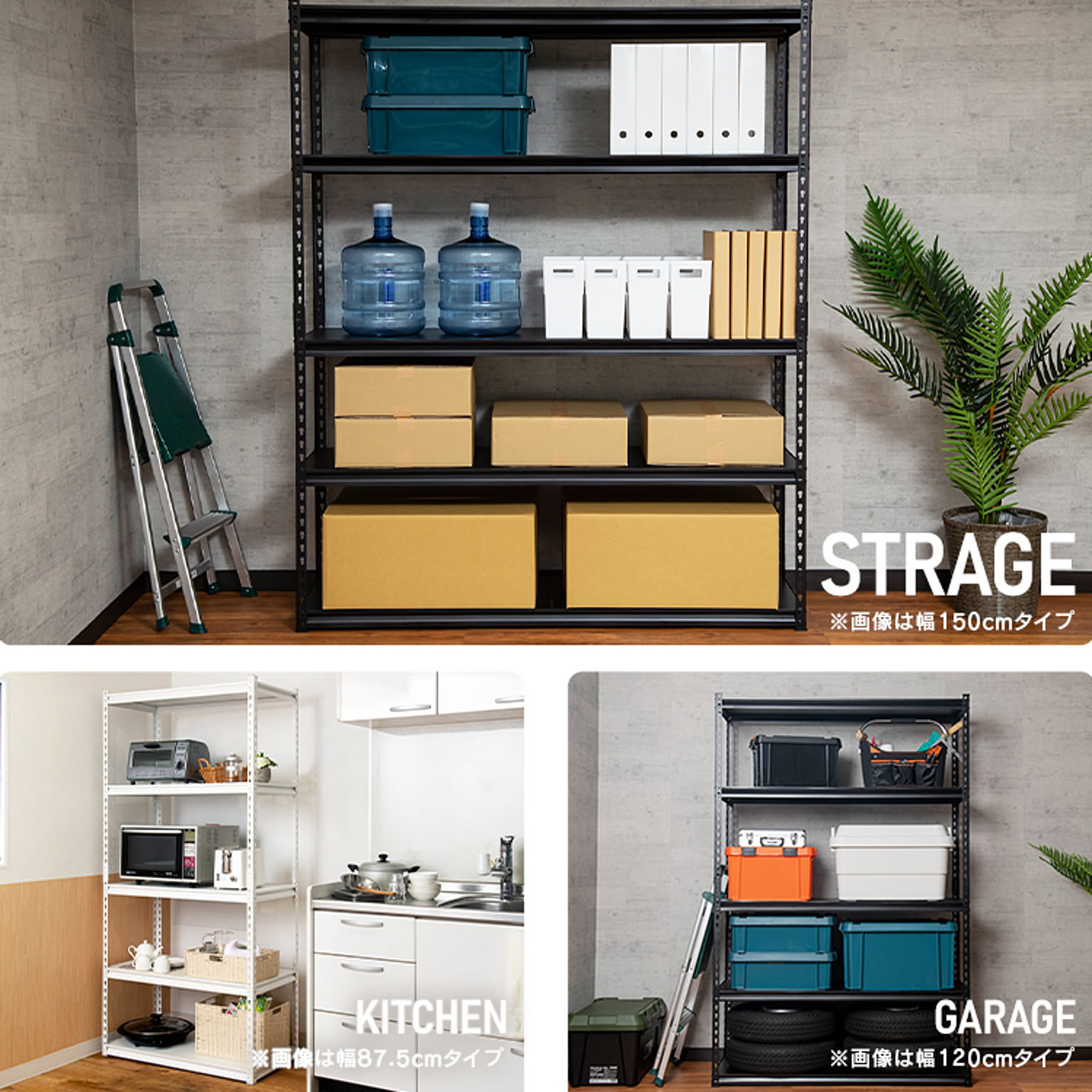 お好みの位置に設置できる5枚の可動棚が付いたスチールラック。