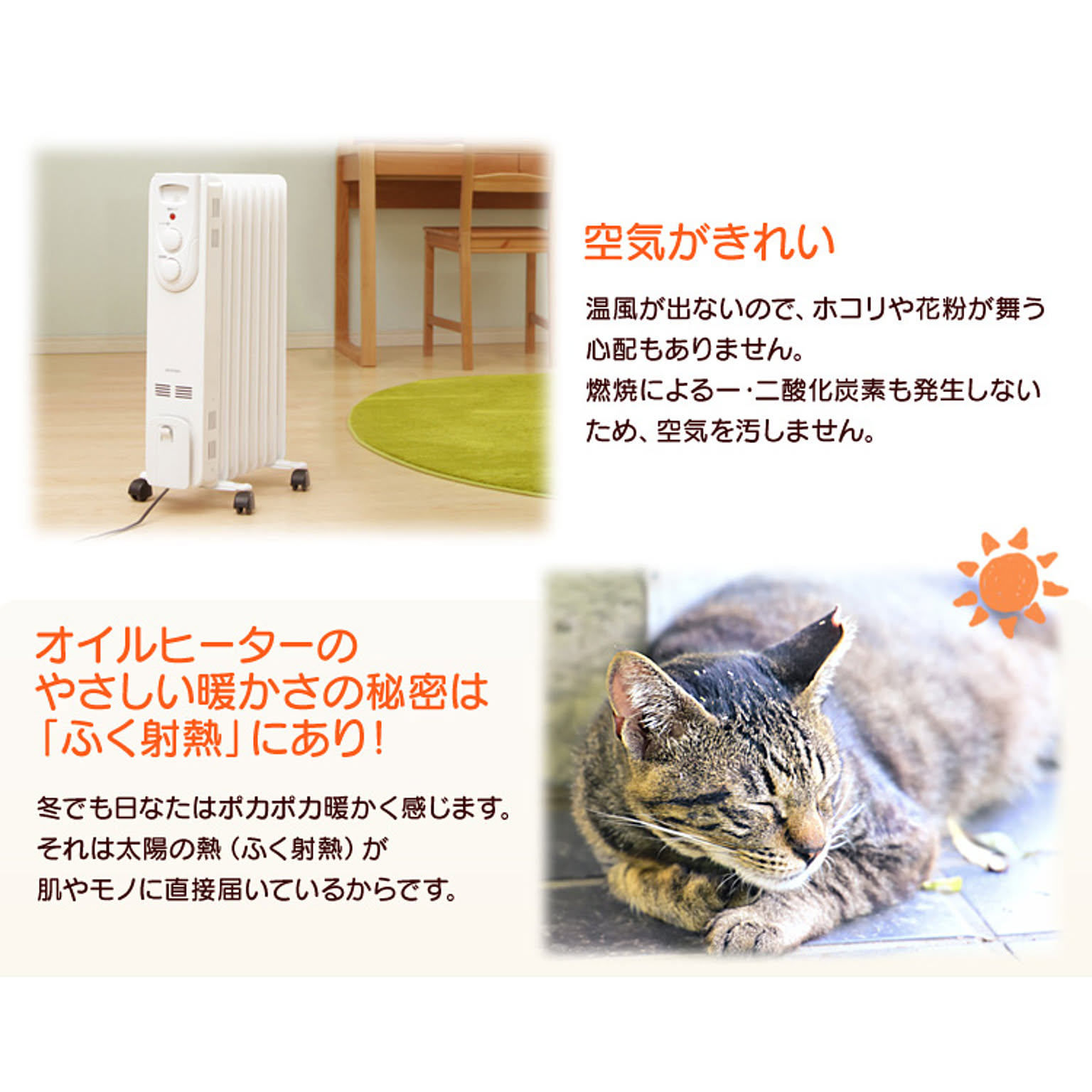 小さなお子様やペットにも優しい、オイルヒーター。 お部屋全体をゆっくり暖めます。空気を汚さない、クリーンな暖房です。温風や炎を出さないので安全です。 ●定格電源 AC100V、50/60Hz ●消費電力 強:1200W 中:700W 弱:500W ●適用床面積 8畳 ●タンク容量 約3.0L ●商品サイズ(cm)幅約25×奥行約47.5×高さ約65 ●商品重量 約10.5kg ●電源コード長 1.6m