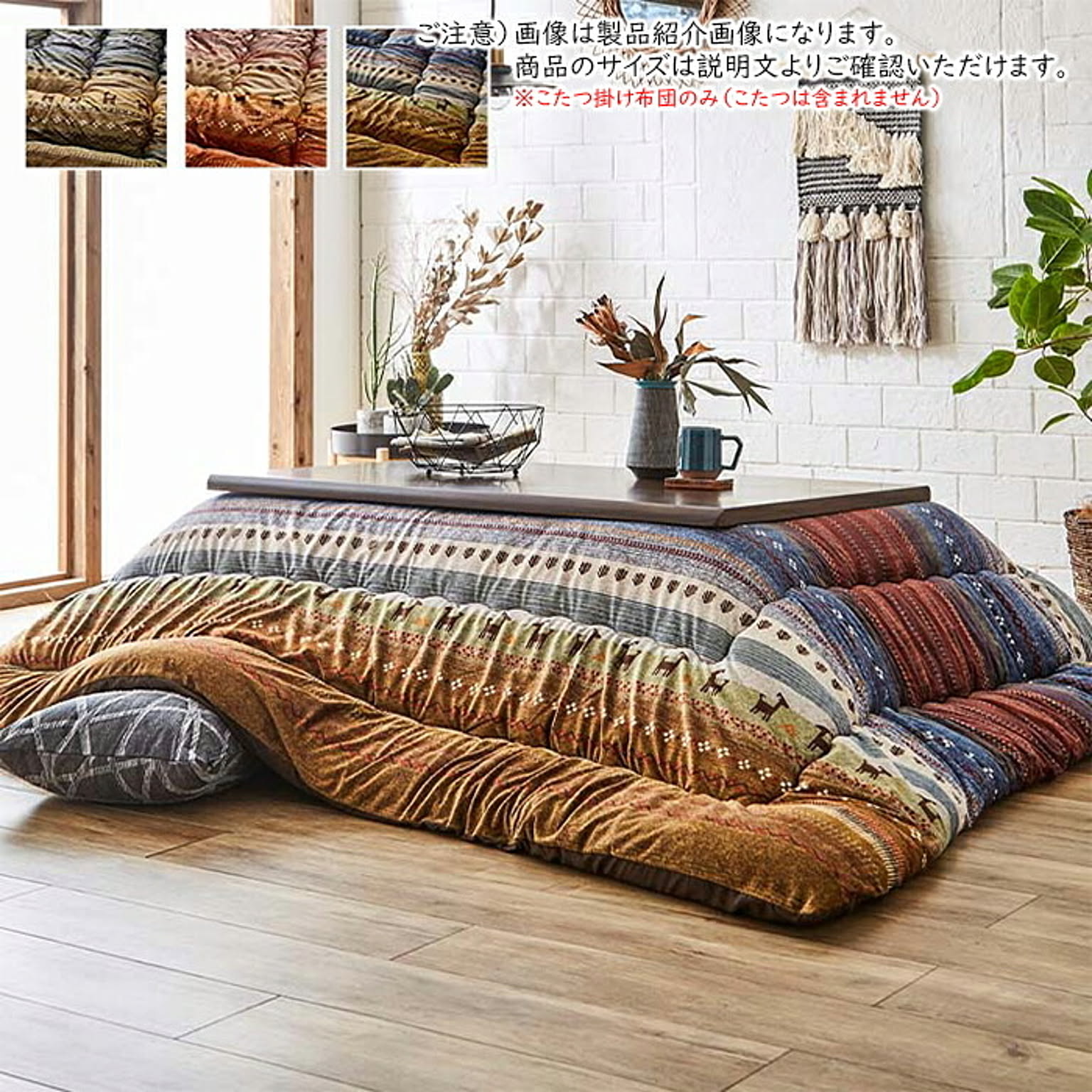ギャベ柄をモチーフにした大人かわいいこたつ掛け布団です。繊細なプリントが特徴です。表生地には肌触りのよい短毛のマイクロファイバーを使用。ふかふか感のある素材です。ふっくらとしたボリューム感は国内で綿入加工をしている商品だからできる仕上がり。1枚1枚丁寧に仕上げた安心の品質です。