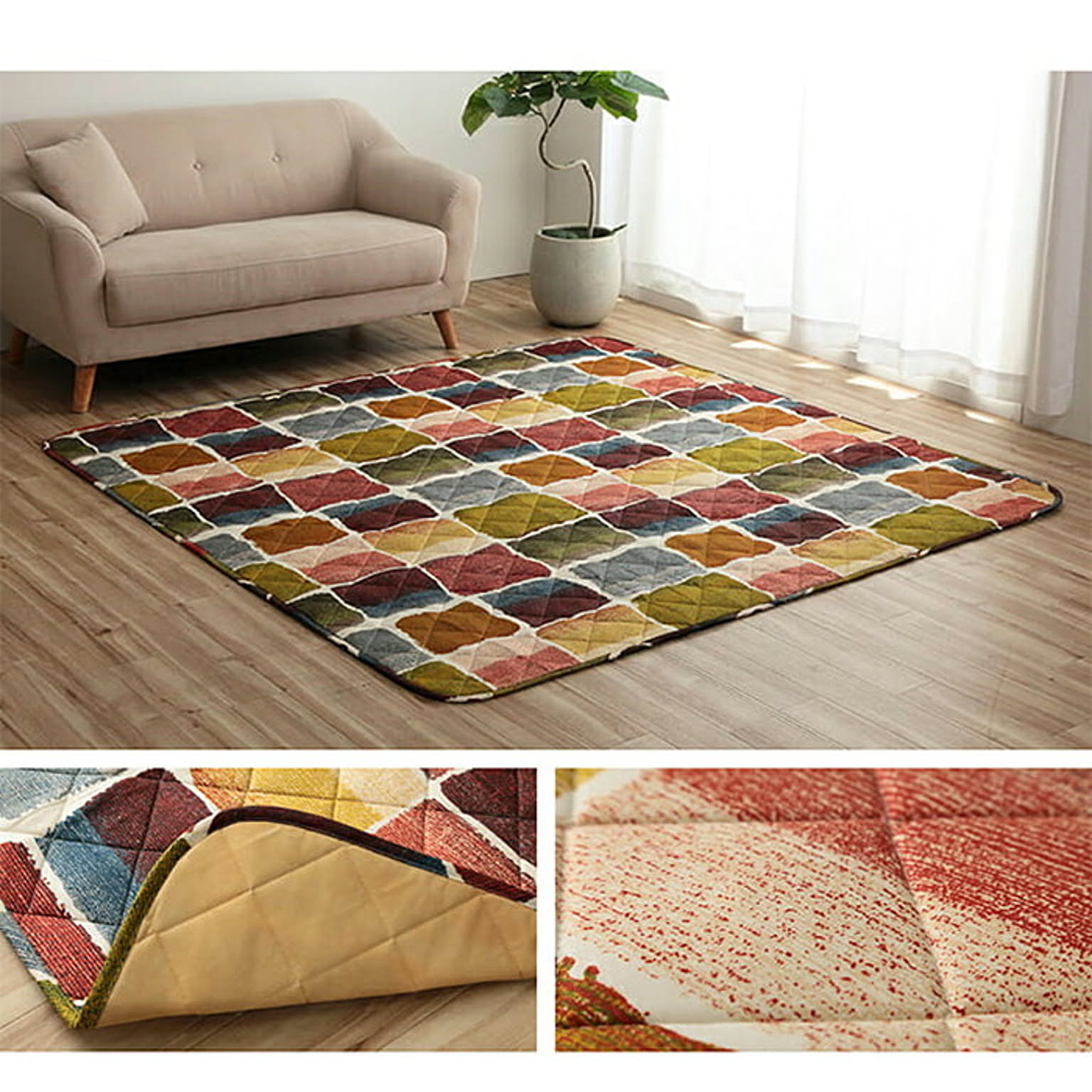 安心の日本製、国内綿入れ加工でボリュームたっぷり。側地にはポリエステル素材を起毛させた柔らかい生地を使用しています。裏地には肌触りなめらかなフランネル生地を使用しています。