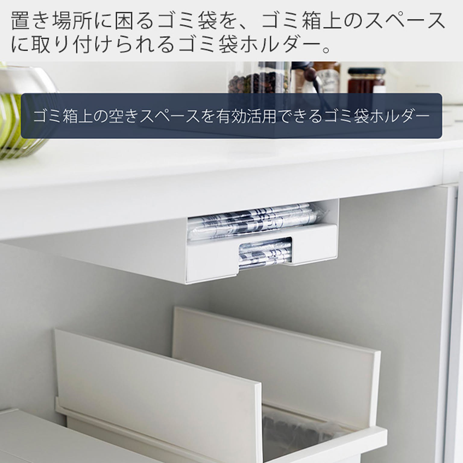 置き場所に困るゴミ袋をごみ箱上の空きスペースに取り付けられるゴミ袋ホルダー。
