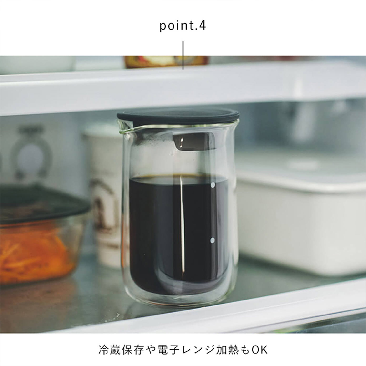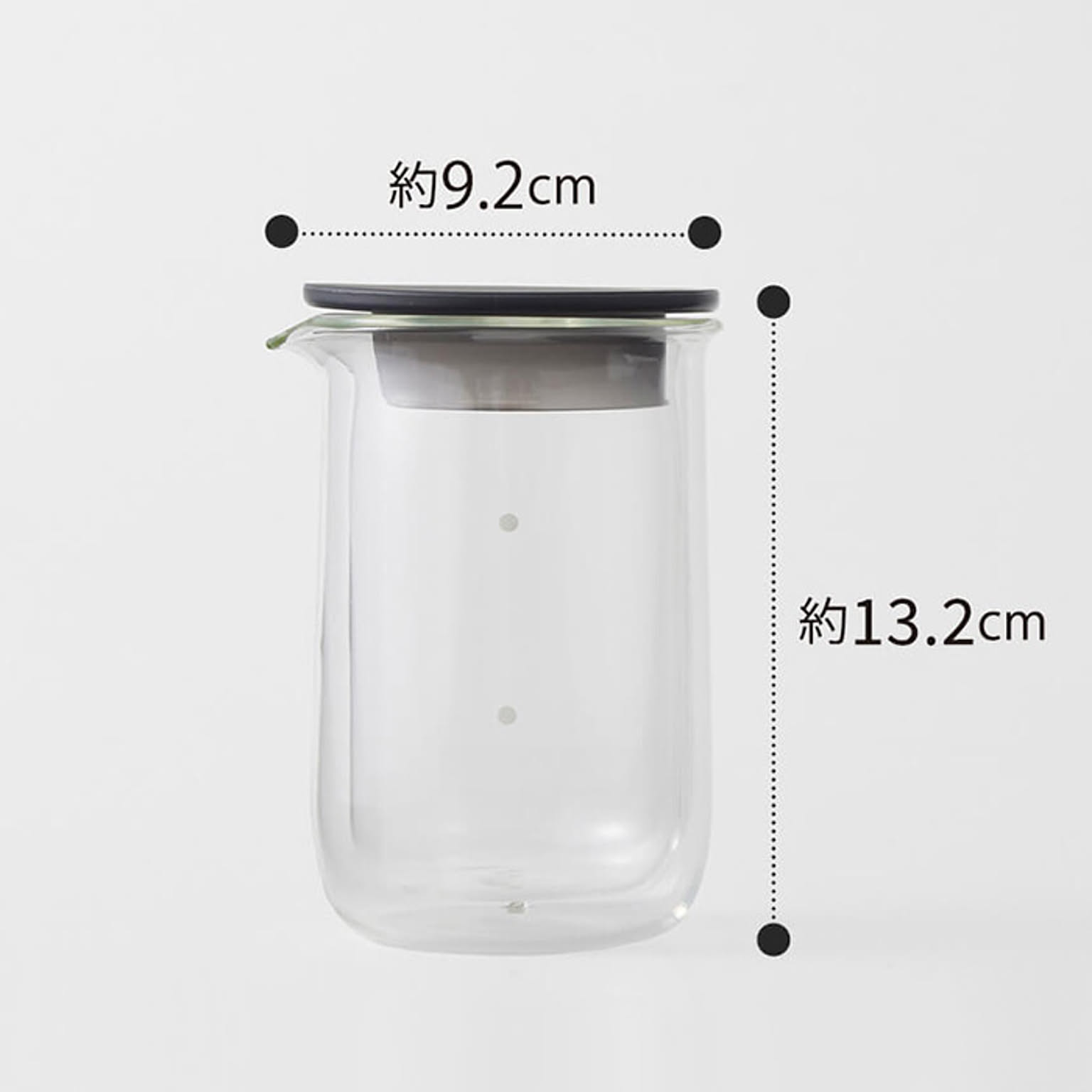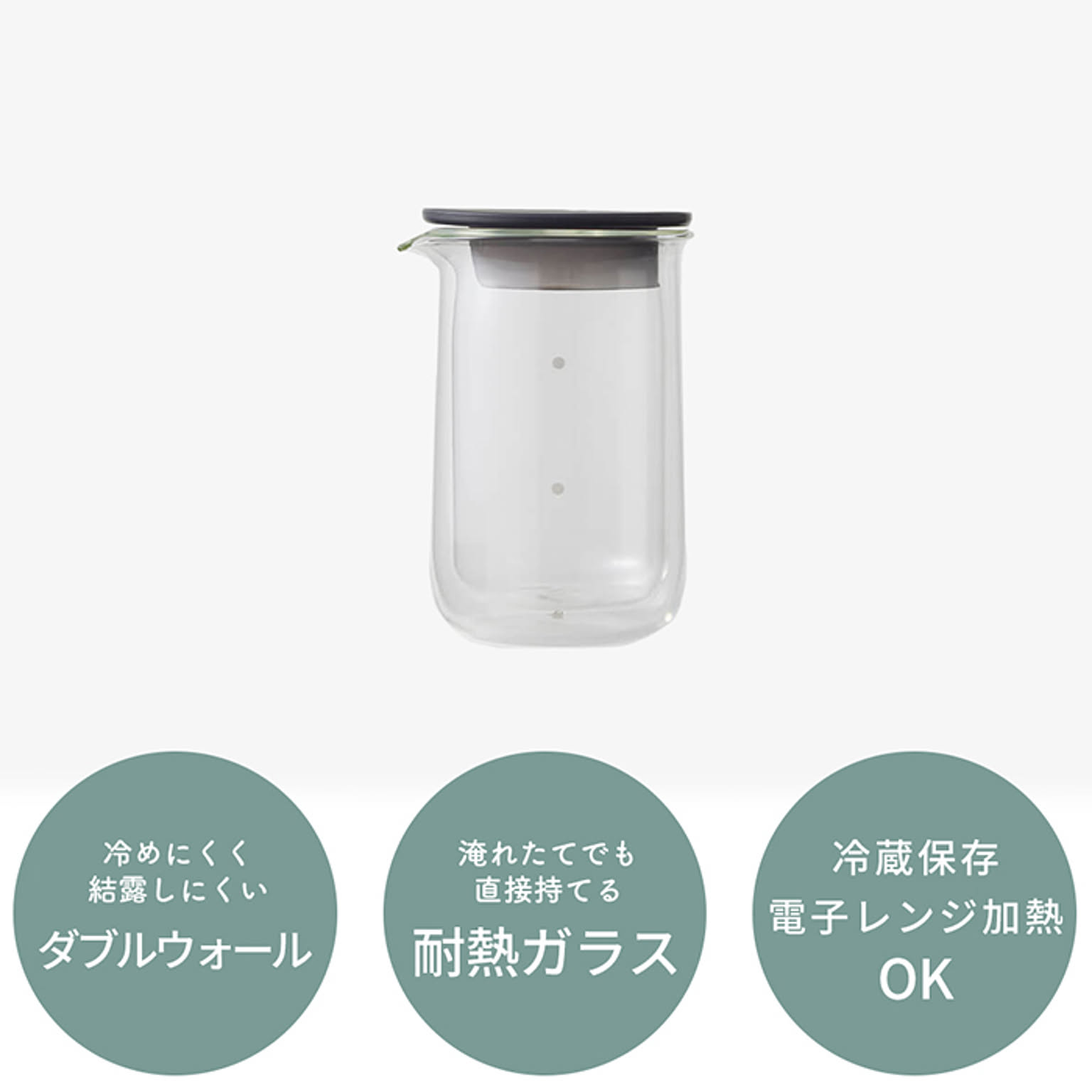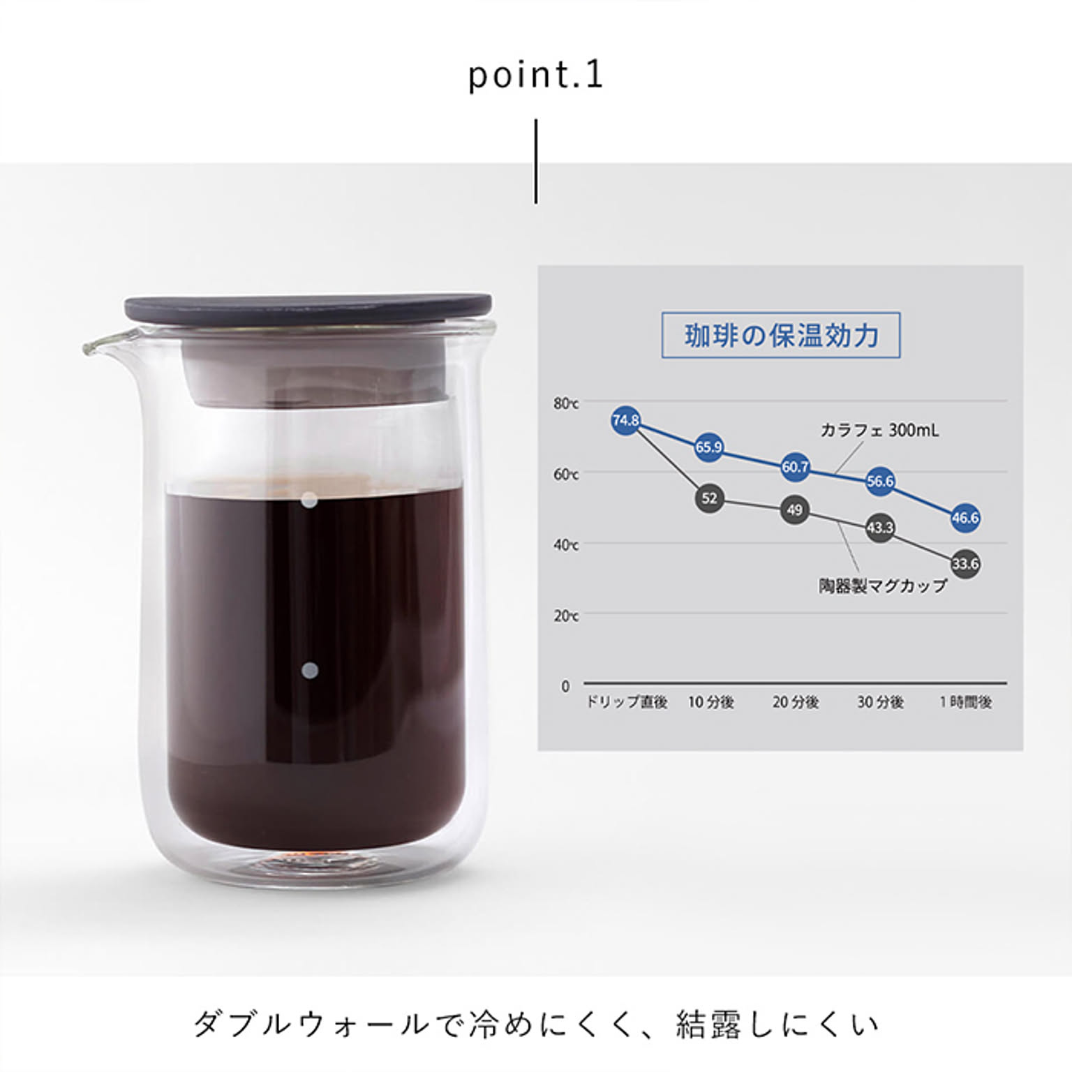 ドリッパーを乗せてコーヒーを淹れたり、カットしたレモンと氷を入れて、フレーバーウォーターを作ったりできる自由なカラフェ。ダブルウォールがつくる「空気の層」で湯気が立つような熱さでも直接持って注げて、冷たいものは結露しにくくなっています。 【本体サイズ】 約W8.4×D9.2×H13.2cm 【容量】 300ml 【耐熱温度】 フタ:120℃ カラフェ ハンドドリップ 珈琲 紅茶 お茶 麦茶 水 シンプル キッチン用品 カフェ おしゃれ