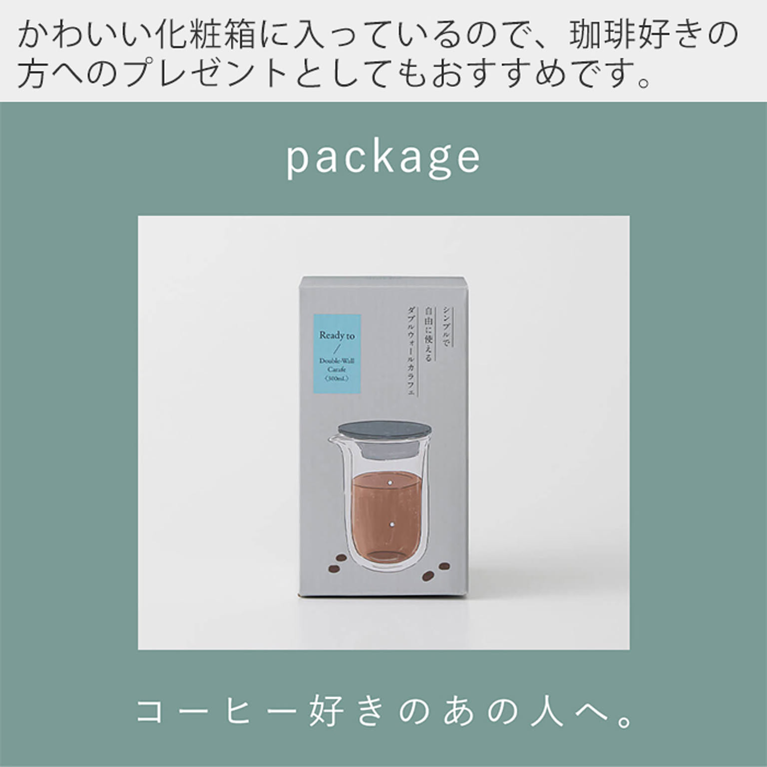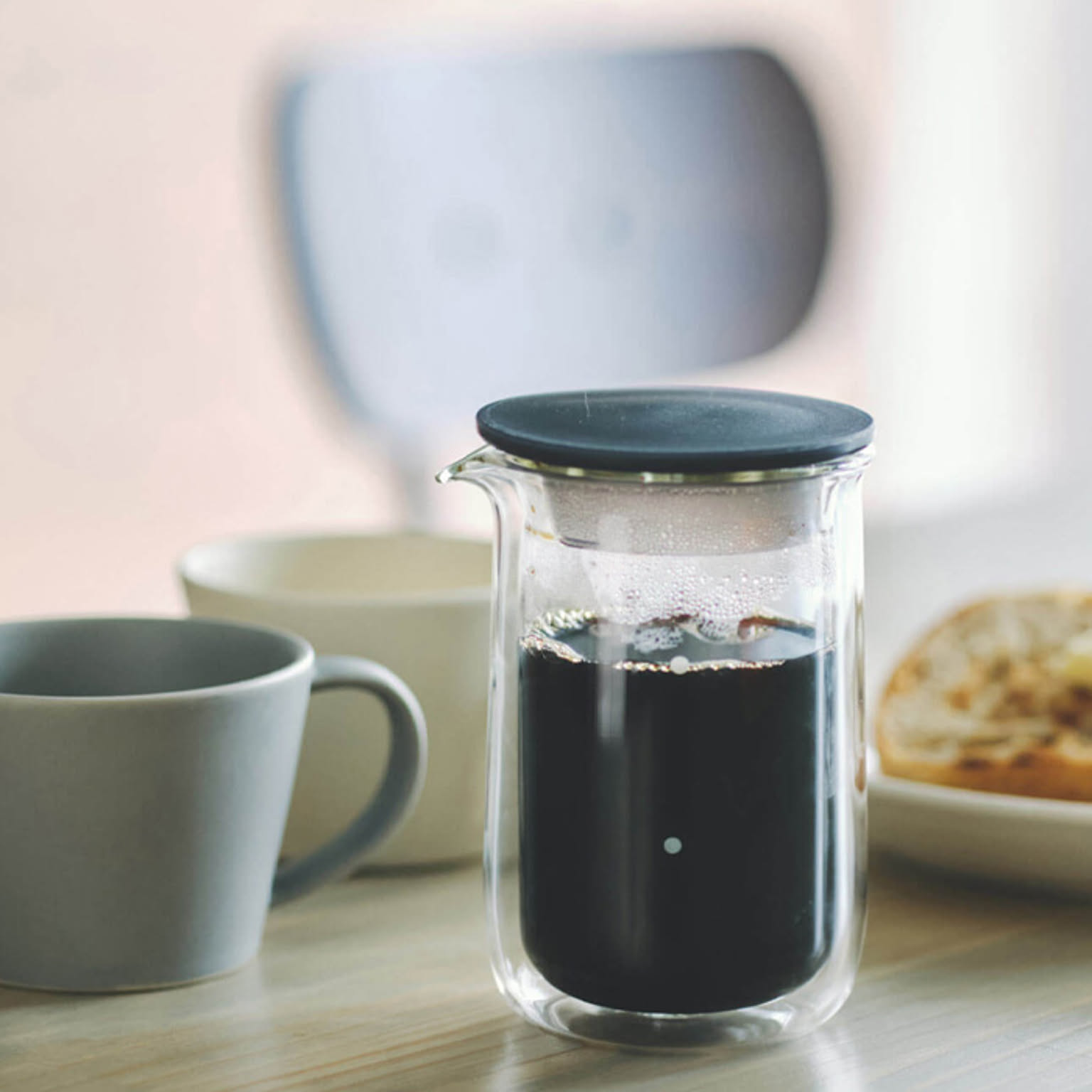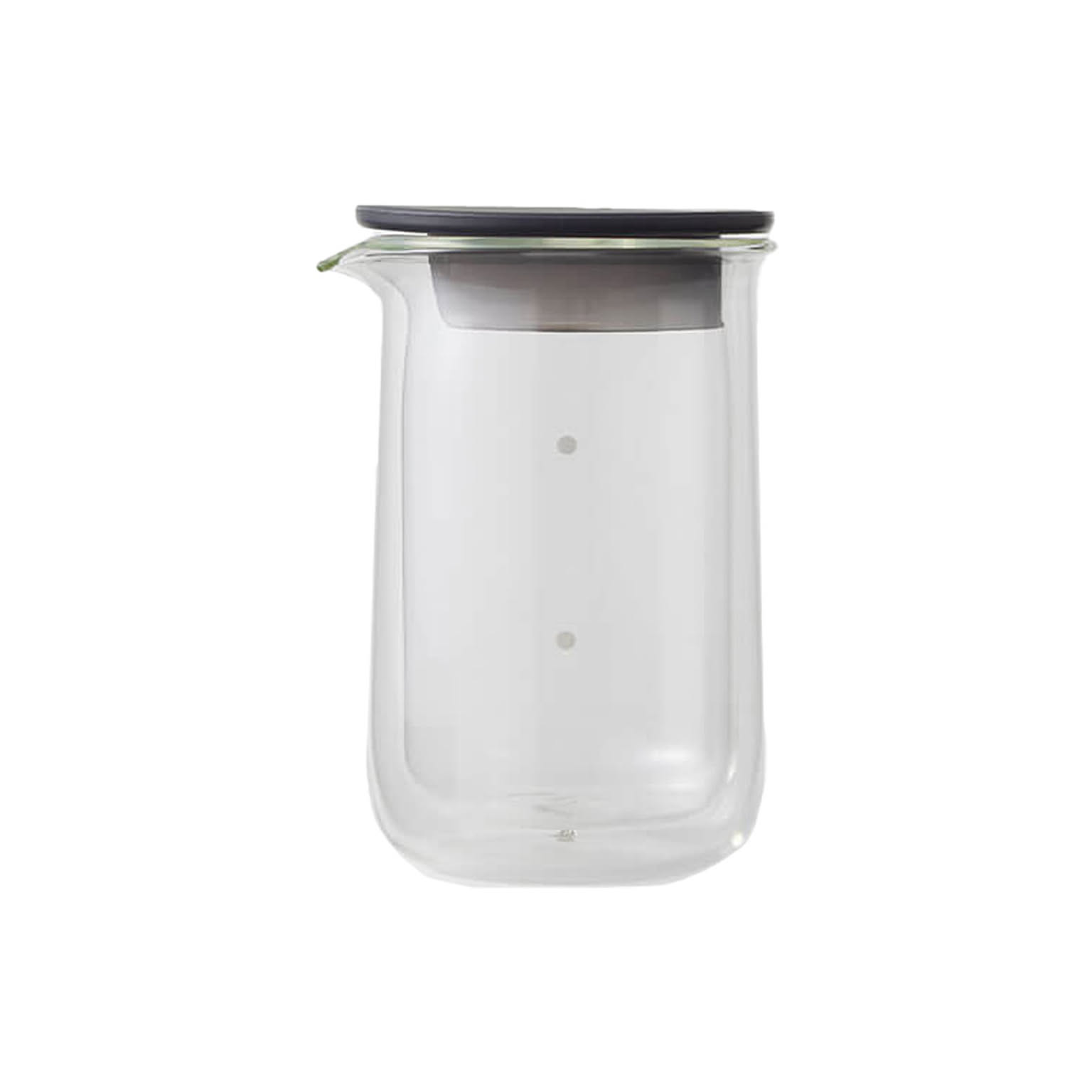 ドリッパーを乗せてコーヒーを淹れたり、カットしたレモンと氷を入れて、フレーバーウォーターを作ったりできる自由なカラフェ。ダブルウォールがつくる「空気の層」で湯気が立つような熱さでも直接持って注げて、冷たいものは結露しにくくなっています。 【本体サイズ】 約W8.4×D9.2×H13.2cm 【容量】 300ml 【耐熱温度】 フタ:120℃ カラフェ ハンドドリップ 珈琲 紅茶 お茶 麦茶 水 シンプル キッチン用品 カフェ おしゃれ