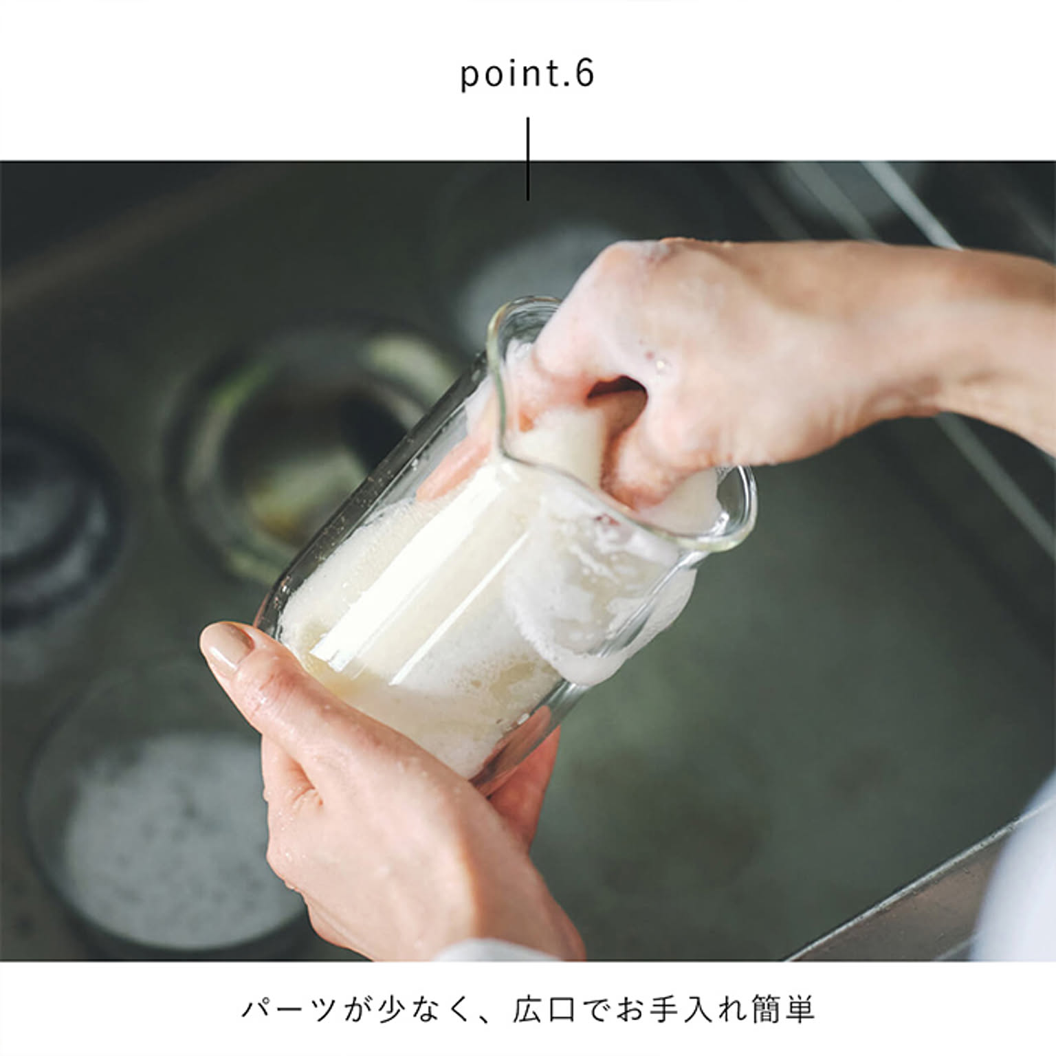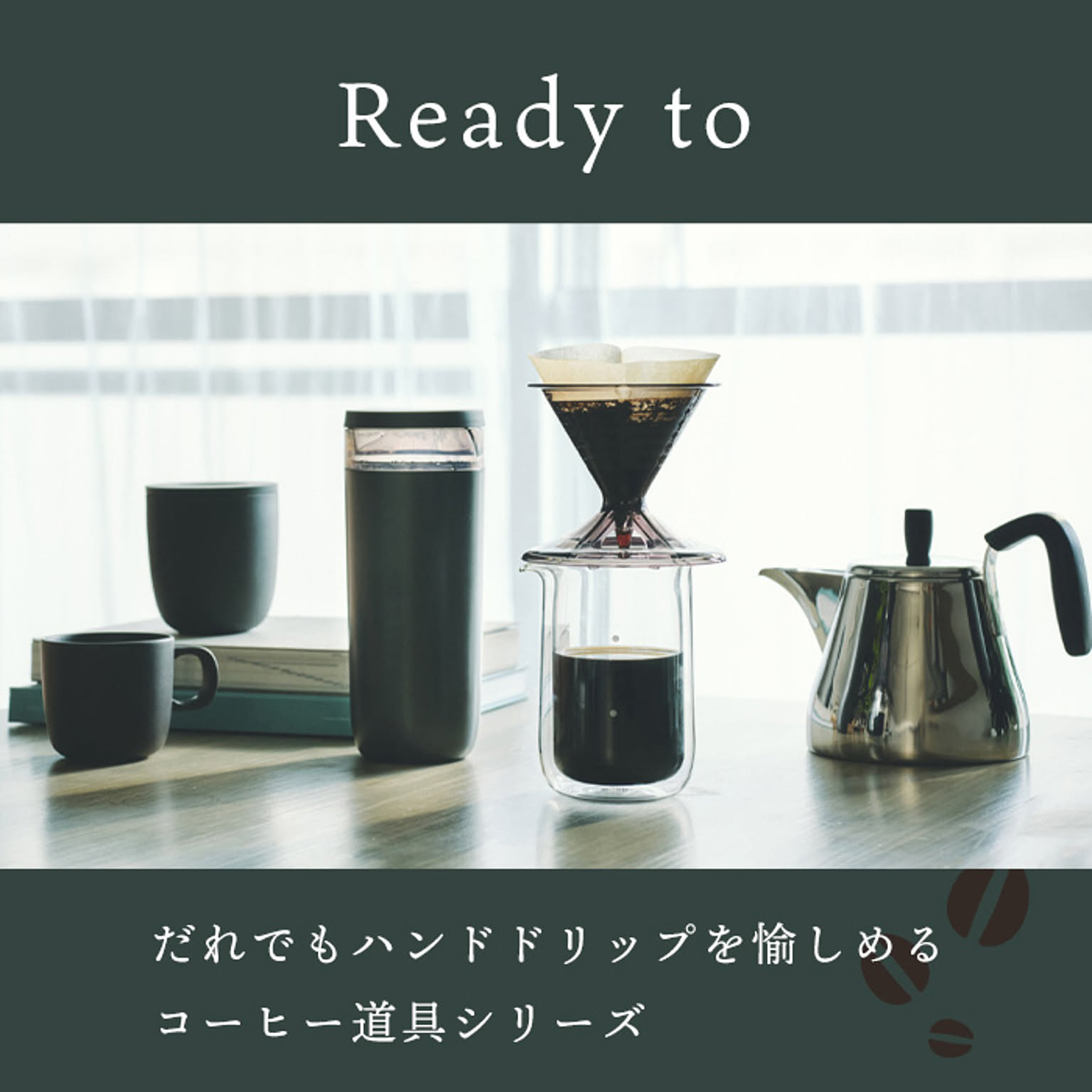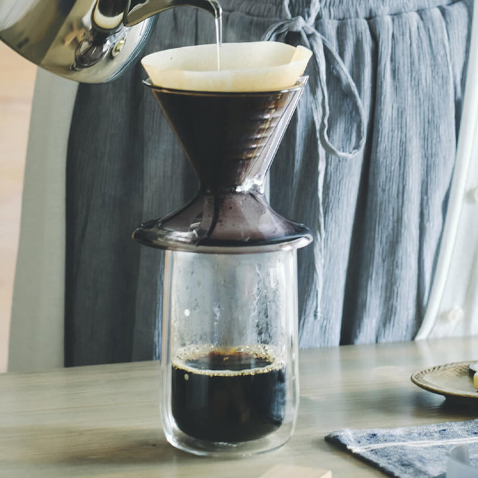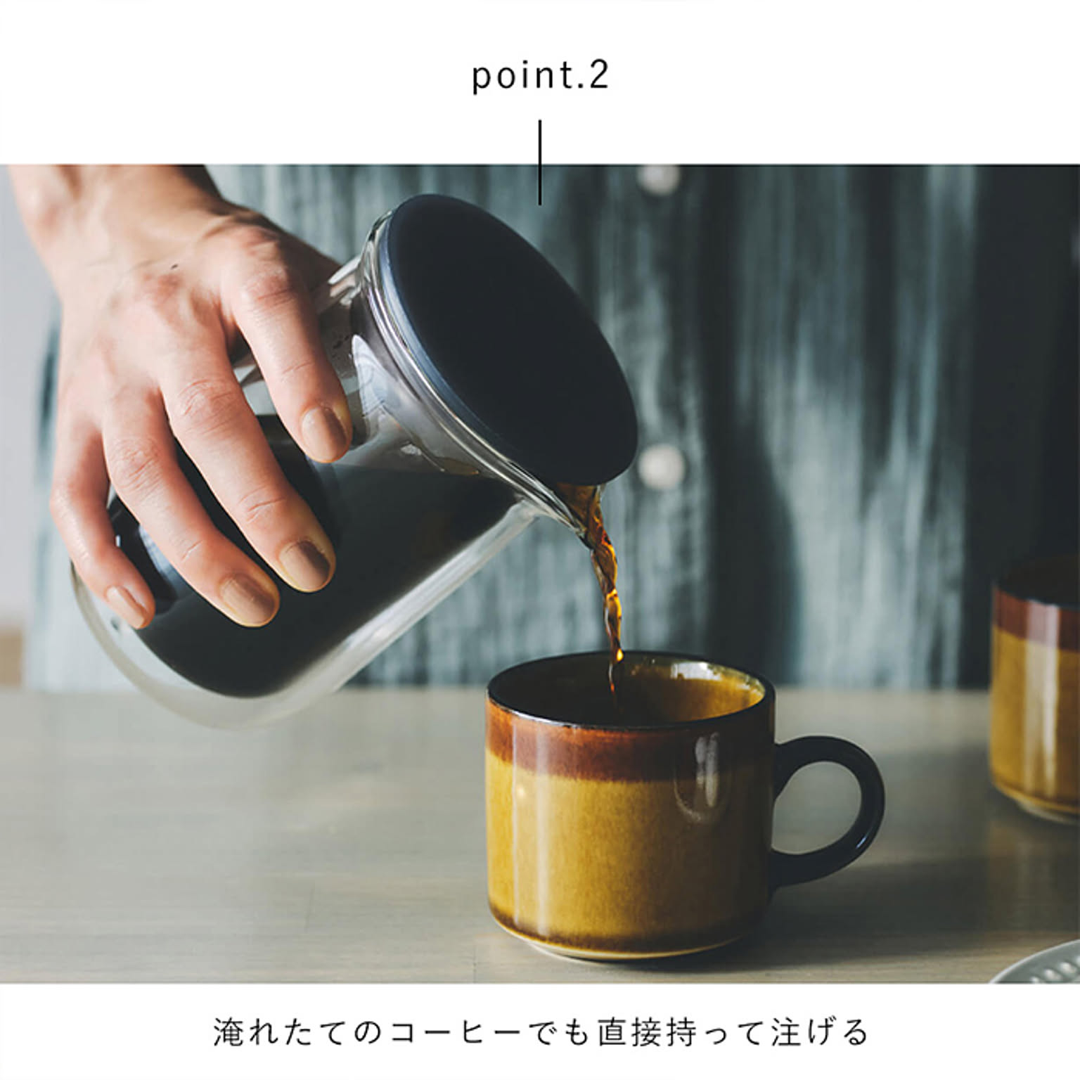 ドリッパーを乗せてコーヒーを淹れたり、カットしたレモンと氷を入れて、フレーバーウォーターを作ったりできる自由なカラフェ。ダブルウォールがつくる「空気の層」で湯気が立つような熱さでも直接持って注げて、冷たいものは結露しにくくなっています。 【本体サイズ】 約W8.4×D9.2×H13.2cm 【容量】 300ml 【耐熱温度】 フタ:120℃ カラフェ ハンドドリップ 珈琲 紅茶 お茶 麦茶 水 シンプル キッチン用品 カフェ おしゃれ