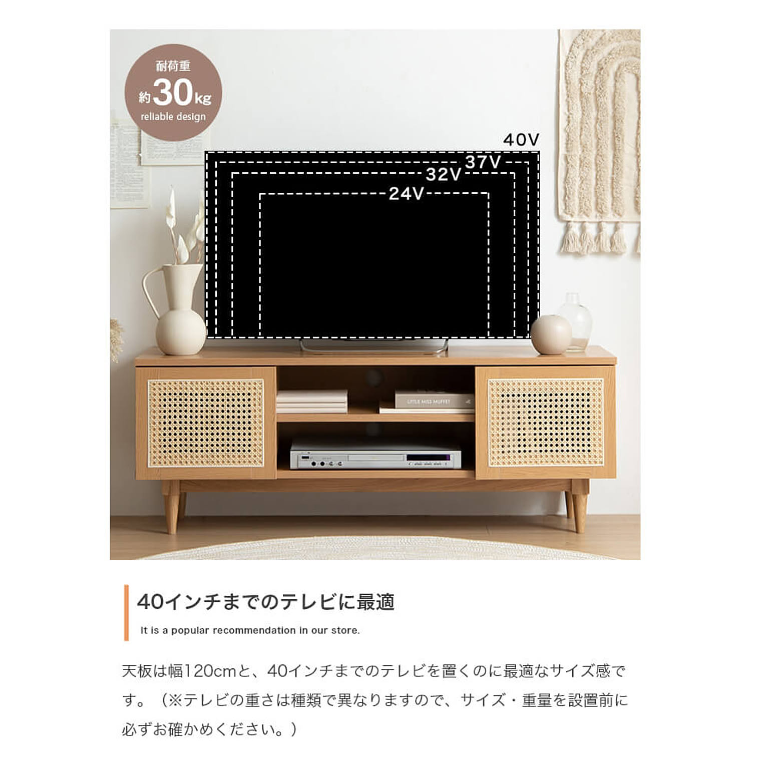 こちらの商品は「幅120cm」タイプとなります。自然の温もりと美しさをインテリアに取り入れるなら、この天然ラタンと木目調のローテレビボードが理想的。