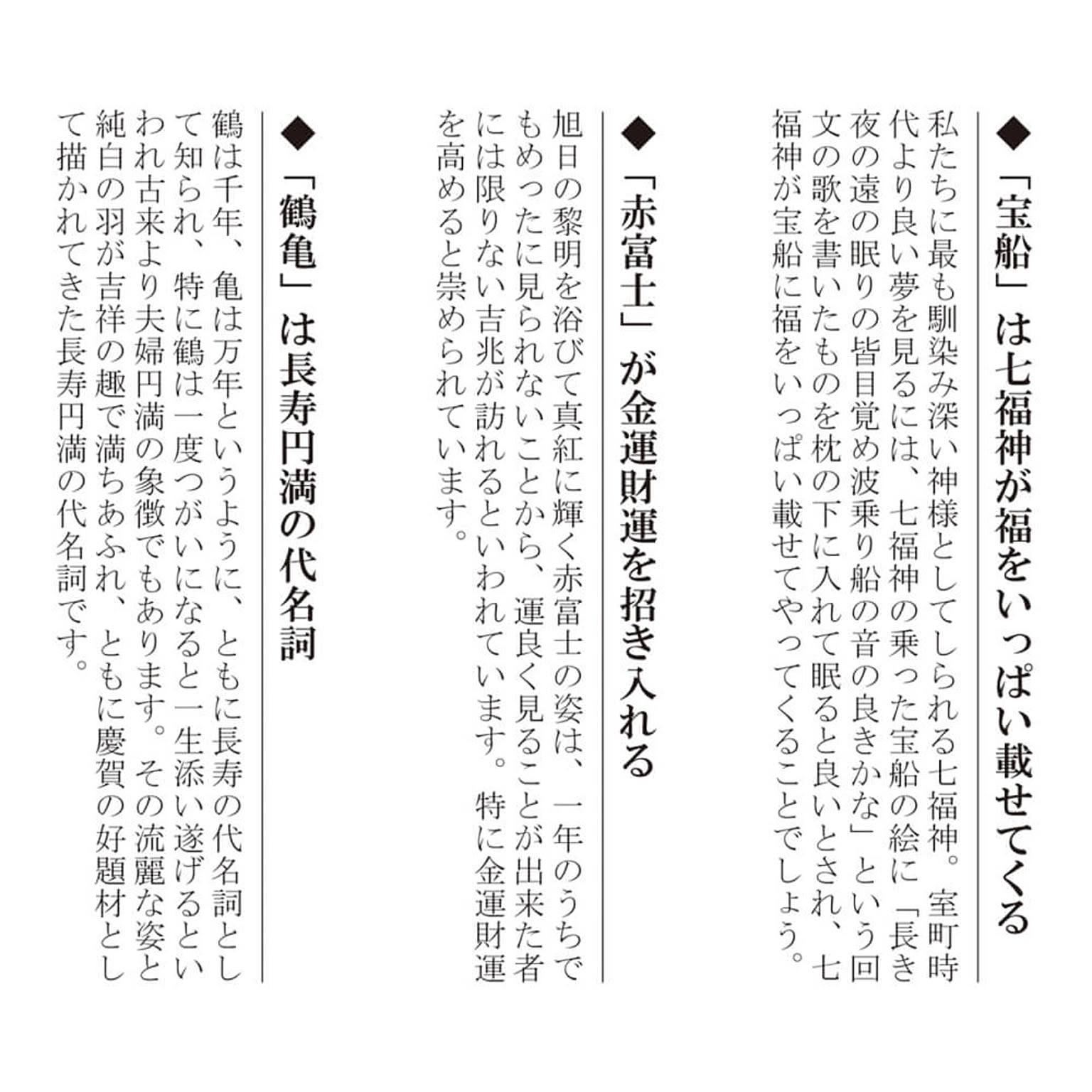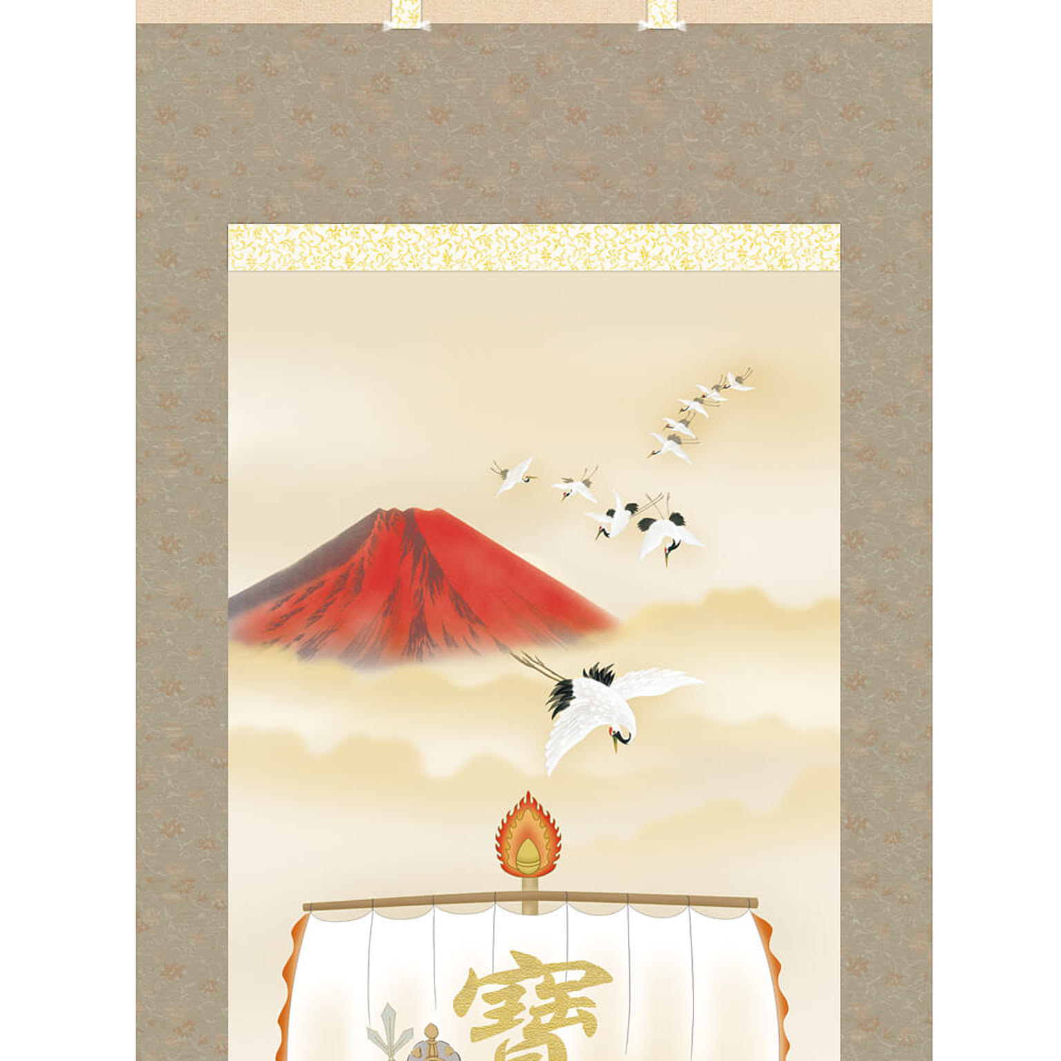 金運題材の「赤富士」、長寿円満の象徴「鶴亀」、福徳の「七福神」が勢揃いし、床の間に吉祥開運のパワーが満ちあふれます。