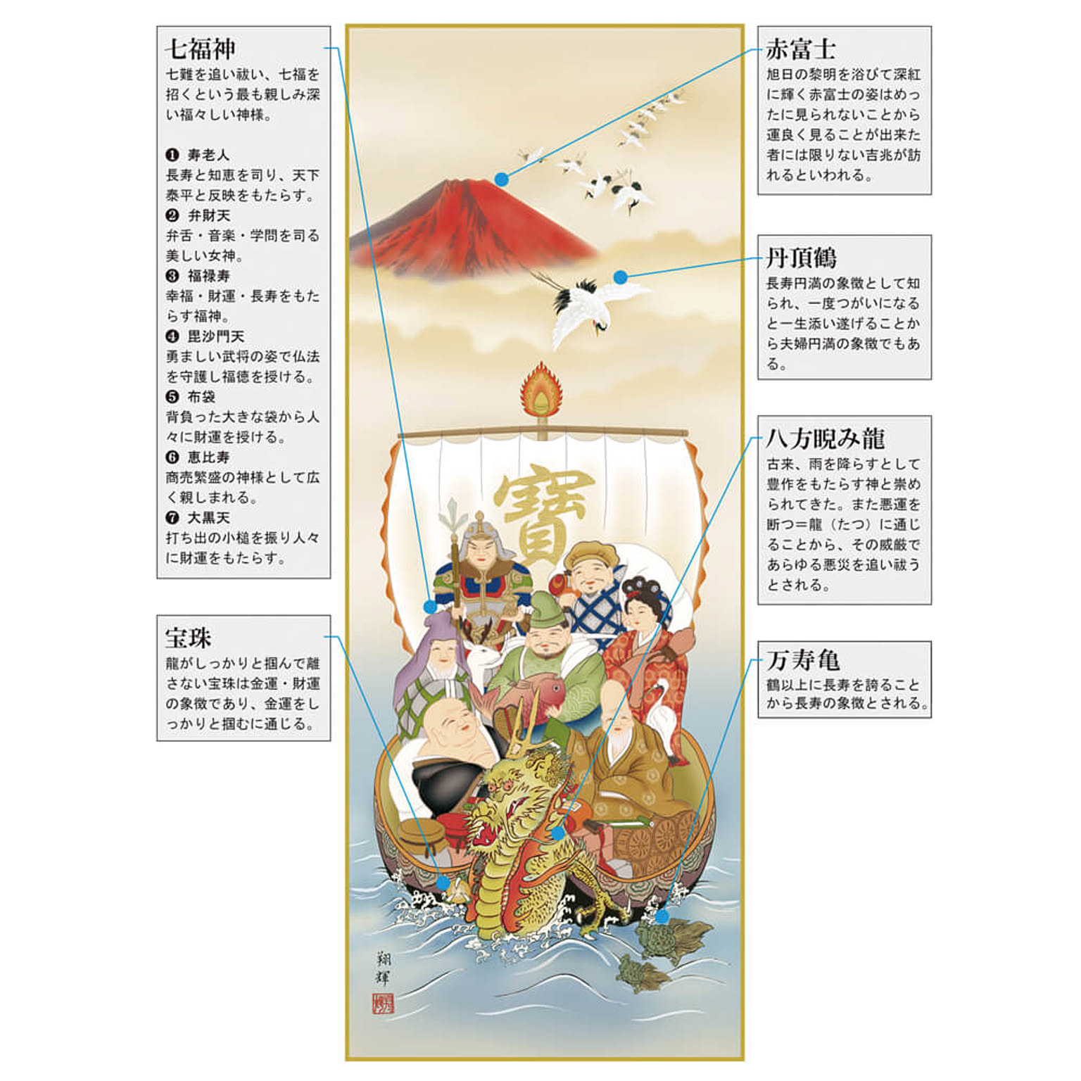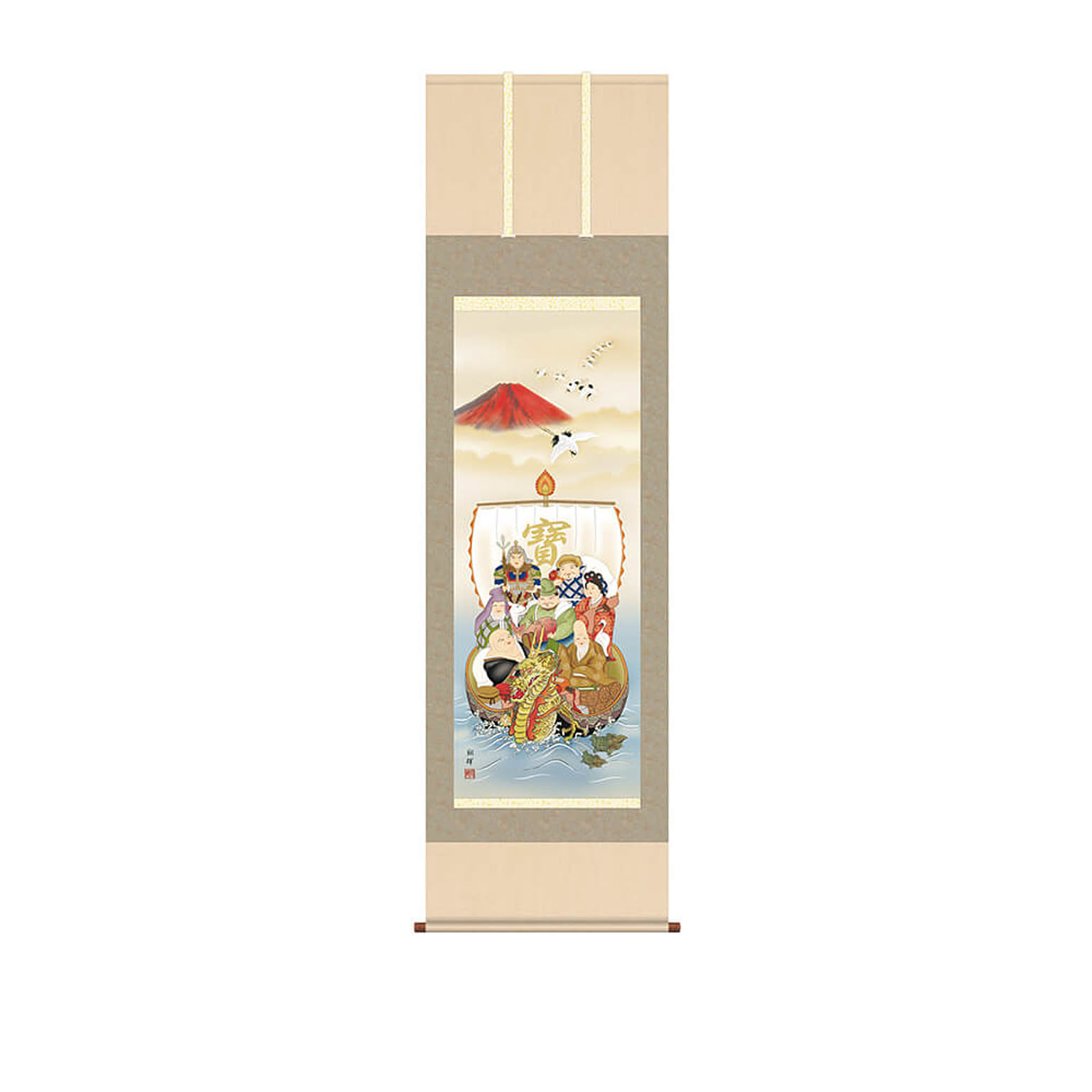 こちらの商品は「尺五サイズ・桐箱付」となります。赤富士を背に純白の丹頂鶴が飛翔し、龍神の船首を持つ宝船には七人の福徳の神様「七福神」が集います。