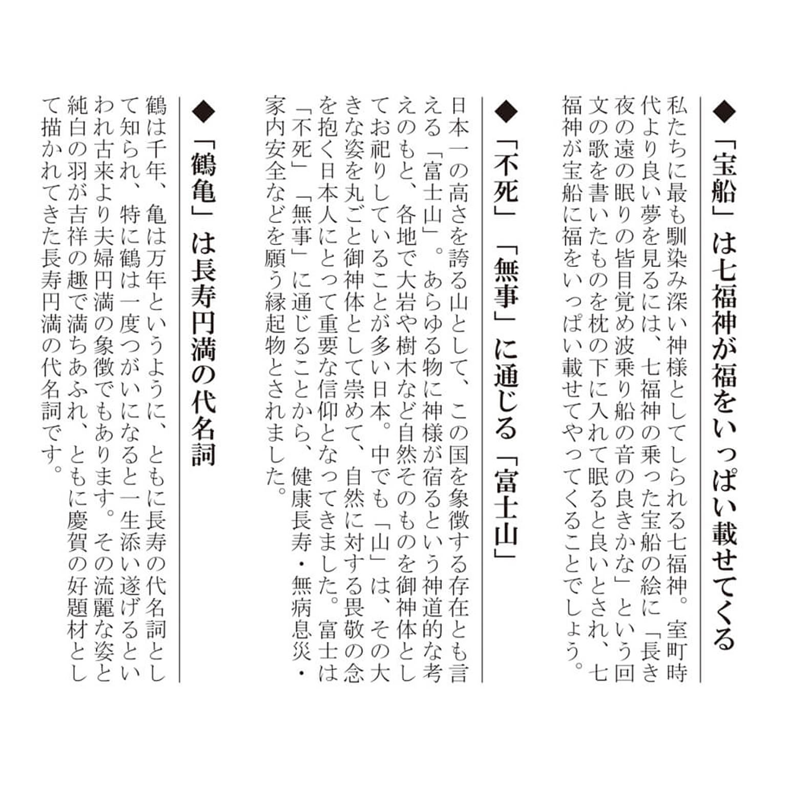 「不死」・「無事」に通じる「富士」や、長寿円満の象徴「鶴亀」、福徳の「七福神」が勢揃いし、床の間に吉祥開運のパワーが満ちあふれます。