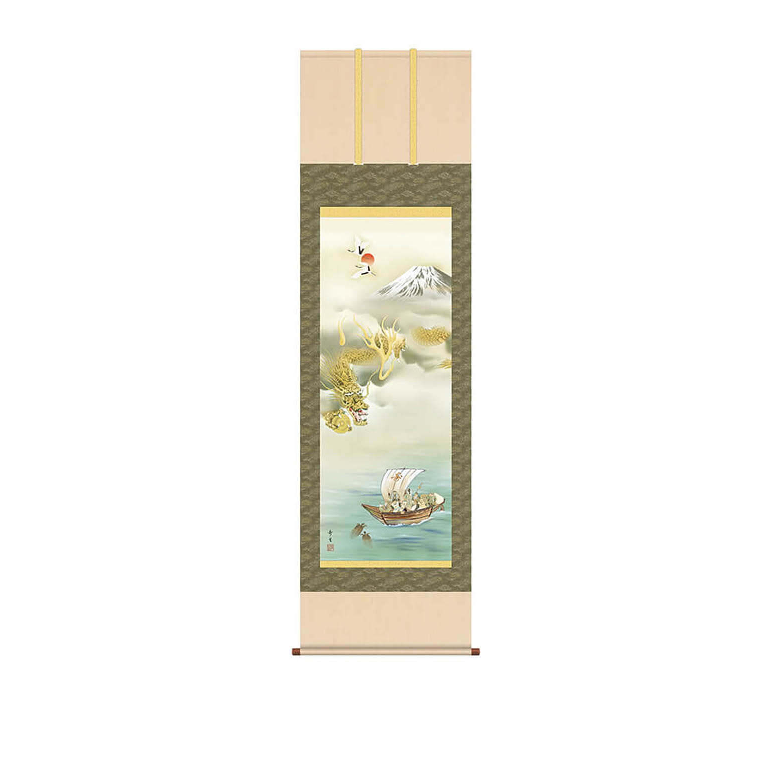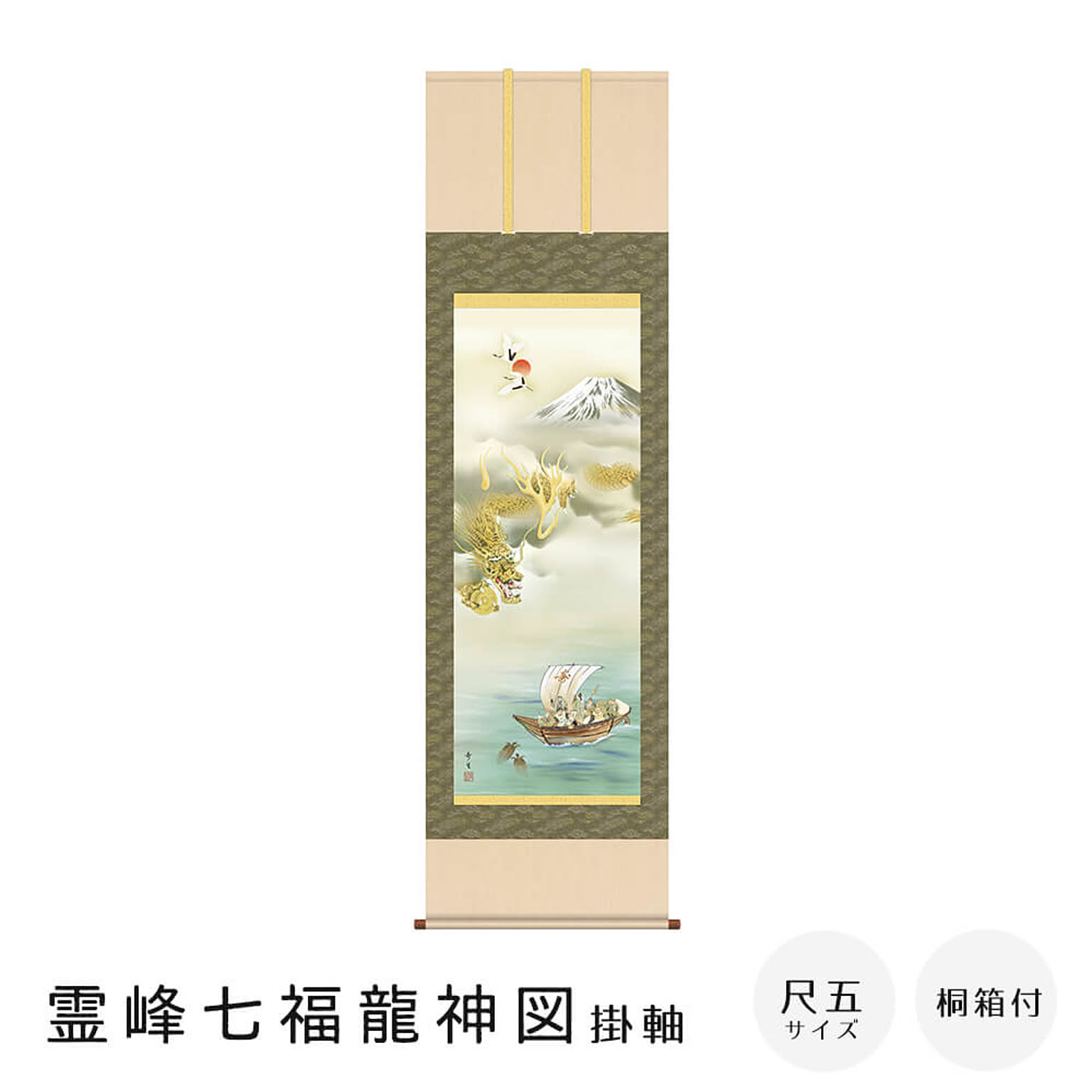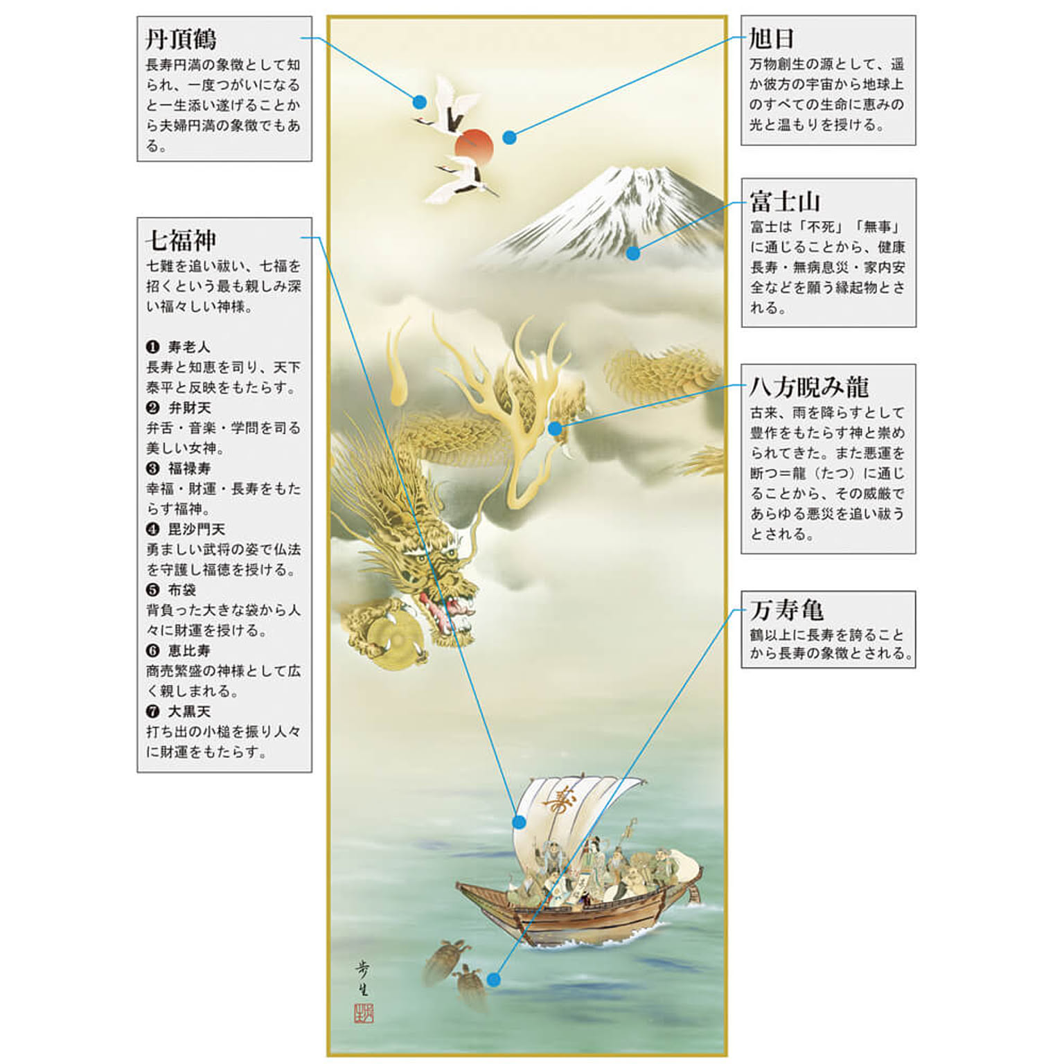 こちらの商品は「尺五サイズ・桐箱付」となります。霊峰富士を背に純白の丹頂鶴が飛翔し、厄災を追い払う龍神の眼下には、福徳の神様「七福神」が集う宝船。