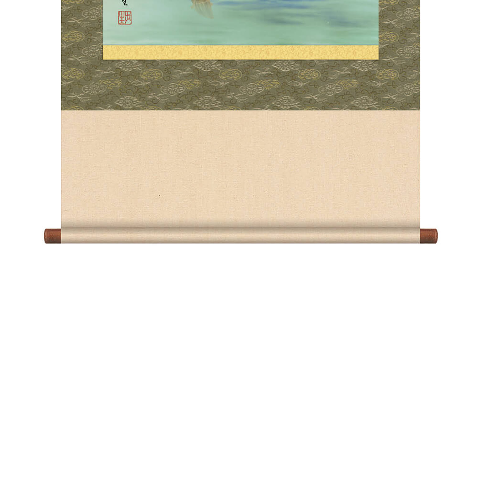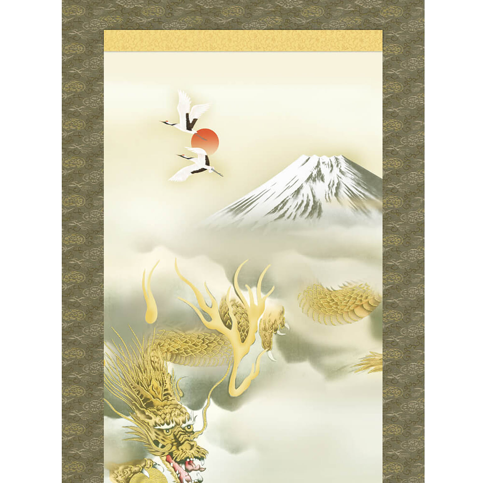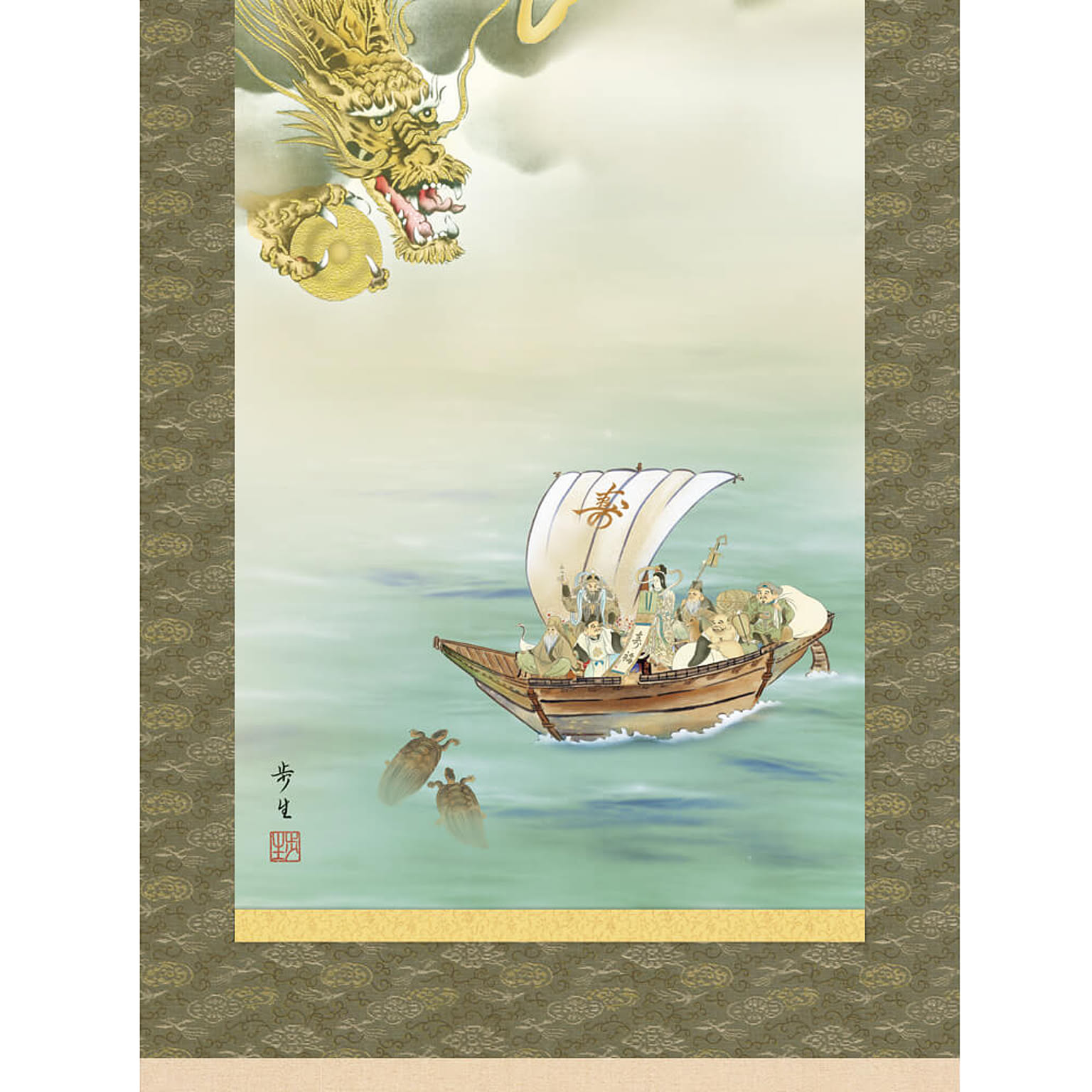 こちらの商品は「尺五サイズ・桐箱付」となります。霊峰富士を背に純白の丹頂鶴が飛翔し、厄災を追い払う龍神の眼下には、福徳の神様「七福神」が集う宝船。