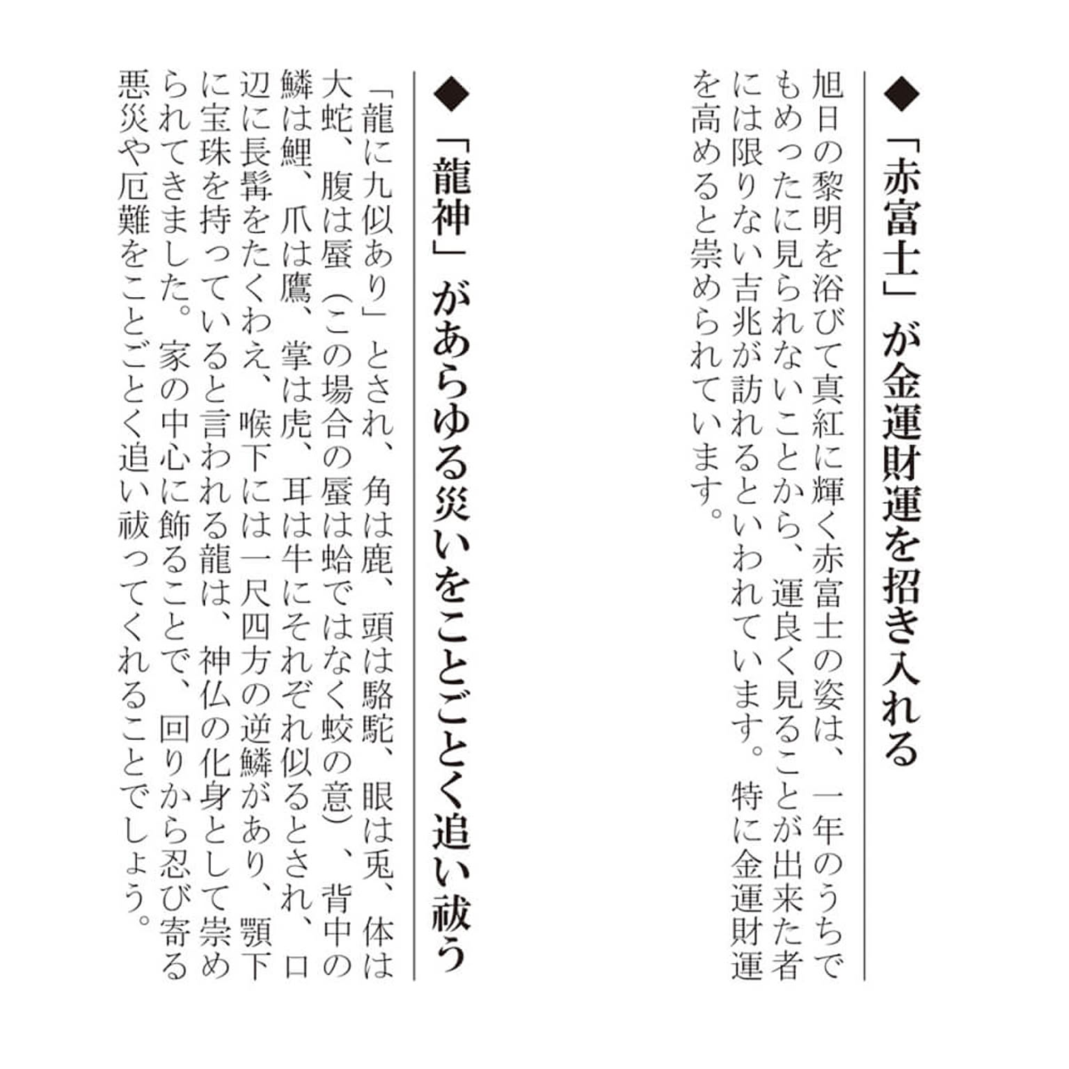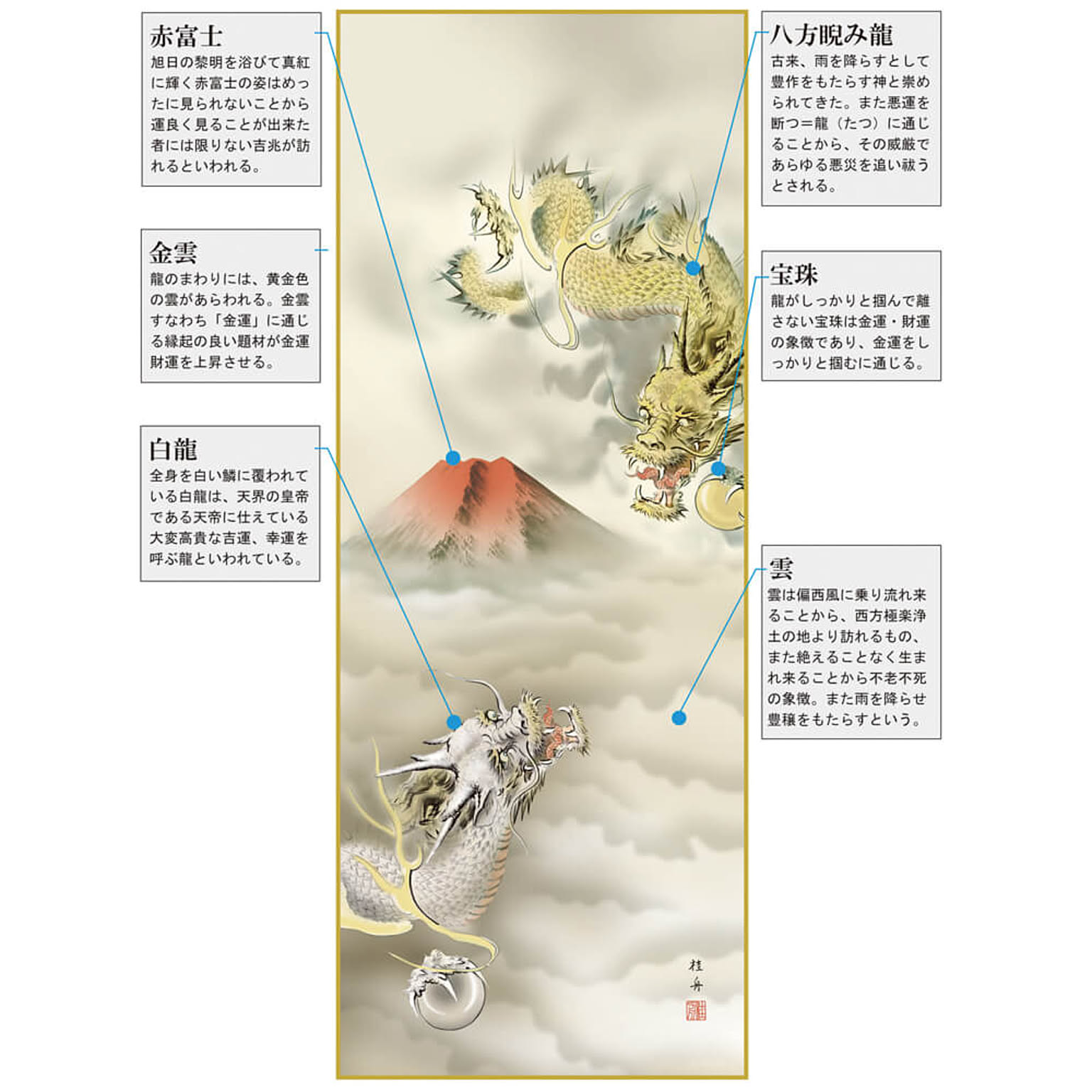 遥か彼方から続く雲海の中を金龍と白龍に乗り現れた恵比寿大黒。優しく微笑む金運・財運の神様と、運良く見ることが出来た者には限りない金運財運が訪れると崇められてきた「赤富士」が作品に彩りを添えます。