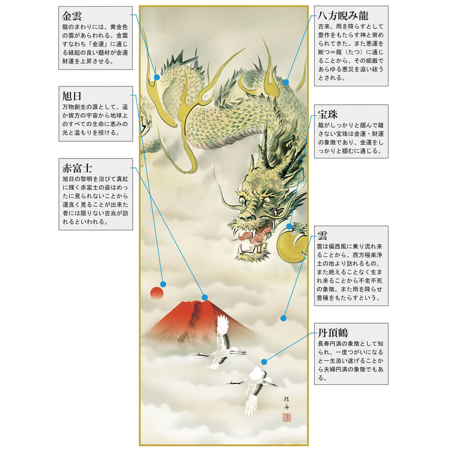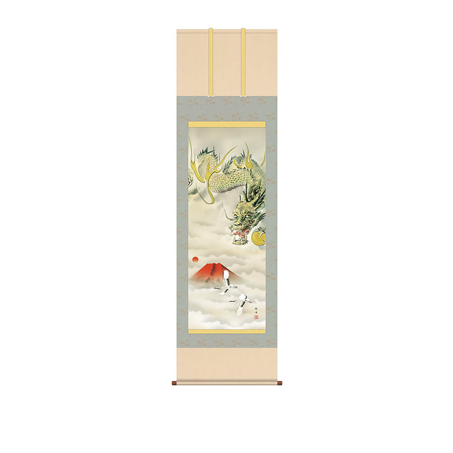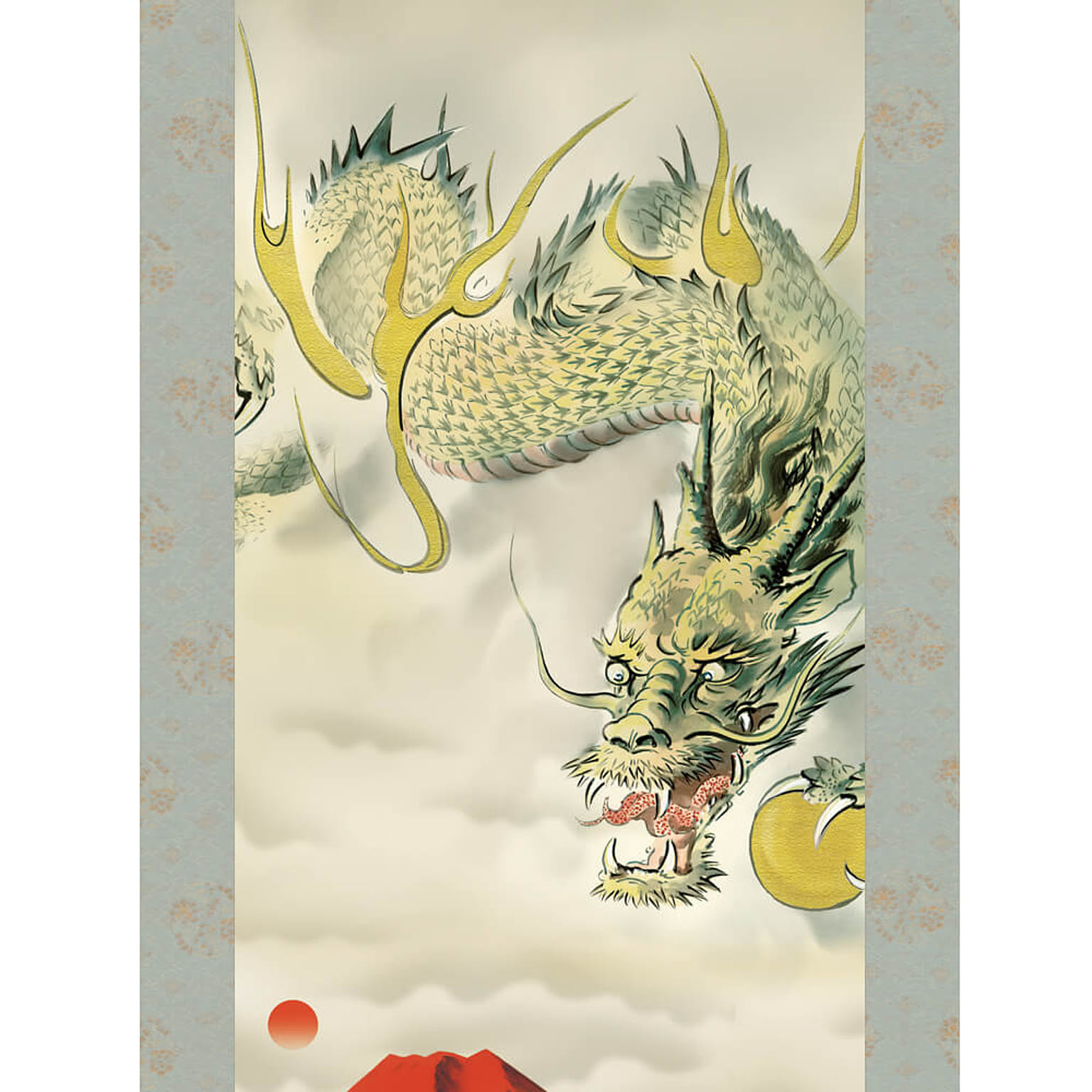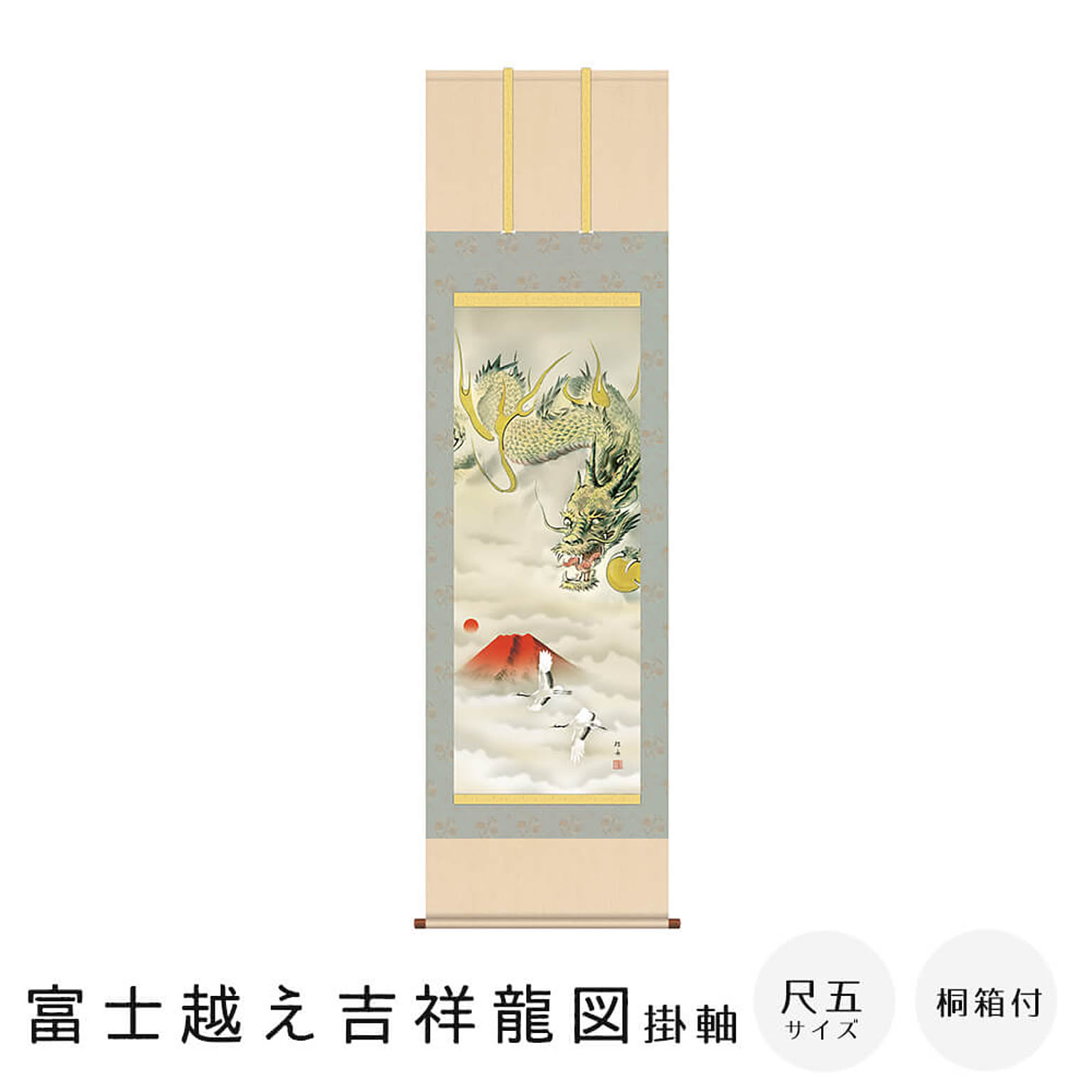 こちらの商品は「尺五サイズ・桐箱付」となります。生命のように燃え上がる旭日を浴び、鮮やかな真紅に染まる霊峰不二を遥か彼方に望み飛翔する龍神。