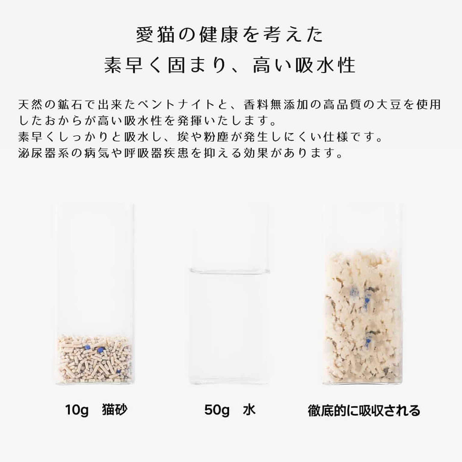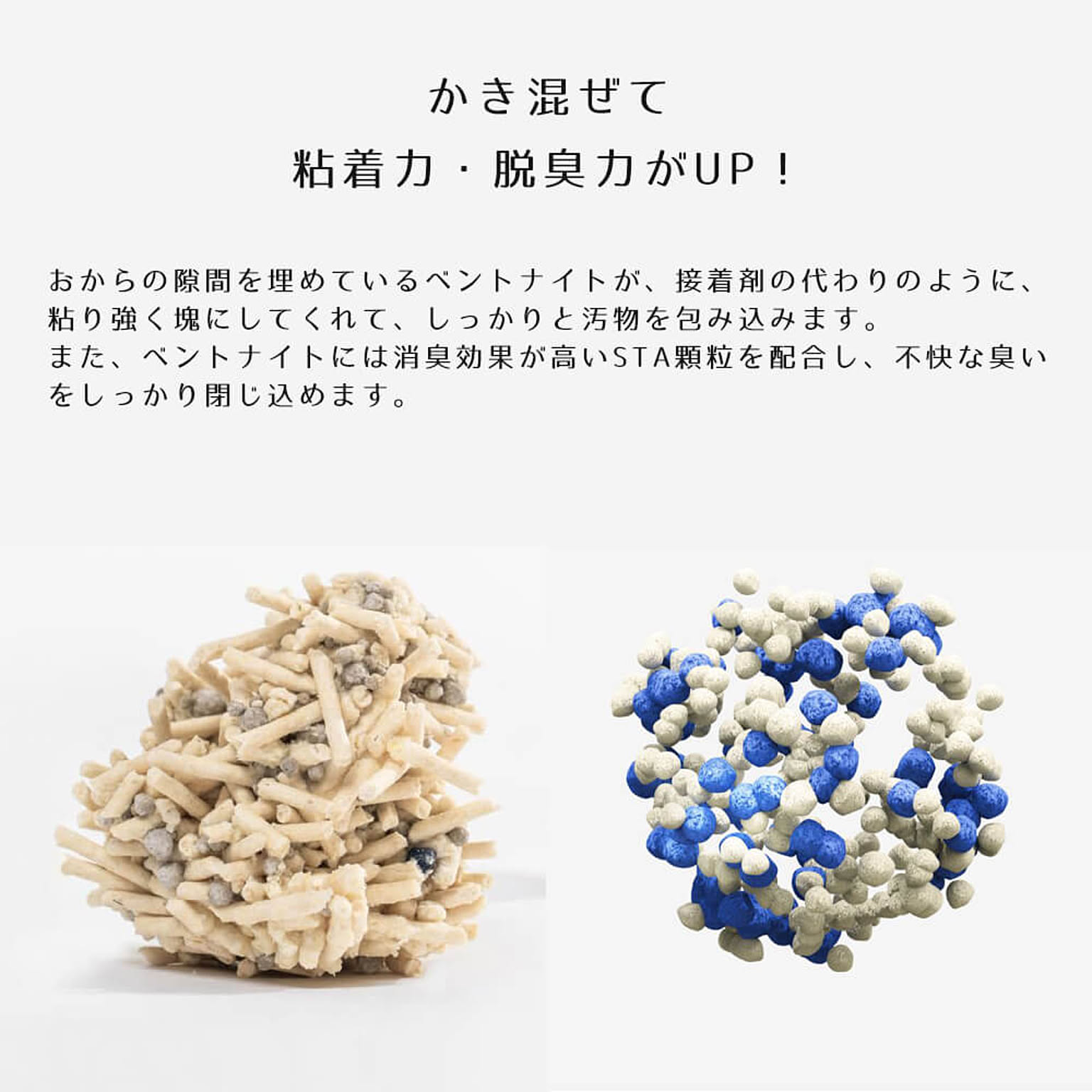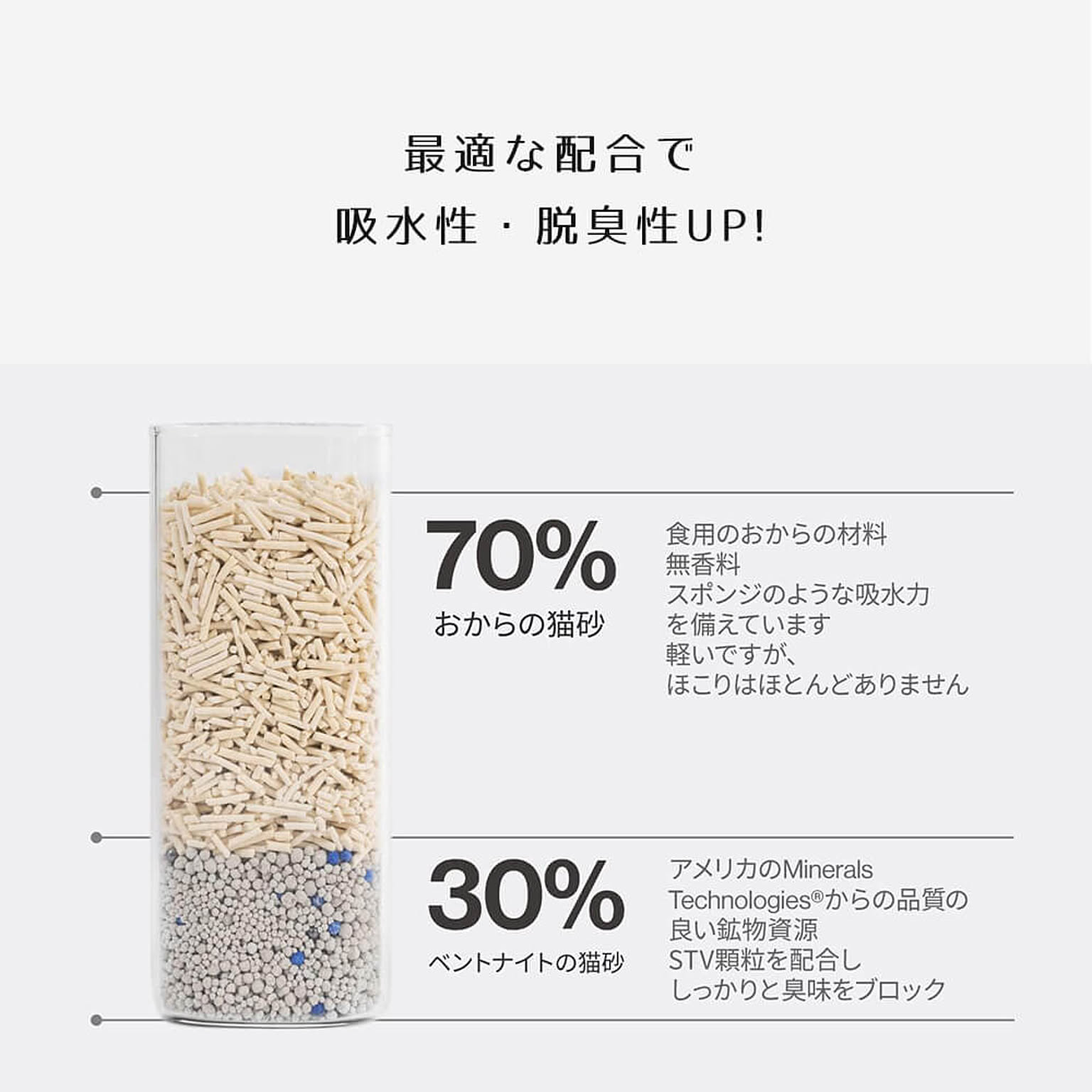 カナダ産の高品質な大豆からとれたおからと、アメリカ産のベントナイトにSTA消臭粒を加えた吸水性・脱臭性に優れたミックス猫砂。