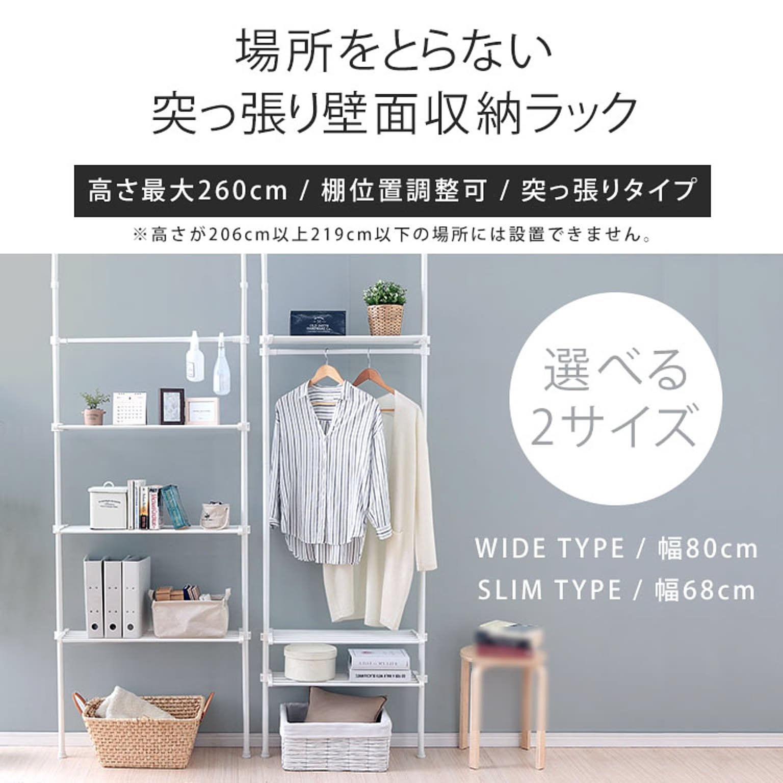 場所をとらない突っ張り壁面収納ラックです。天井に突っ張るだけの省スペース型。リビングやキッチン、洗面所など様々な場所に使用でき、収納範囲が広がります。奥行約26.5cmのスリム設計なので複数並べても場所を取らず、圧迫感もなくたっぷり収納できます。 ※高さが206cm以上、219cm以下の場所へは取り付けできません
