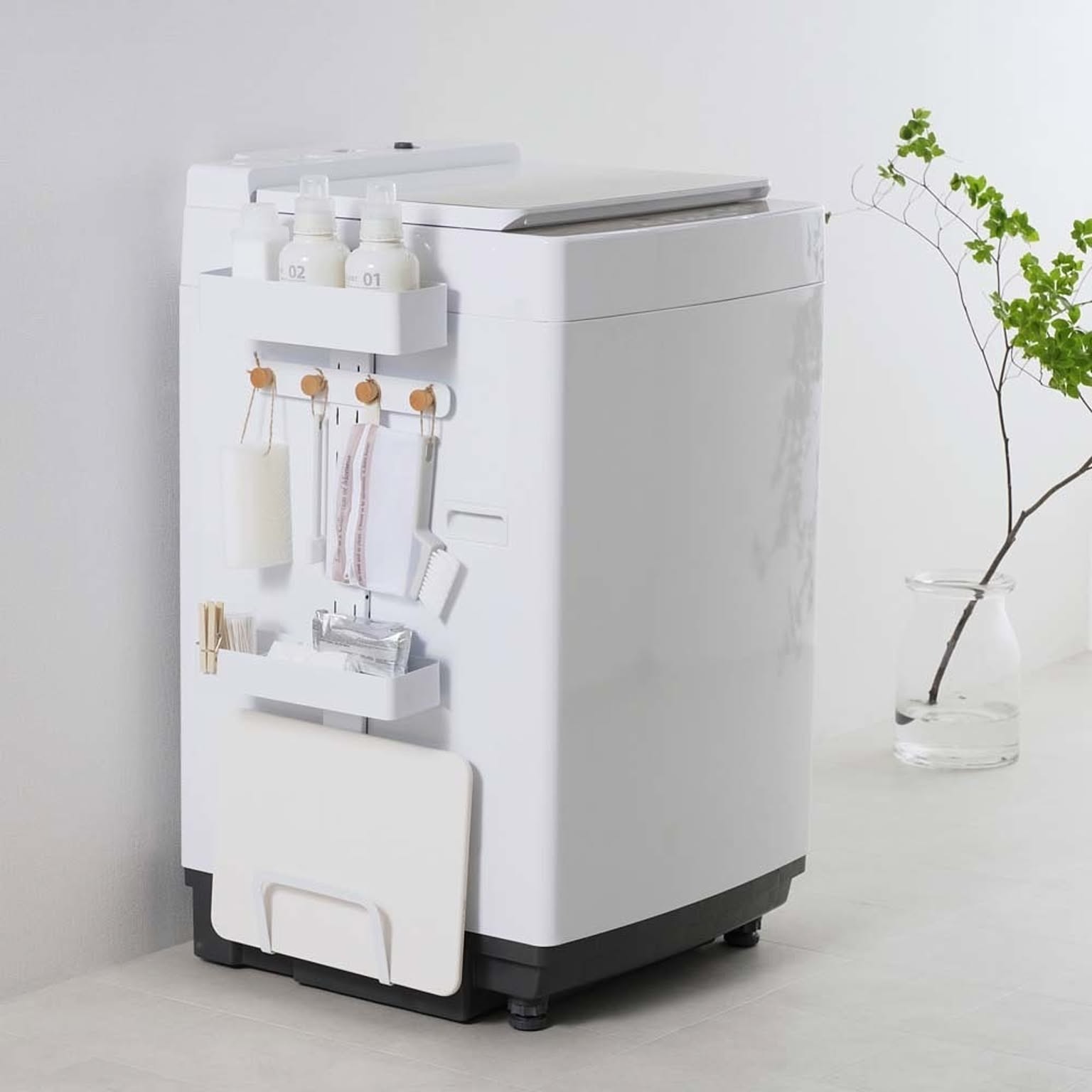 洗濯機周りの小物を収納できるランドリーマルチラックです。マグネット仕様で洗濯機の側面に簡単に取り付けられます。デッドスペースになりがちな洗濯機周りを収納スペースに変えられます。ボックスは洗剤や柔軟剤、フックは洗濯ネットや掃除用具、スタンドは体重計や珪藻土マットなどが収納できます。ボックス、木製フック、スタンドはお好みの高さに組み替えが可能です。木とスチールの組み合わせで上質なデザインです。滑り止めシリコンシートにより重さによるズレを防止します。お客様組み立てとなります。