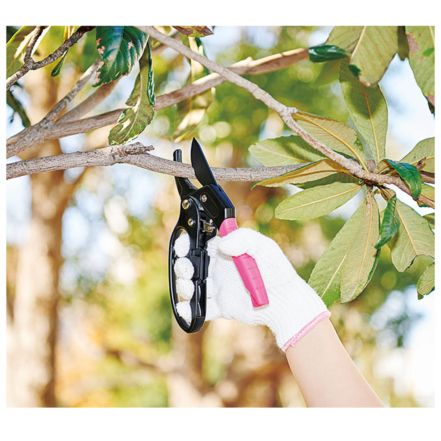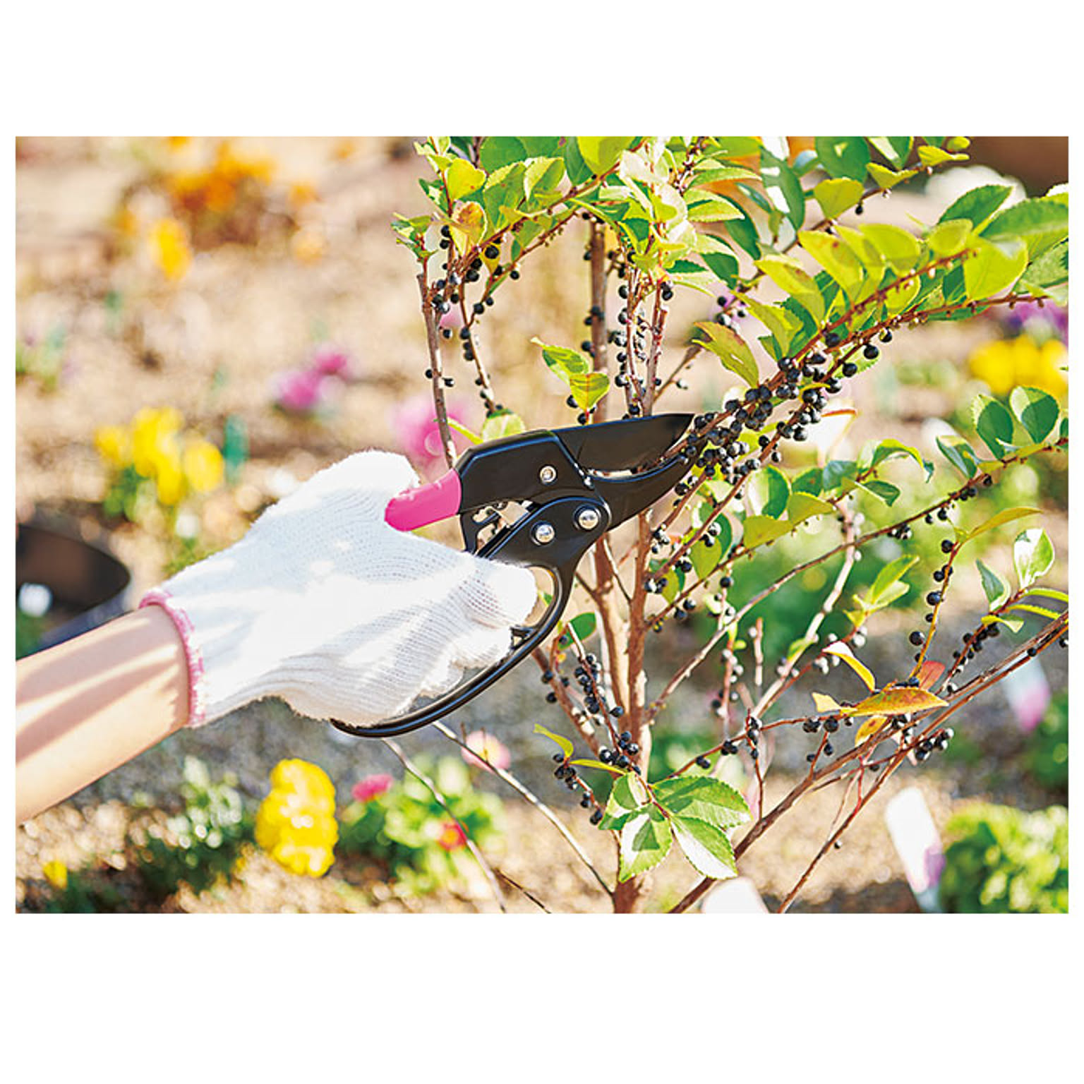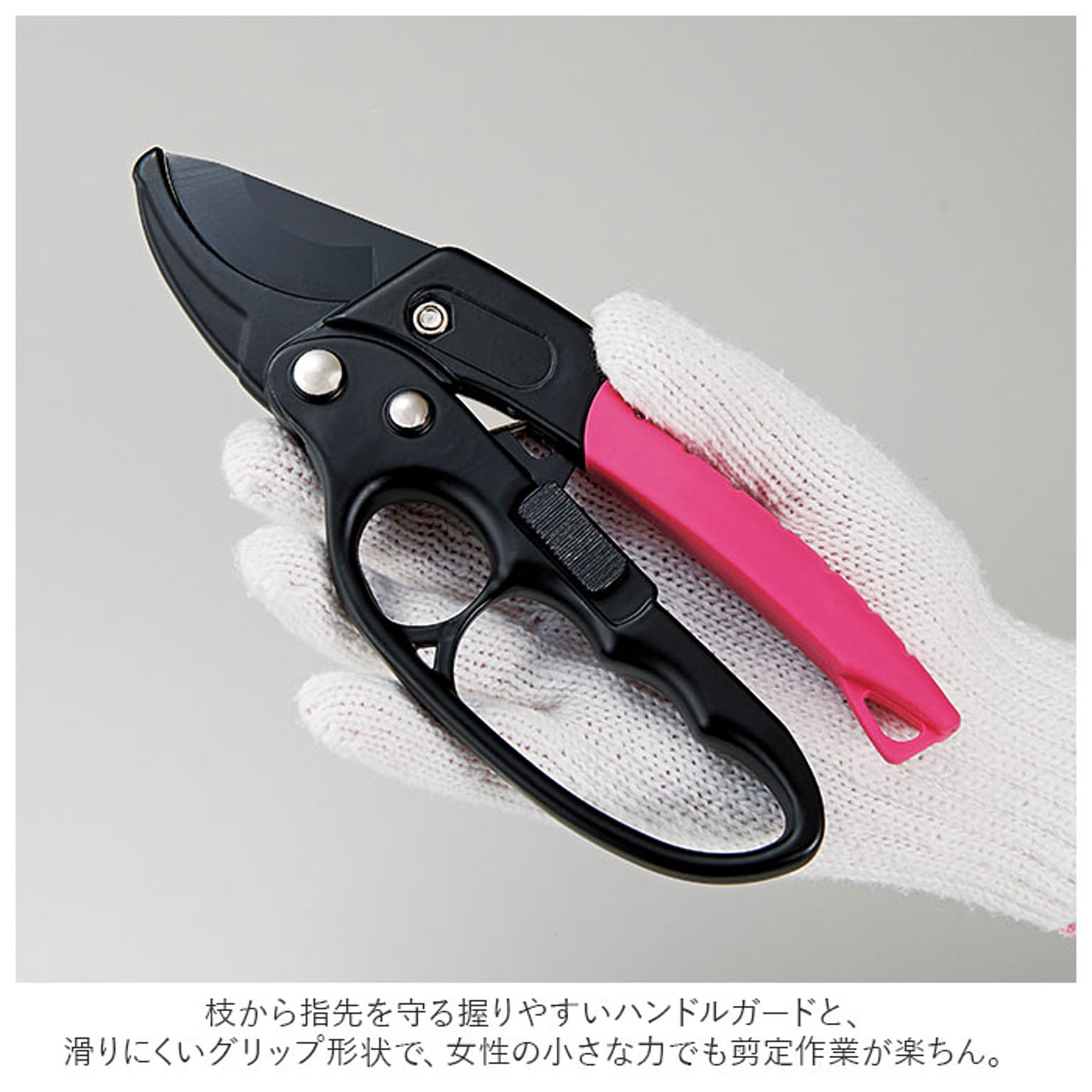 ・枝から指先を守る握りやすいハンドルガードと、滑りにくいグリップ形状で、女性の小さな力でも剪定作業が楽ちん。