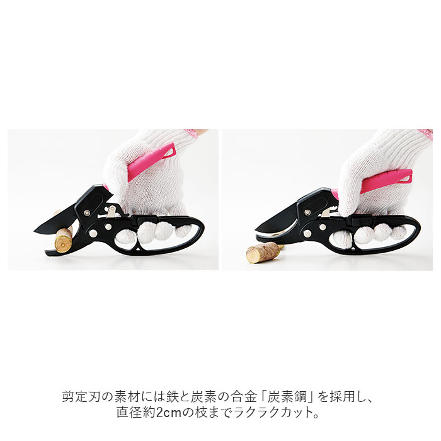 ・剪定刃の素材には鉄と炭素の合金「炭素鋼」を採用し、直径約2cmの枝までラクラクカット。