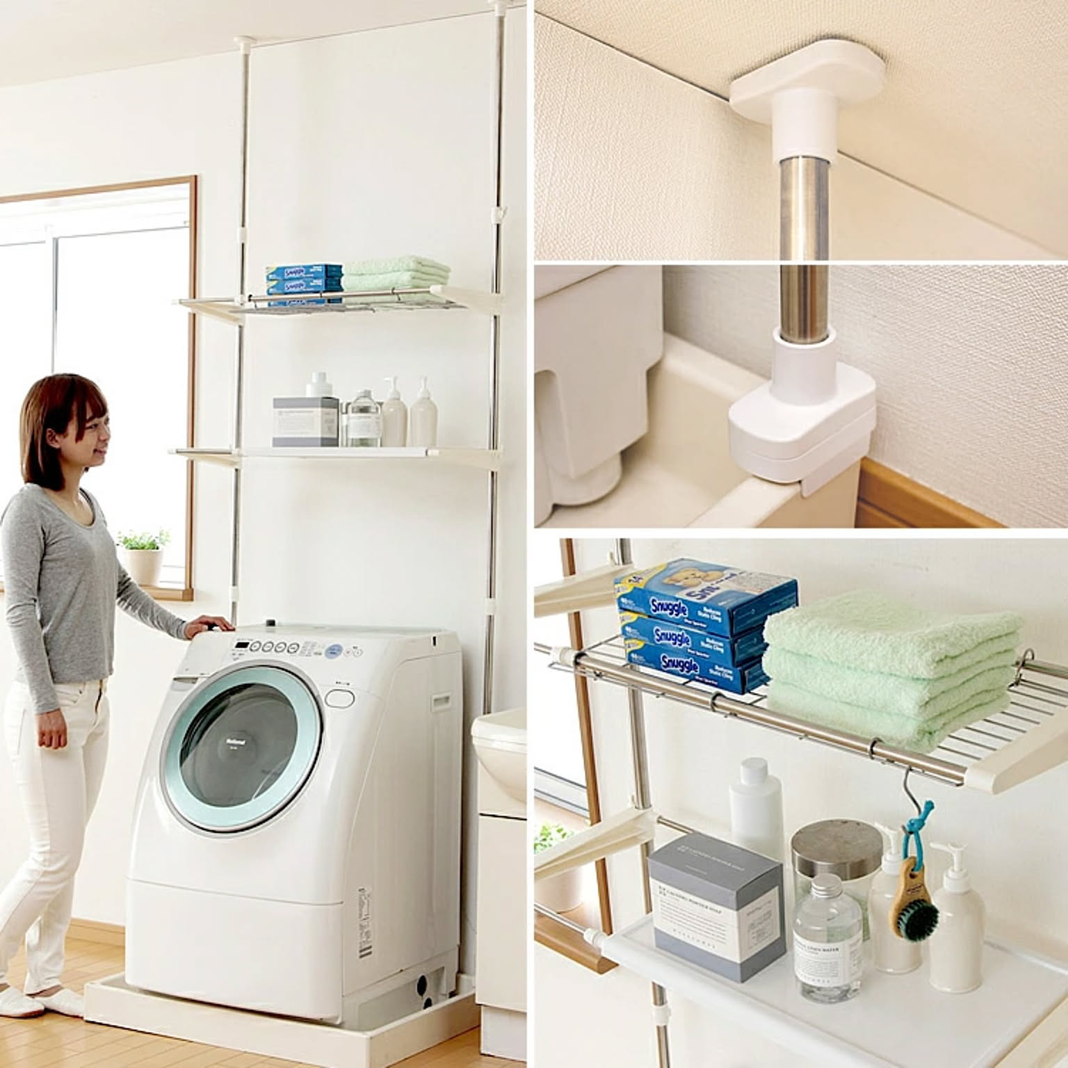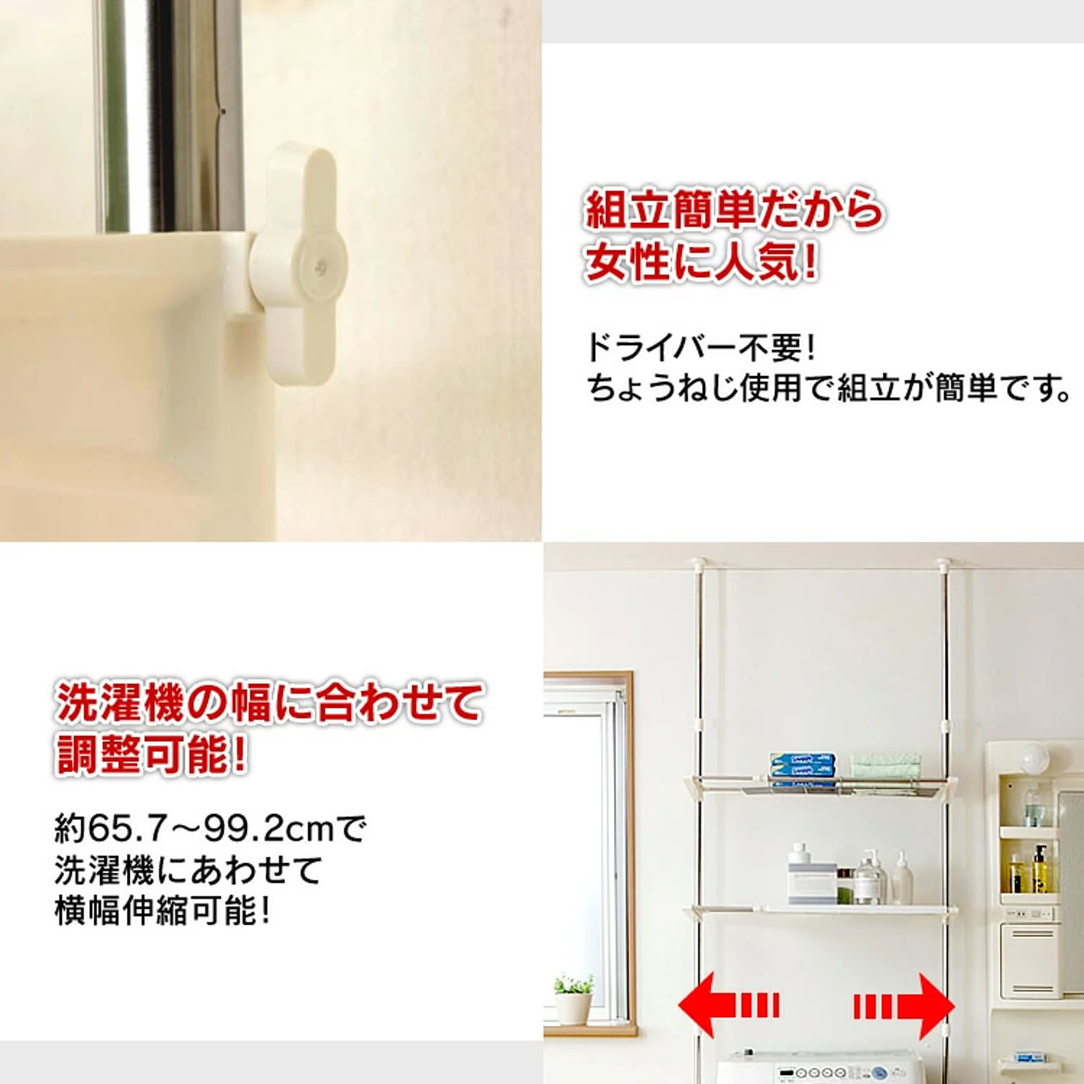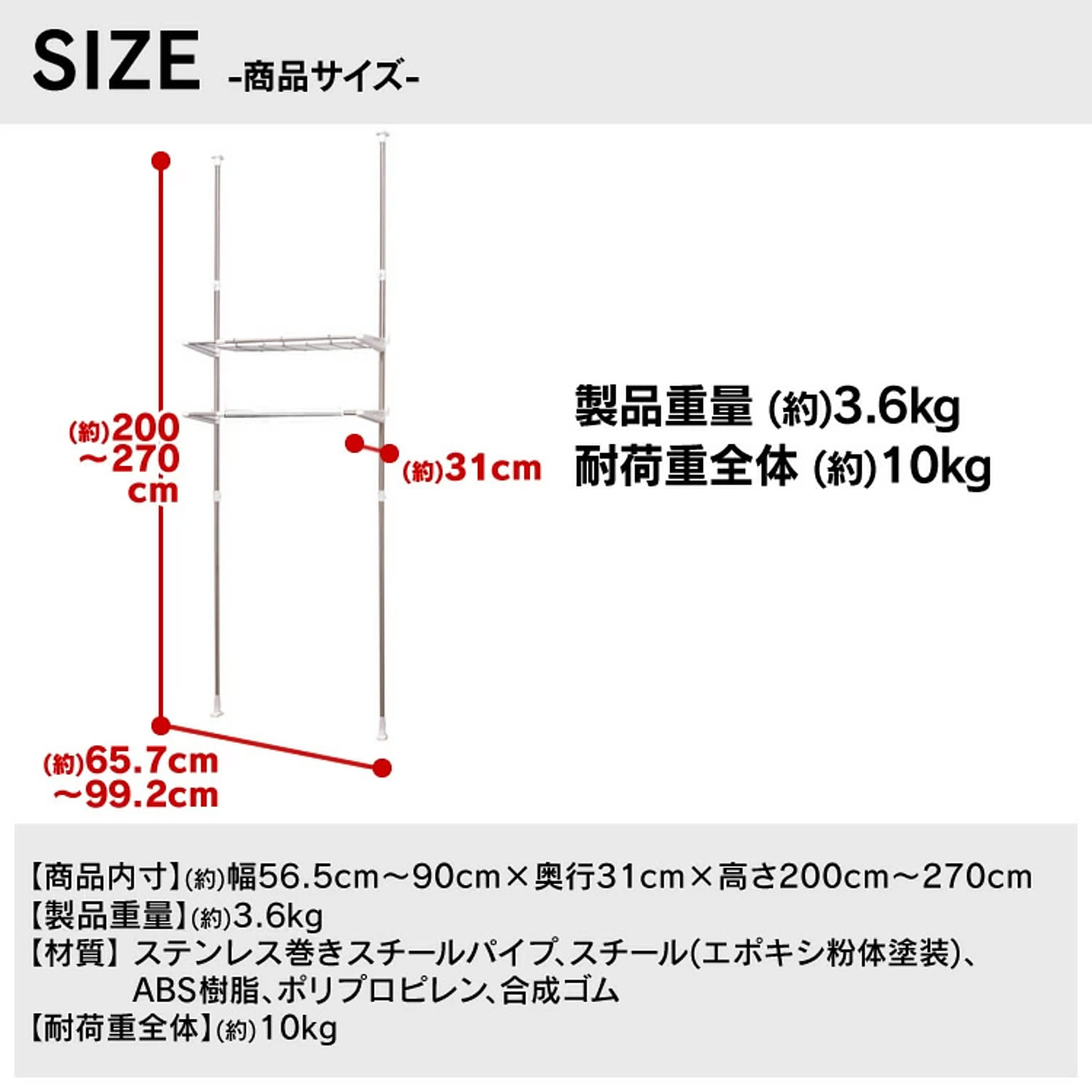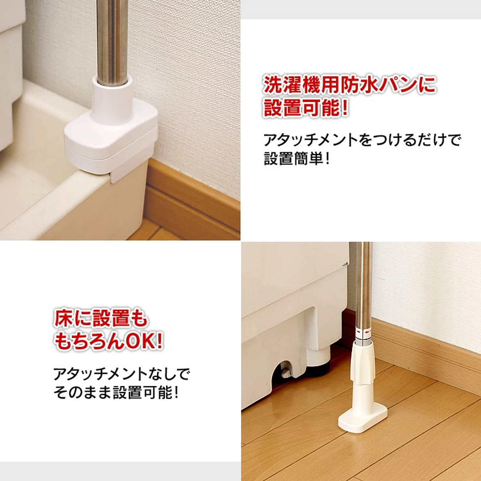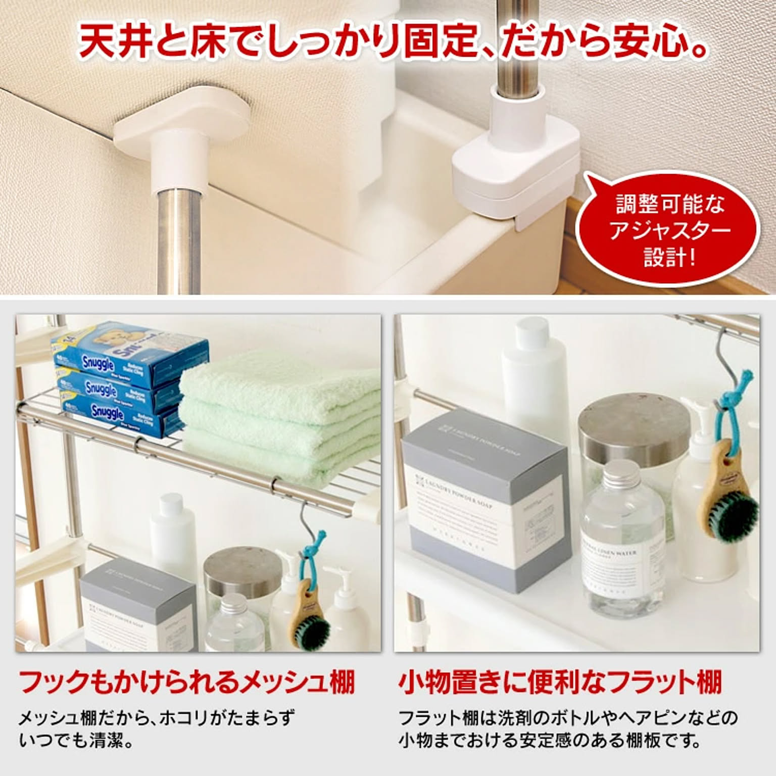 場所を選ばずどこでも使える突っ張りタイプのランドリーラックです。2枚の棚を有効活用できます。(メッシュ棚:タオルなどの小物置きに、フラット棚:洗剤などの小物置きに)洗濯パンの上に取り付け可能です。ネジの数を半分にしため(当社従来比)組み立てが簡単です。