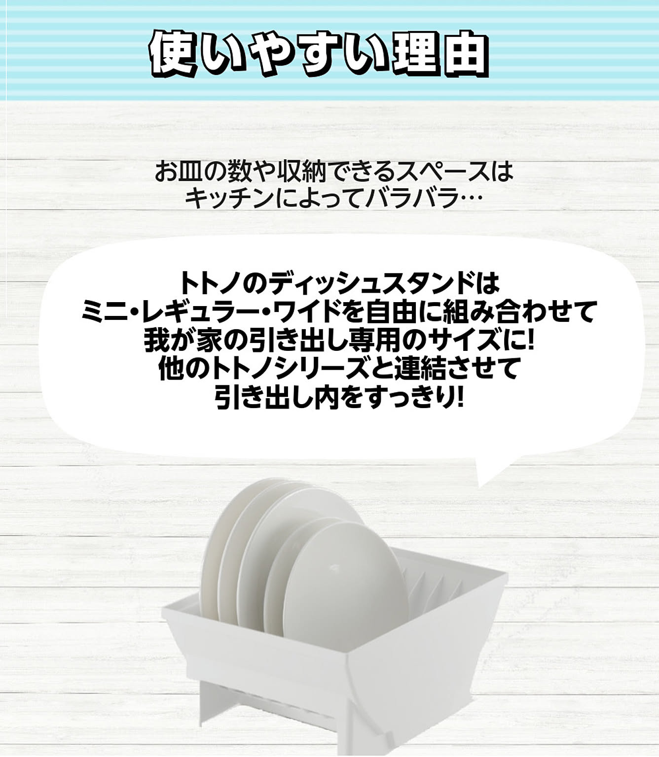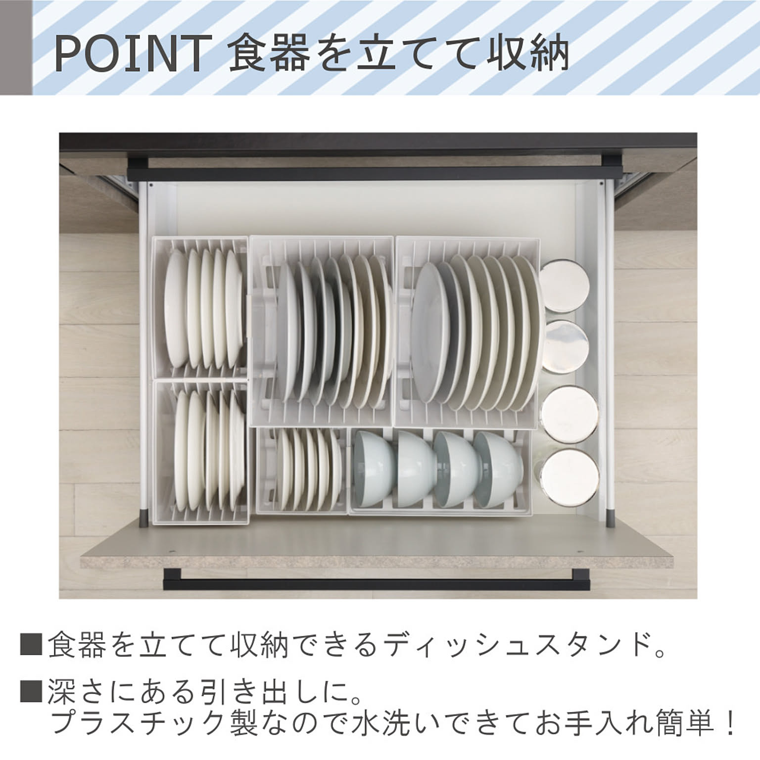 ●引き出しの整理整頓に便利です ●食器類を立てて収納することができます ●同じ高さのトトノシリーズと連結できます ●プラスチック製なので、水洗いできてお手入れが簡単です ●用途に合わせて縦置き・横置きが可能です ●小皿から大皿まで一緒に収納できます