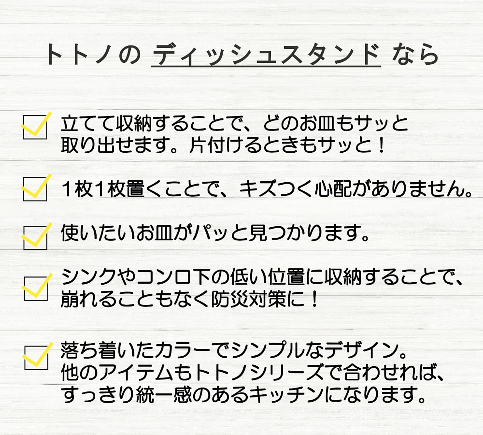 SNSで話題のキッチン整理収納「トトノ」シリーズです。 深引き出しの整理整頓に最適です。 食器を立てて収納するディッシュスタンドです。 同じ高さのトトノシリーズと連結できます。 プラスチック製なので、水洗いできてお手入れが簡単です。 用途に合わせて縦置き・横置きが可能です。 小皿から大皿まで一緒に収納できます。