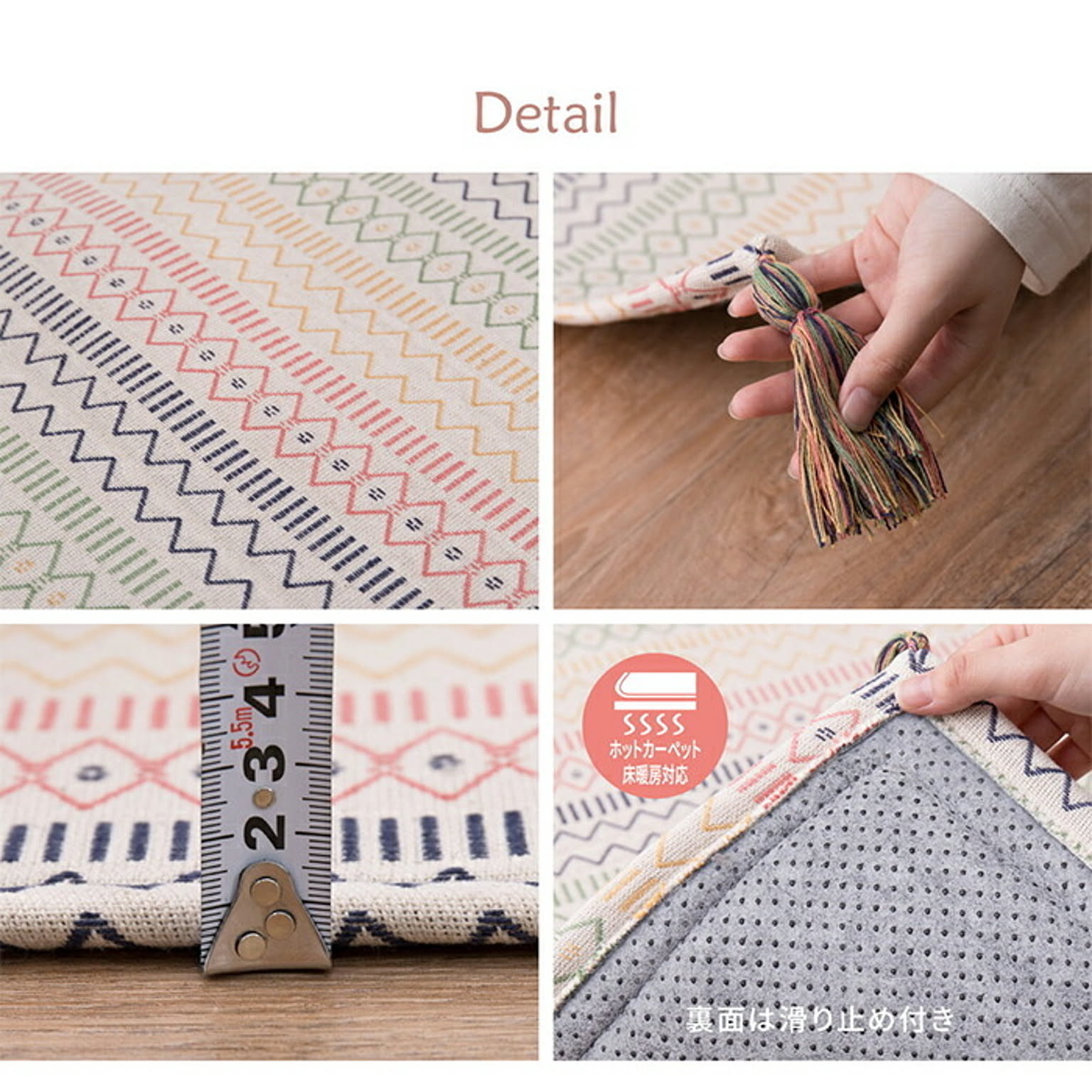 さらっとした触り心地とインド綿ならではの素朴な風合いが魅力のラグ。かわいいマルチカラーでお部屋がパッと明るい印象に。天然素材で肌にやさしく、通気性がよく保温性にも優れたインド綿は、オールシーズン快適にお使いいただけます。裏面には滑り止めが付いているのでズレにくく、洗濯機で丸洗いOKだから汚れても安心。お子さまやペットと暮らすご家庭にもおすすめです。