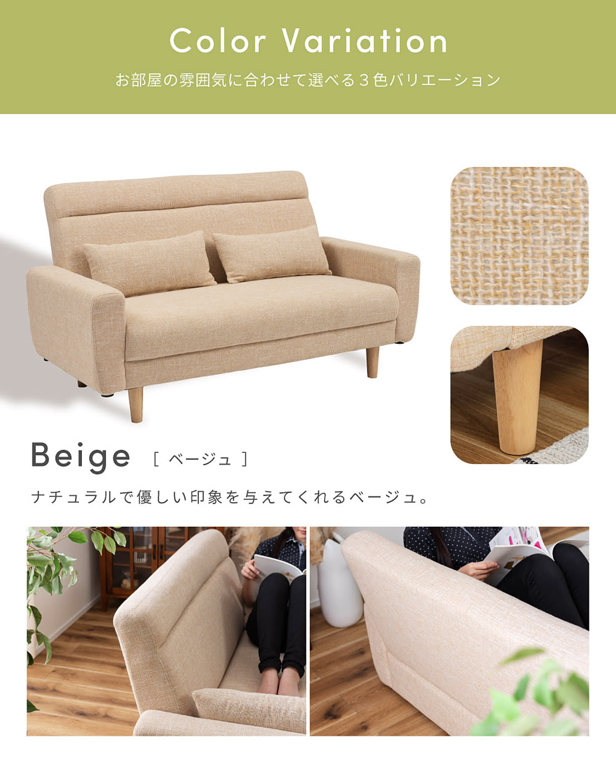 肘掛けが付いているため、立ち座りするときや、ゆったりくつろぎたいときに大活躍してくれます。