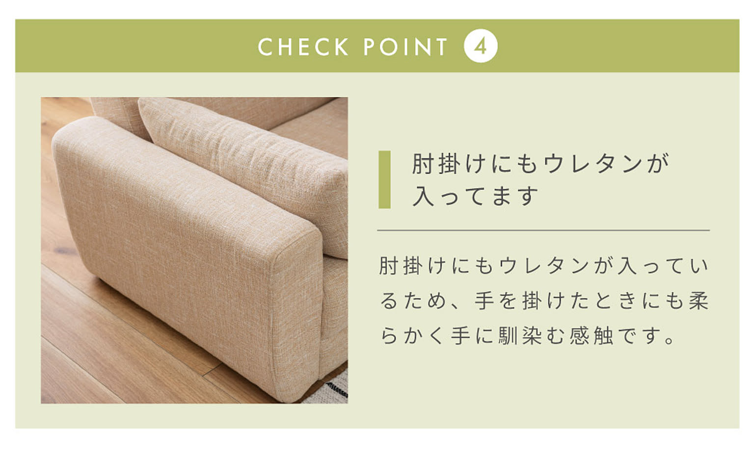 肘掛けにもウレタンが入っているため、手を掛けたときにも柔らかく手に馴染む感触です。
