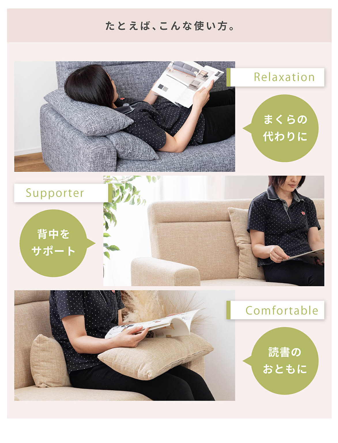 使いやすいサイズのクッションが2個も付属されており、まくら代わりにしたり腰をサポートする用のクッションとして活躍してくれます。