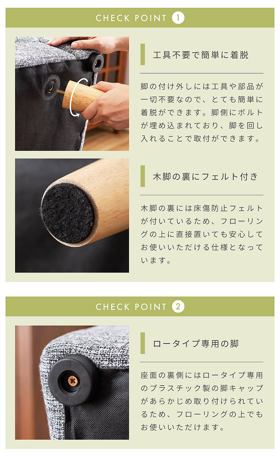 座面の裏側にはロータイプ専用のプラスチック製の脚キャップがあらかじめ取り付けられているため、フローリングの上でもお使いいただけます。
