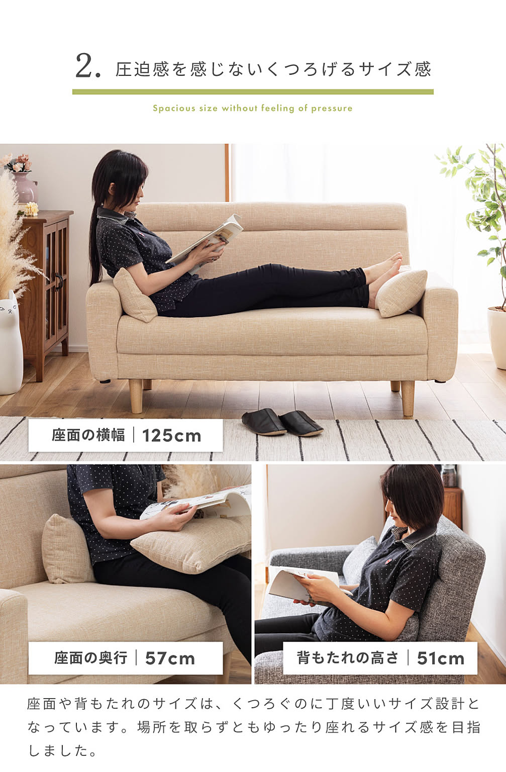 座面や背もたれのサイズは、くつろぐのに丁度いいサイズ設計となっています。