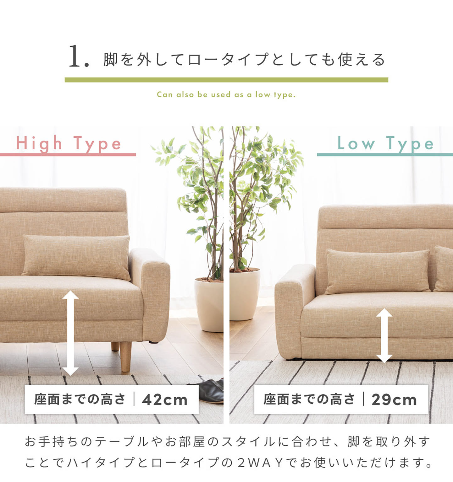 お手持ちのテーブルやお部屋のスタイルに合わせ、脚を取り外すことでハイタイプとロータイプの2WAYでお使いいただけます。