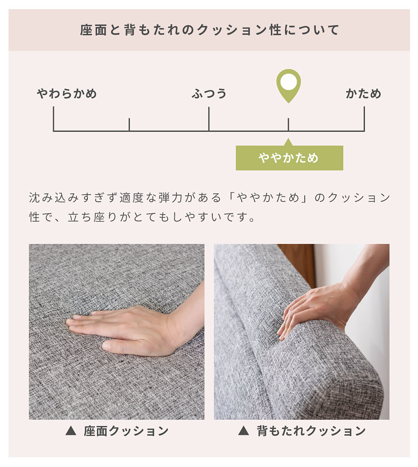 沈み込みすぎず適度な弾力がある「ややかため」のクッション性で、立ち座りがとてもしやすいです。