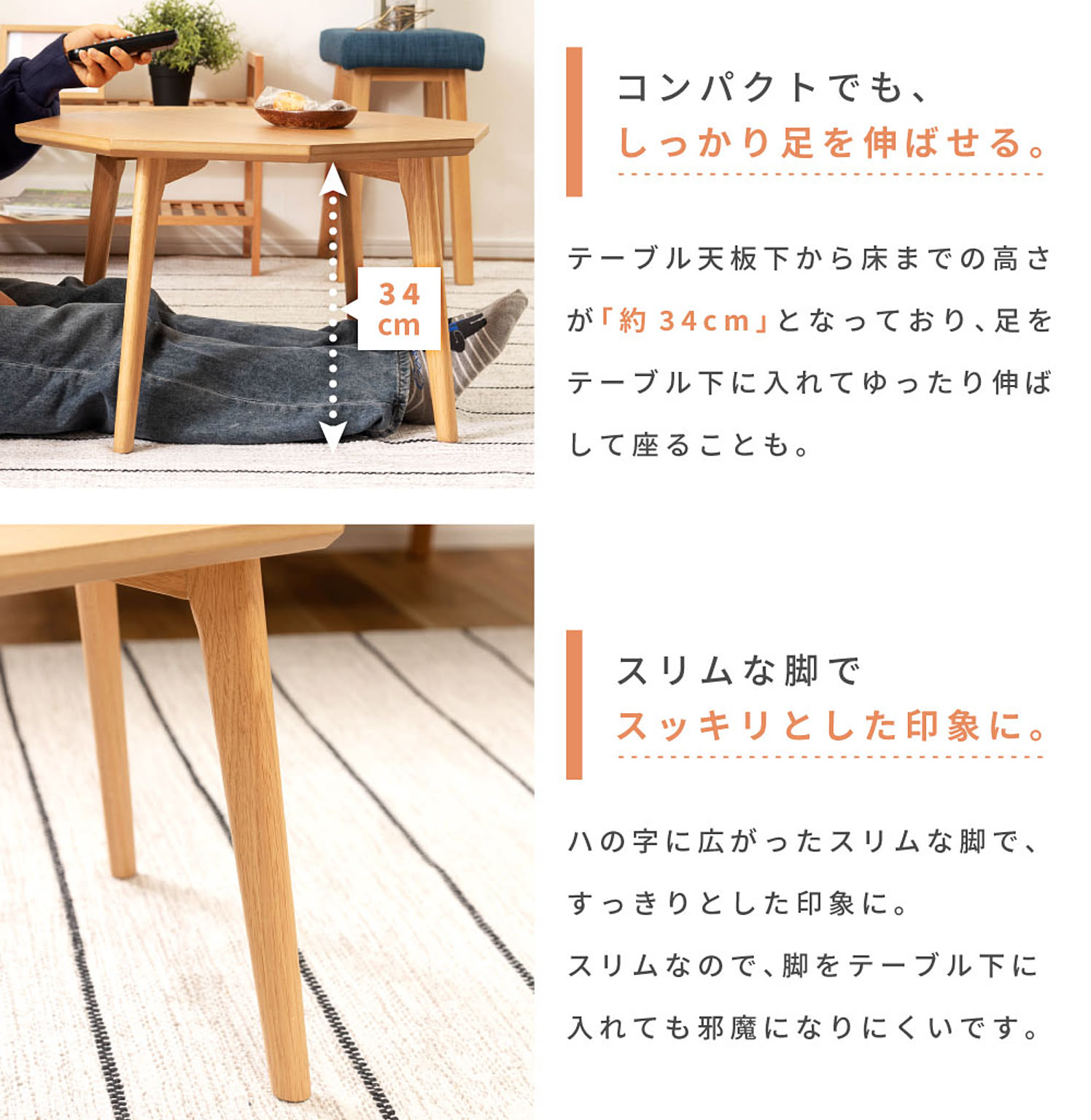 テーブル天板下から床までの高さが「約34cm」となっており、脚をテーブル下に入れてゆったり伸ばして座ることも。