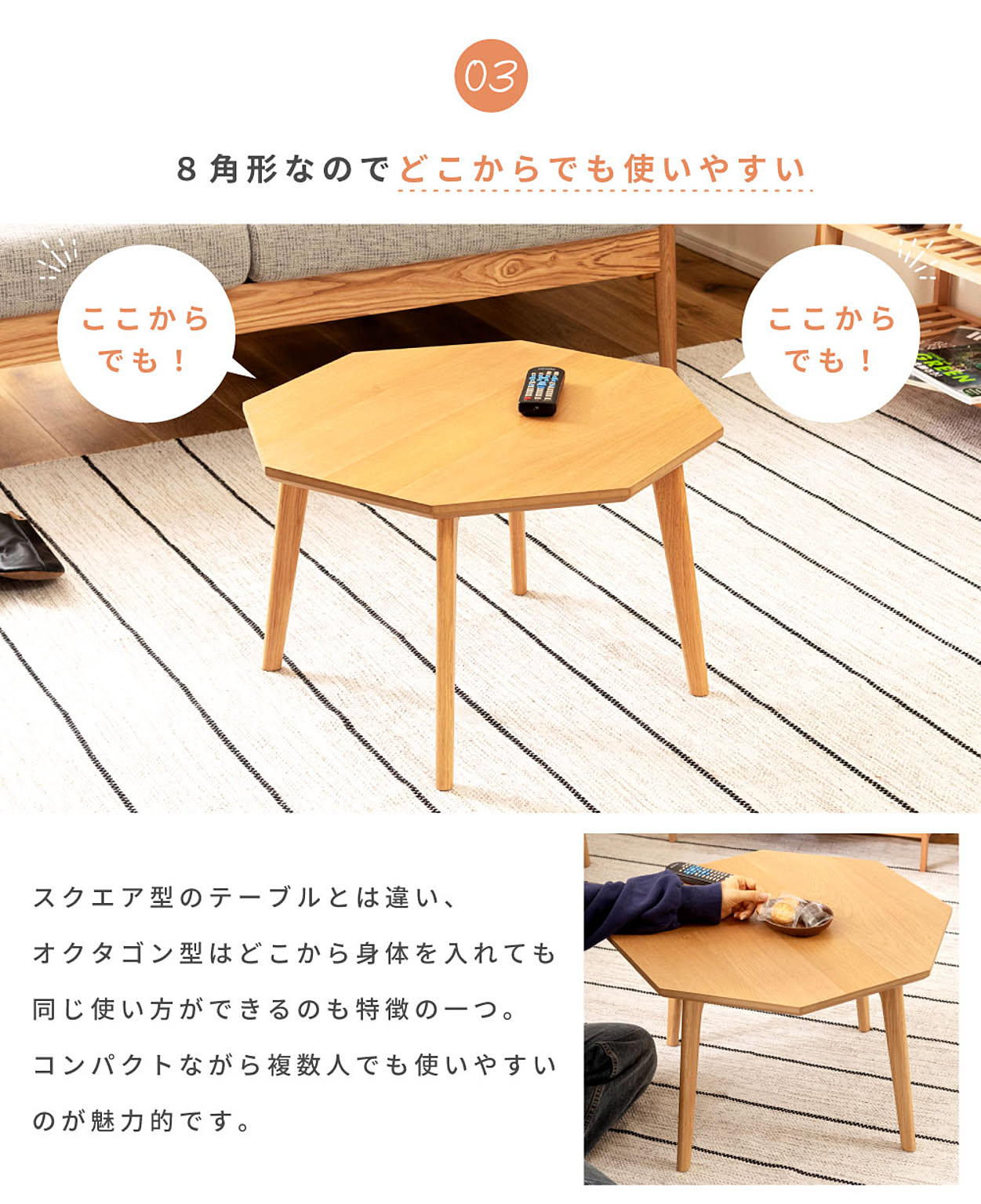 スクエア型のテーブルとは違い、オクタゴン型はどこから身体を入れても同じ使い方ができるのも特徴の一つ。