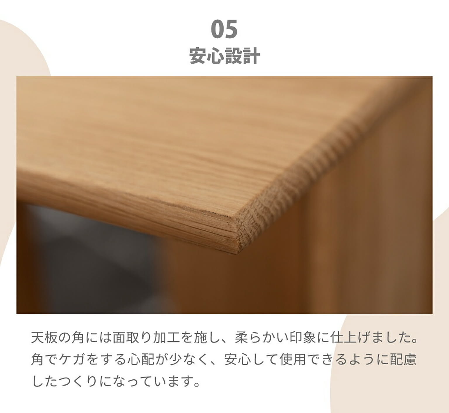 角でケガをする心配が少なく、安心して使用できるように配慮したつくりになっています。