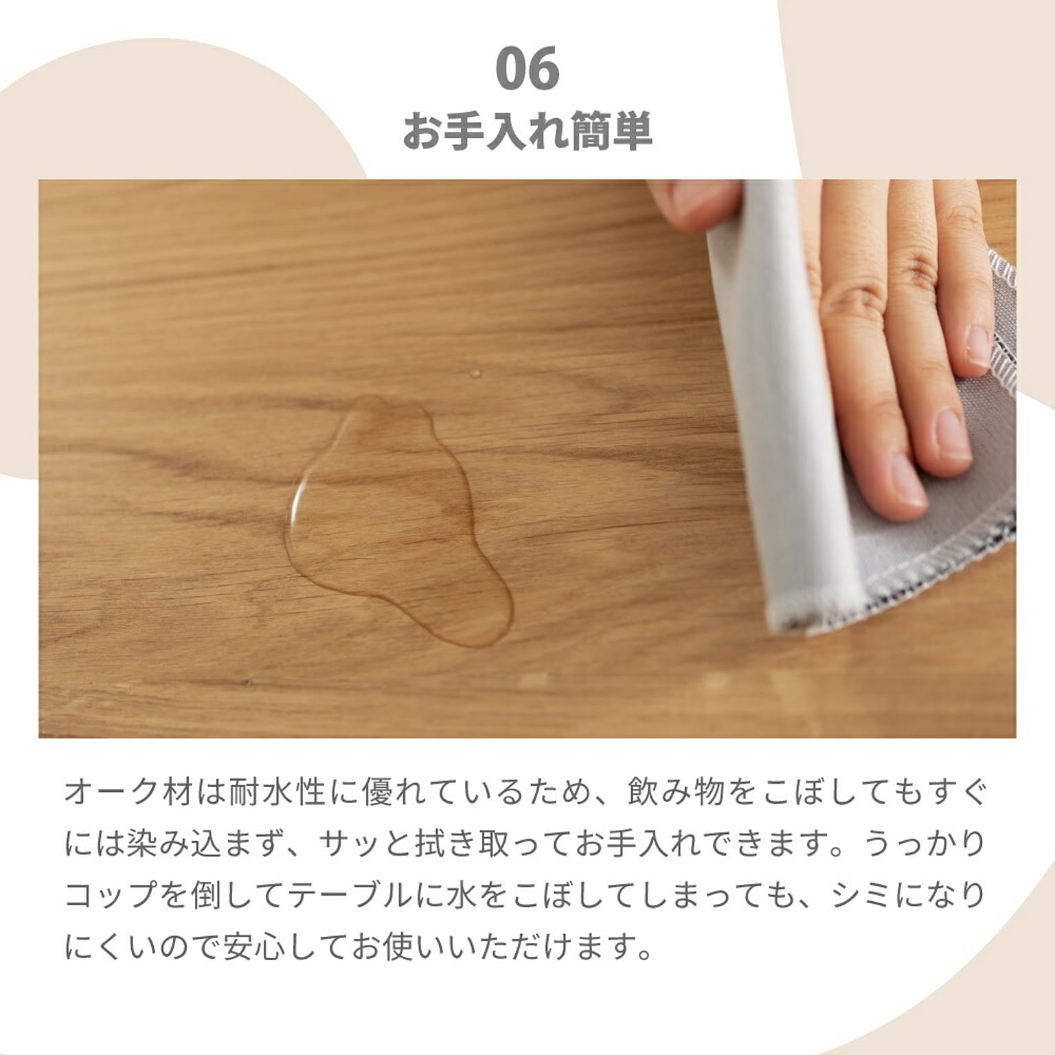 オーク材は耐水性に優れているため、飲み物をこぼしてもすぐには染み込まず、サッと拭き取ってお手入れできます。