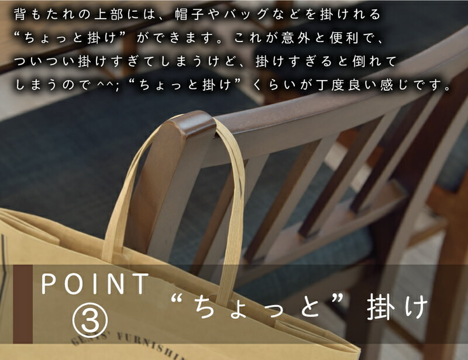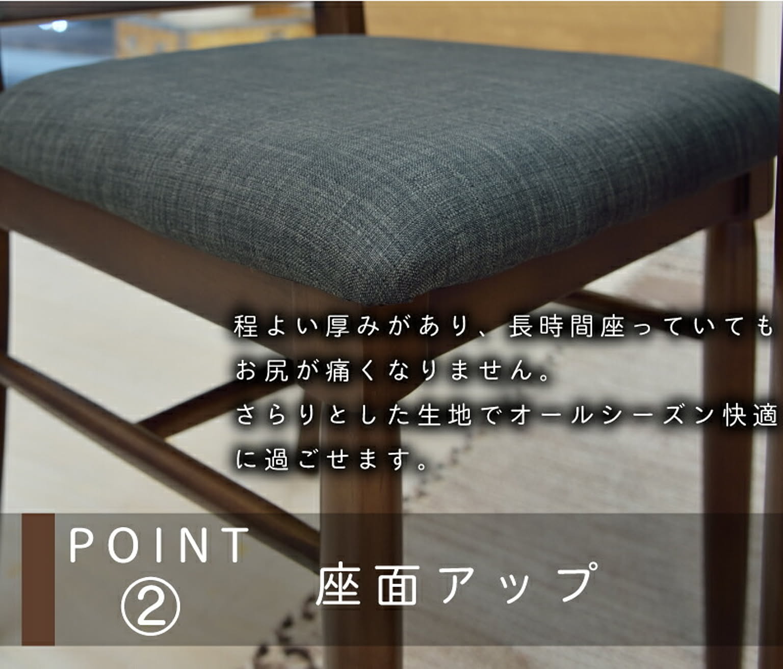 ■コンパクト幅120cmのダイニングテーブルに合わせて設計されたコンパクトなウッドチェア。■完成品完成品なので面倒な組立作業の手間をとらず、届いてすぐに使えます。■背もたれに工夫背もたれのゆるやかなカーブが背中にフィットして、コンパクトなチェアだけど長時間座っていても疲れにくい設計になっています。■座面程よい厚みがあり、長時間座っていてもお尻が痛くなりません。さらりとした生地でオールシーズン快適に過ごせます。■背もたれ上部背もたれの上部には、帽子やバッグなどを掛けれる"ちょっと掛け"ができます。これが意外と便利で、ついつい掛けすぎてしまうけど、掛け過ぎると倒れてしまうので・・・^^;”ちょっと掛け”くらいが丁度よい感じです。