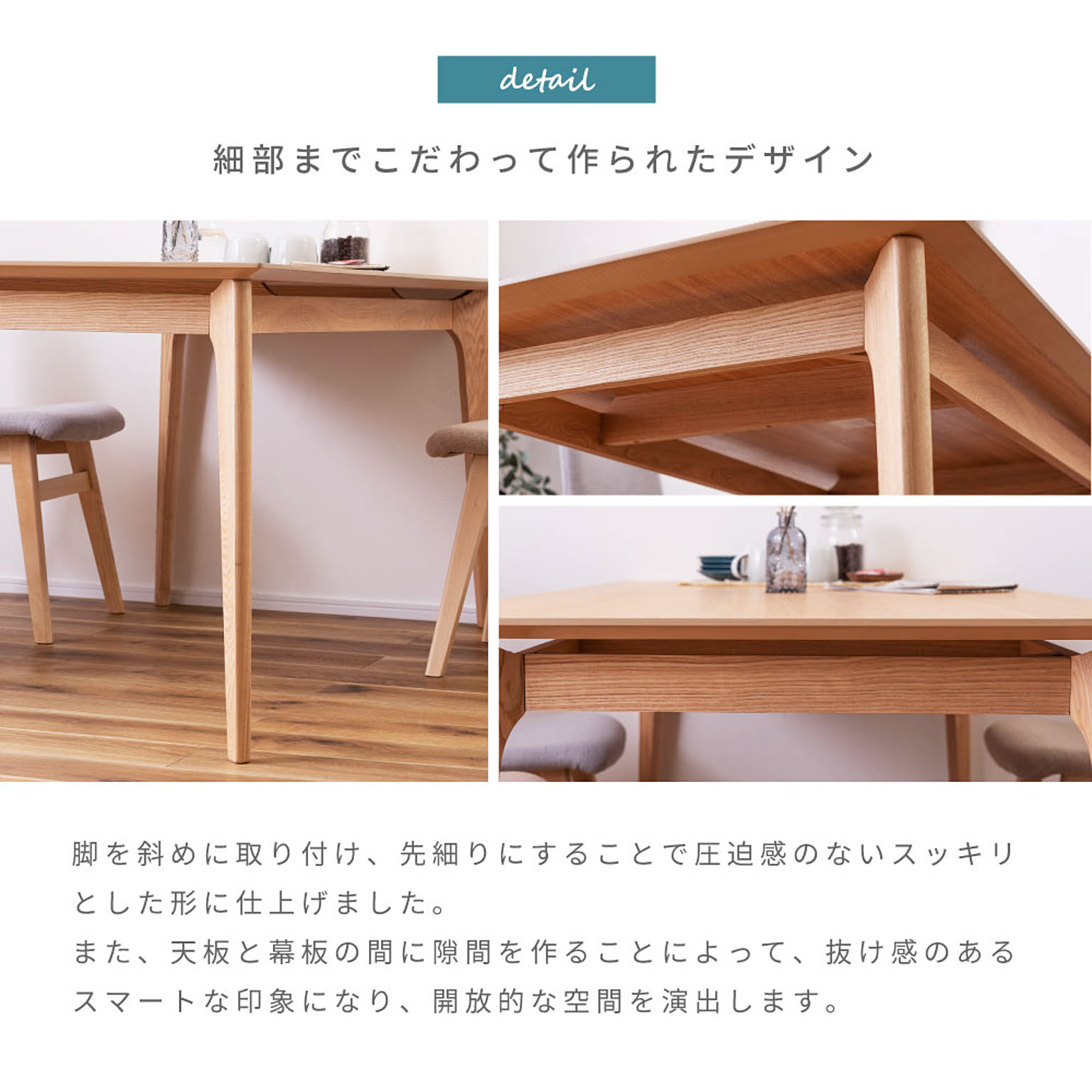 また、天板と幕板の間に隙間を作ることによって、抜け感のあるスマートな印象になり、開放的な空間を演出します。
