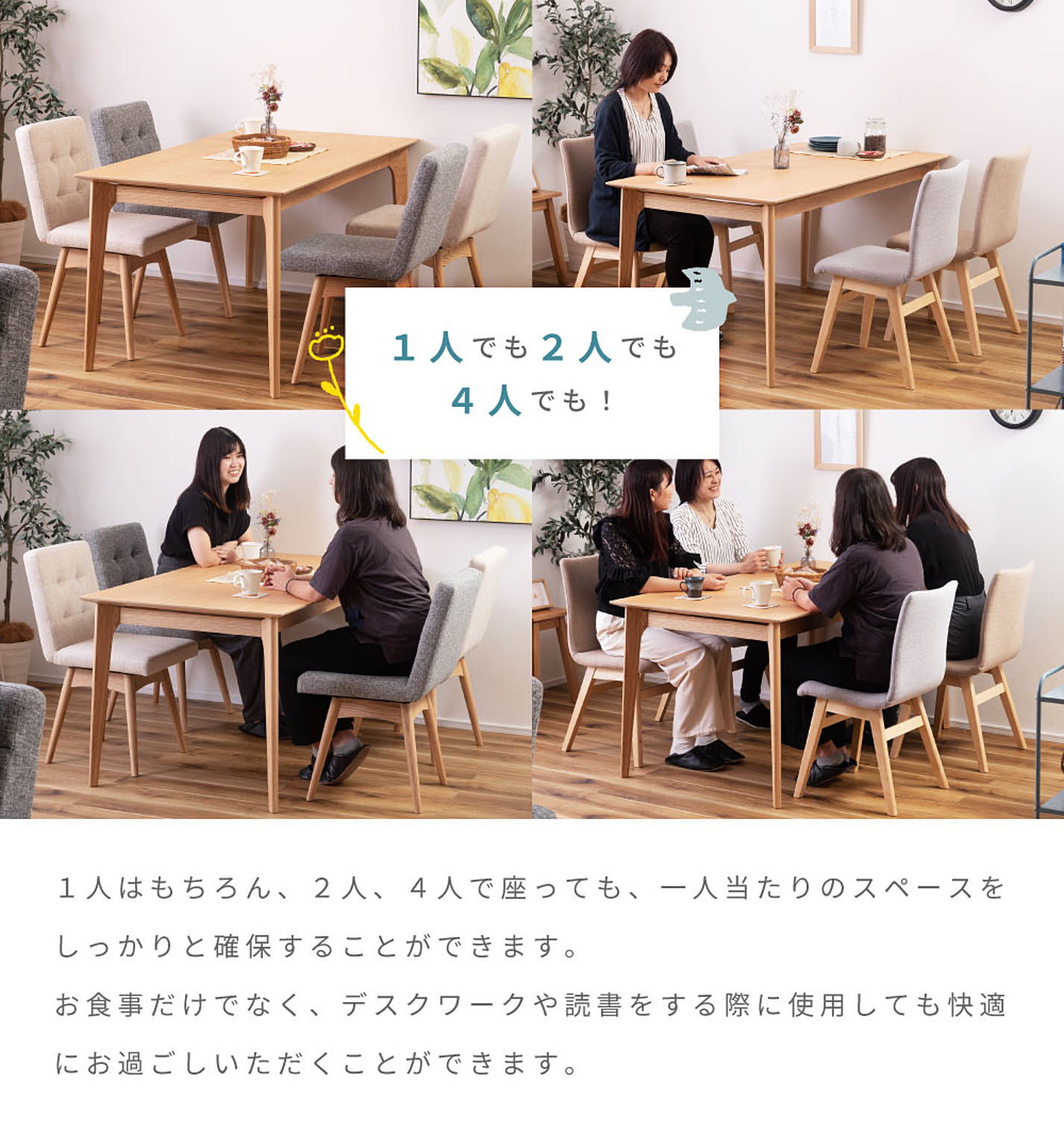 1人はもちろん、2人、4人で座っても、一人当たりのスペースをしっかりと確保することができます。